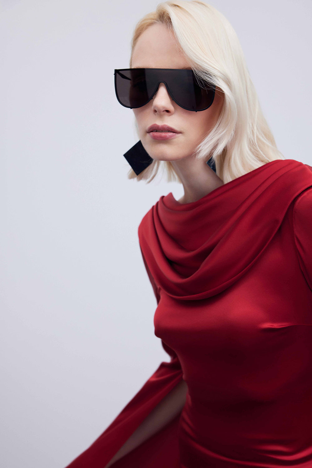 Agnes elbisesi, kırmızı ipeğin ışıltılı yansımasıyla öne çıkan, hem akışkan hem de güçlü bir siluete sahiptir.