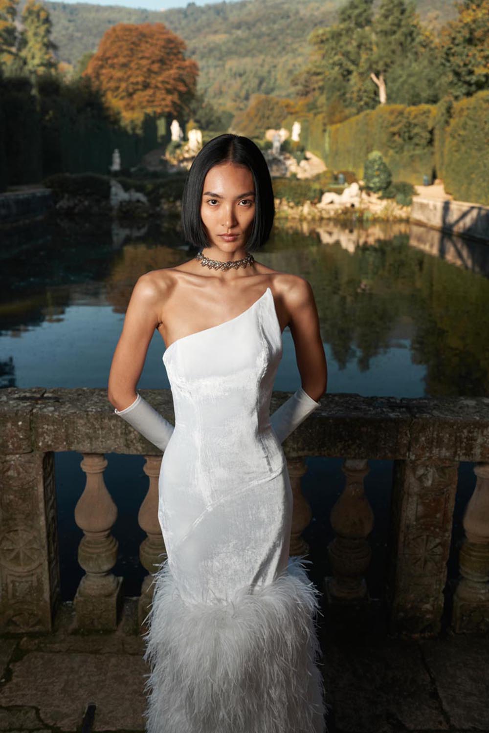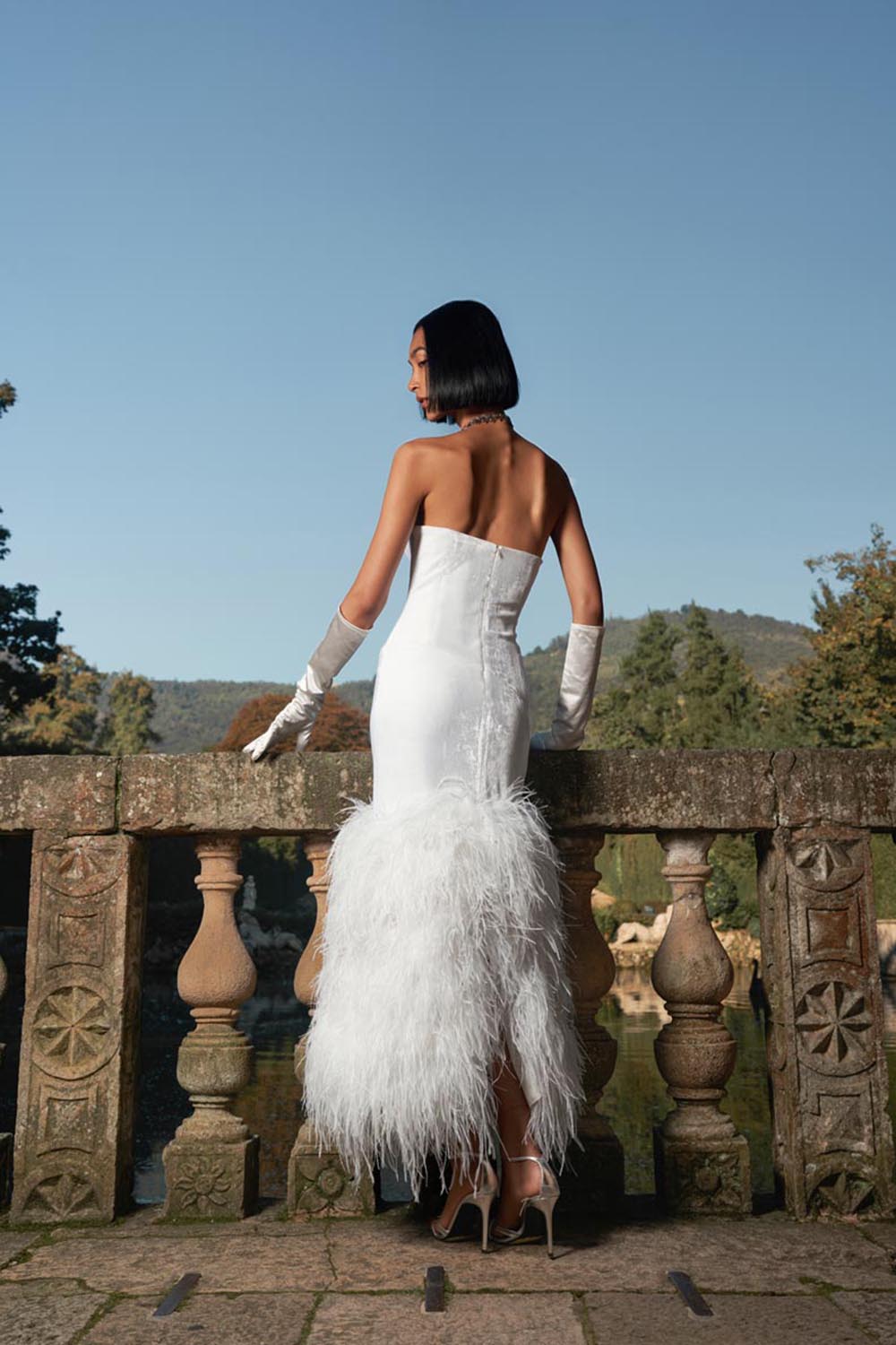Işığı yansıtan beyaz ipek-viskon kadife kumaştan üretilmiş olup, eteğinde kullanılan %100 deve kuşu tüyü detayıyla yumuşak bir hacim ve zarif bir hareket kazandırır.