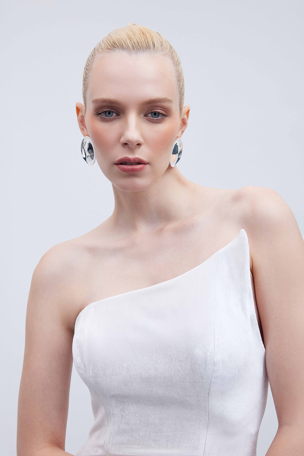 Eden elbisesi, asimetrik ön tasarımıyla modern zarafeti heykelsi bir yorumla buluşturur.