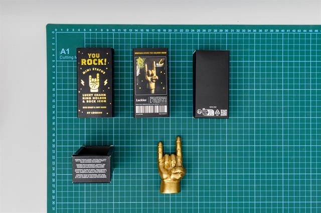 Rock selamı formunda tasarlanmış altın renkli mini heykel. Masa aksesuarı ve dekoratif obje olarak kullanılabilir. Kompakt boyutu sayesinde masa, raf ve çalışma alanlarında rahatlıkla konumlandırılabilir.
