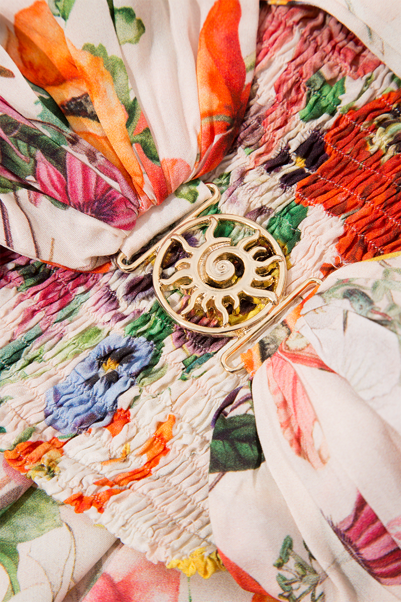 Whimsy Top, neşeli çiçek desenleriyle süslenmiş yumuşak ekru zeminiyle yaz stilinizin en eğlenceli parçası olmaya aday. Çiçek tasarımı doğadan bir dokunuş katarken, fırfırlar ve eğlenceli detaylar yaz neşesi yaratarak maceralı yaz günleri için ideal bir seçimi oluşturuyor.