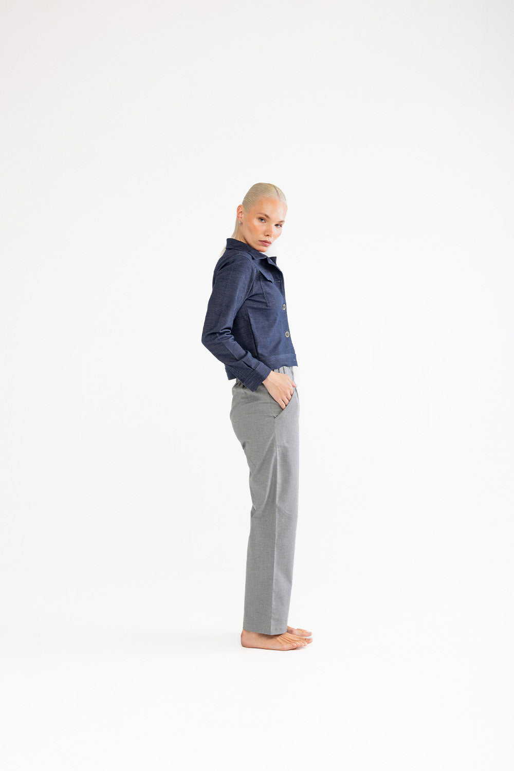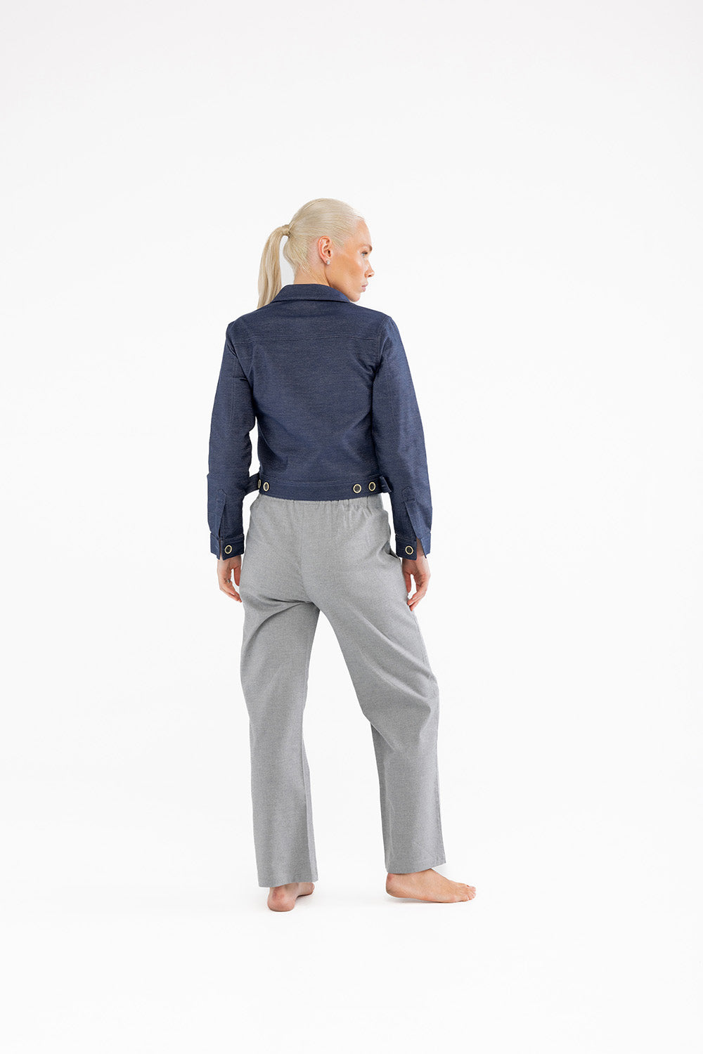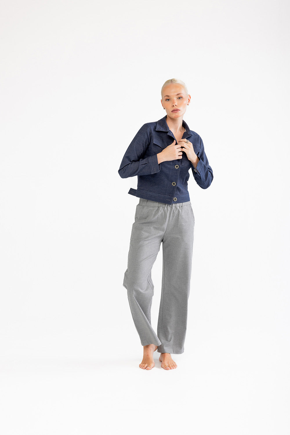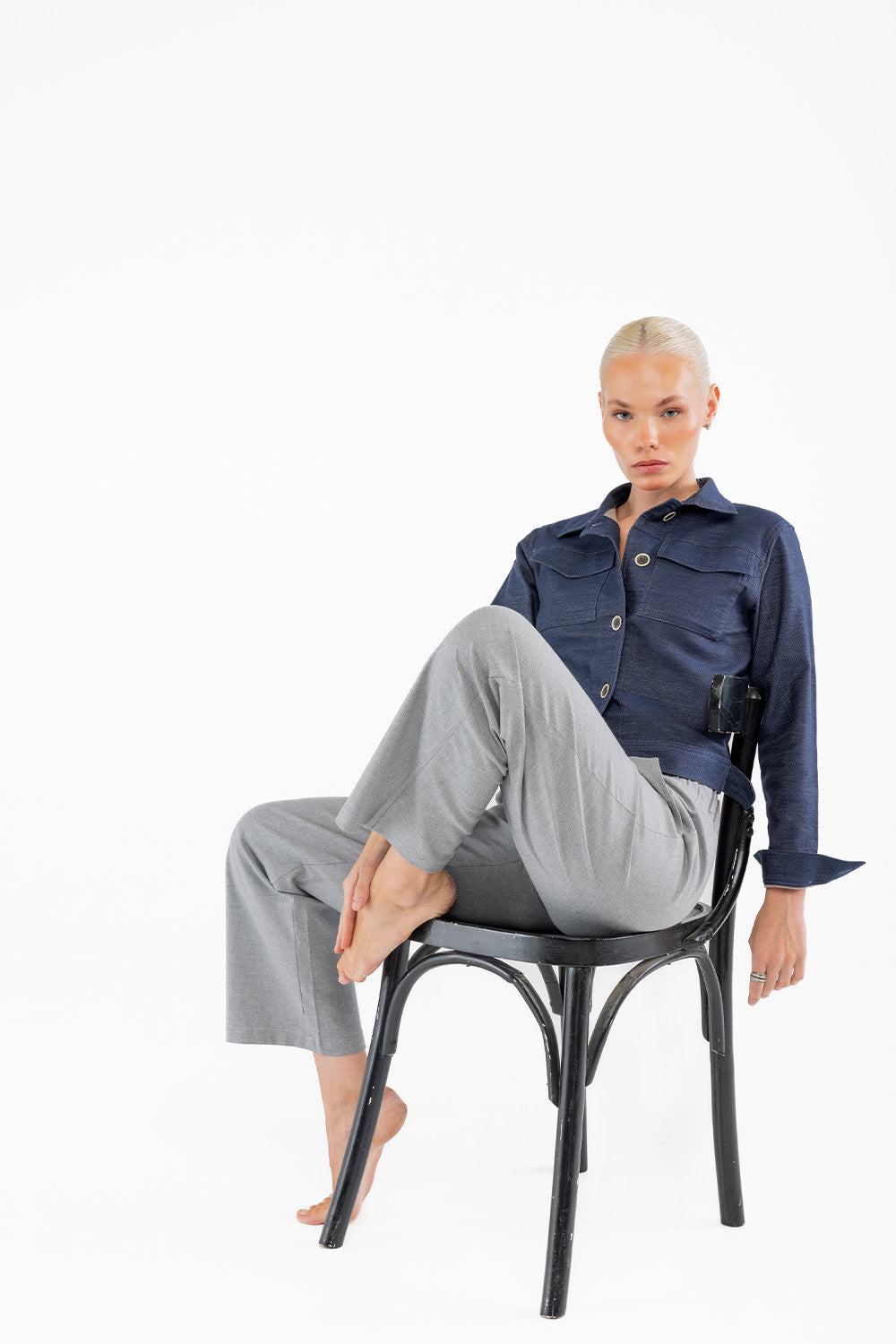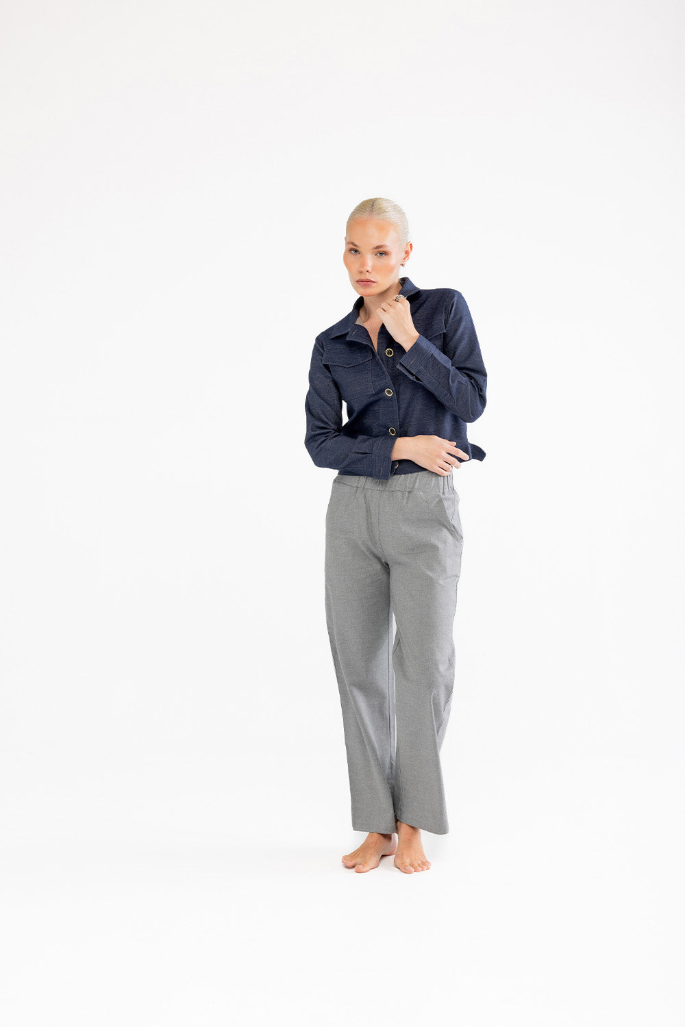 Doğal melanj dokusuyla yumuşak bir doku ve sade bir zarafet sunar. Bu pantolon, lastikli beli sayesinde konforu ön plana çıkarırken, geniş düz paça kesimiyle dengeli bir duruş sağlar. Melanj gri tonu, gündelik şehir stilinden hafta sonu kombinlerine kadar her ortamda doğal bir şıklık yaratır.
