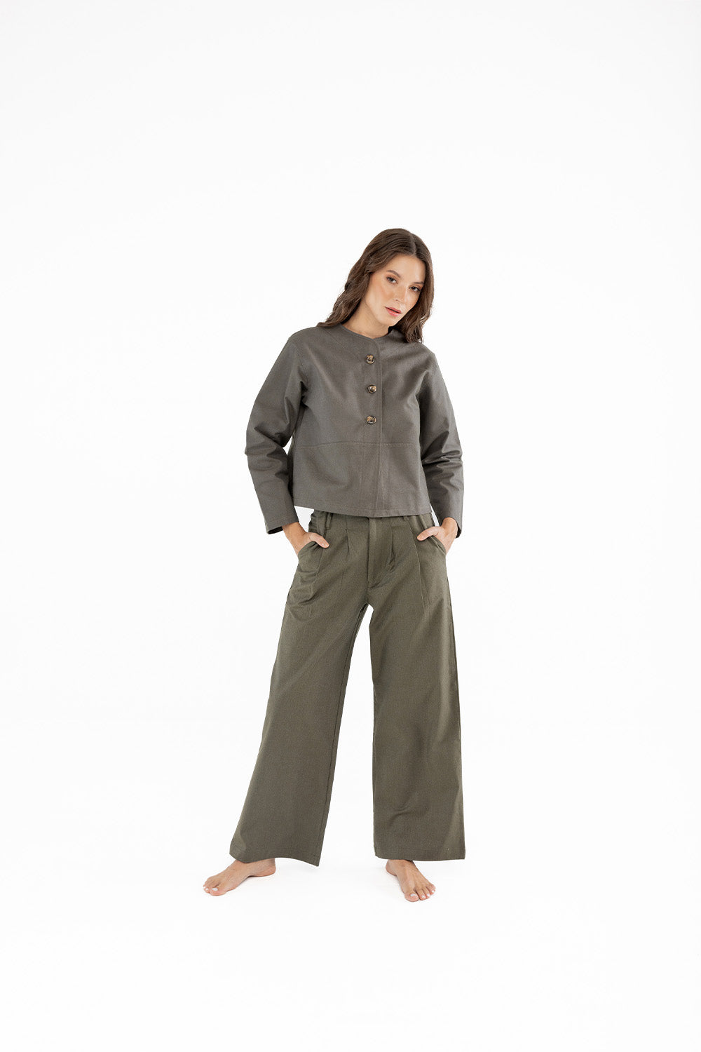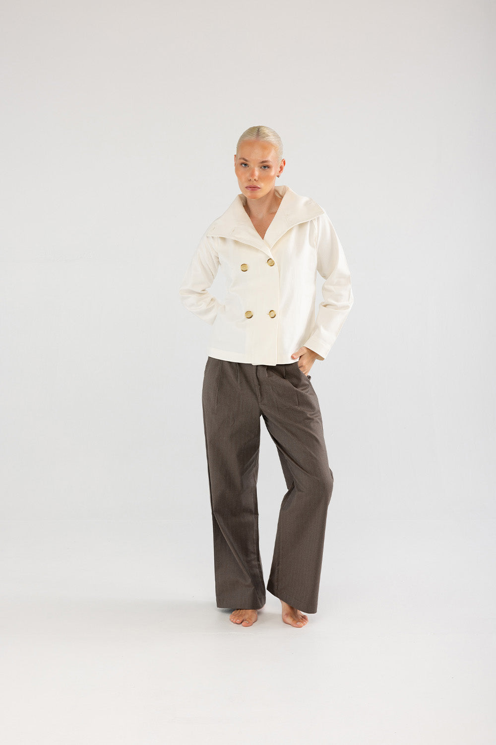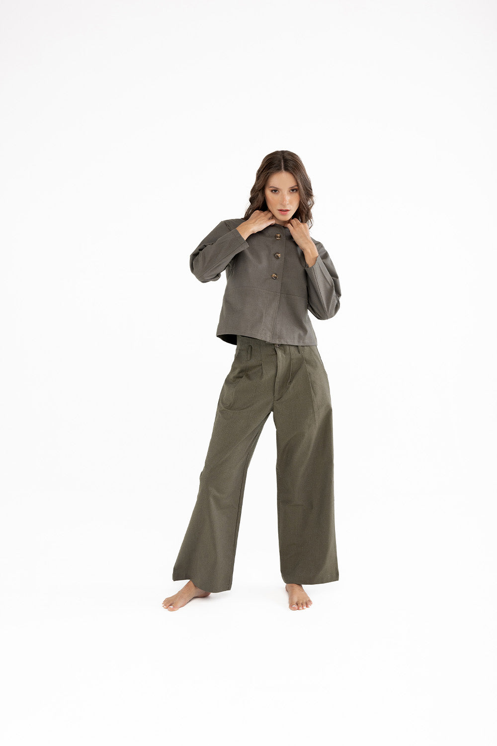 Doğal tonların sıcaklığıyla sade bir şıklık sunan bu pantolon, kahverengi pamuk dokusuyla gardırobun zamansız parçalarından biridir. Geniş paça formu konforlu bir siluet yaratırken, yüksek bel hattı vücuda zarif bir denge kazandırır. Mat yüzeyli kumaşı sayesinde gün boyu rahatlık ve doğal bir görünüm sağlar.