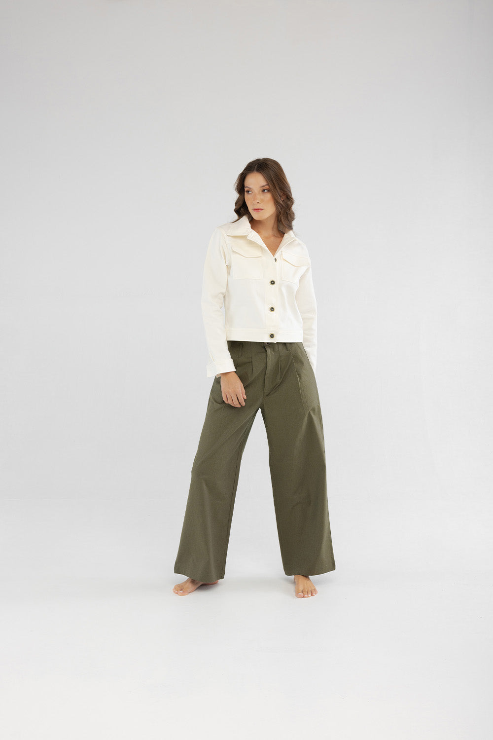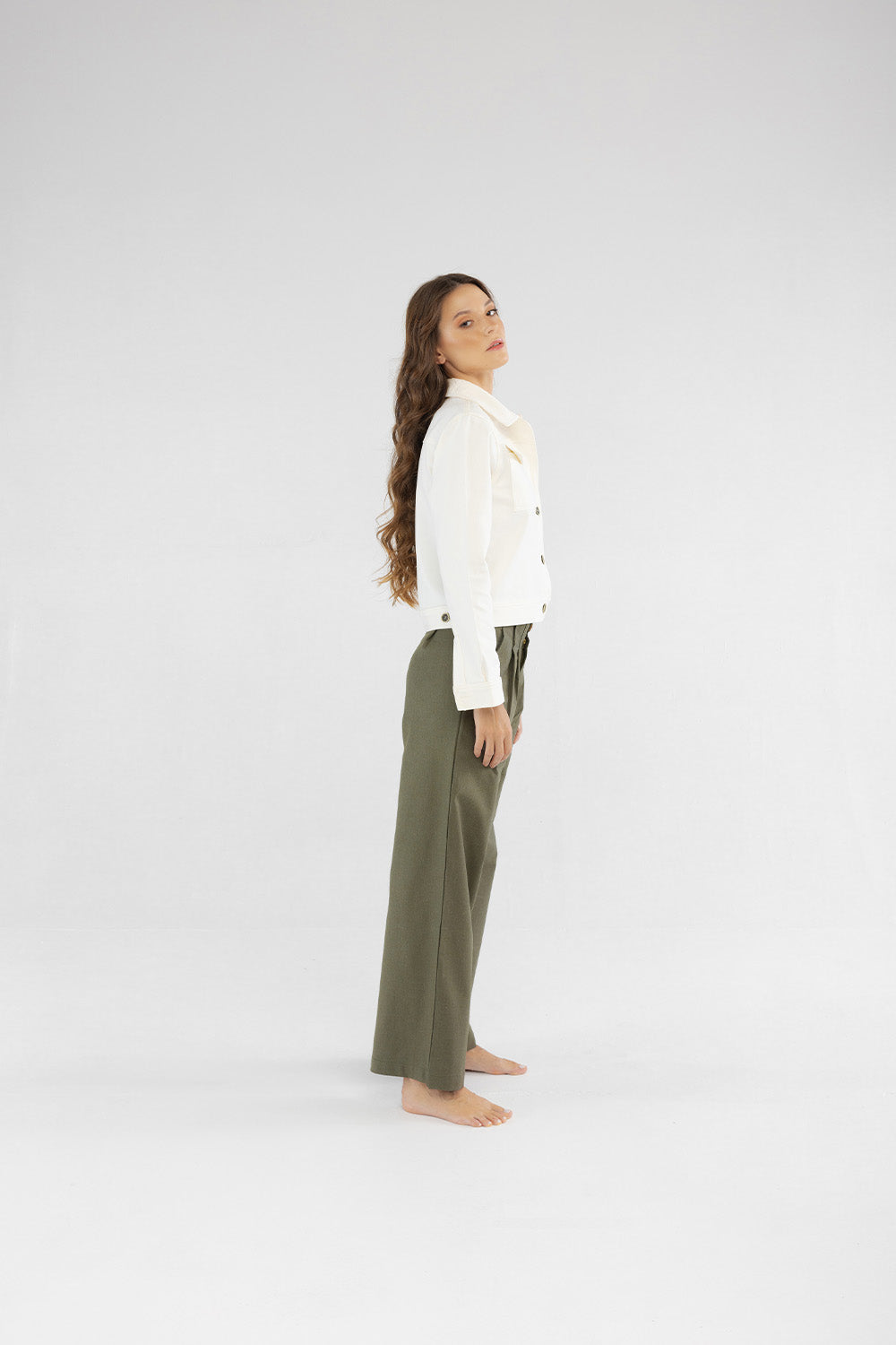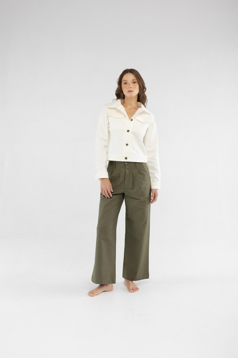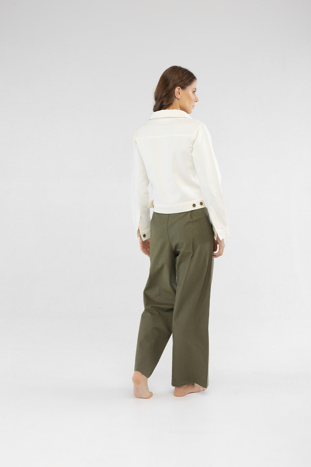 Klasik kot ceket formuna sahip bu model, denim yerine kullanılan hafif pamuk dokusuyla daha zarif bir görünüm sunar. Krem tonunun doğal yumuşaklığıyla sade ama güçlü bir duruşa sahiptir. Formunu koruyan kumaşı sayesinde düzenli bir siluet yaratırken, gün boyu konforlu bir kullanım sağlar. Mevsim geçişlerinde veya şehirde katmanlı kombinlerde zahmetsiz bir tamamlayıcıdır.