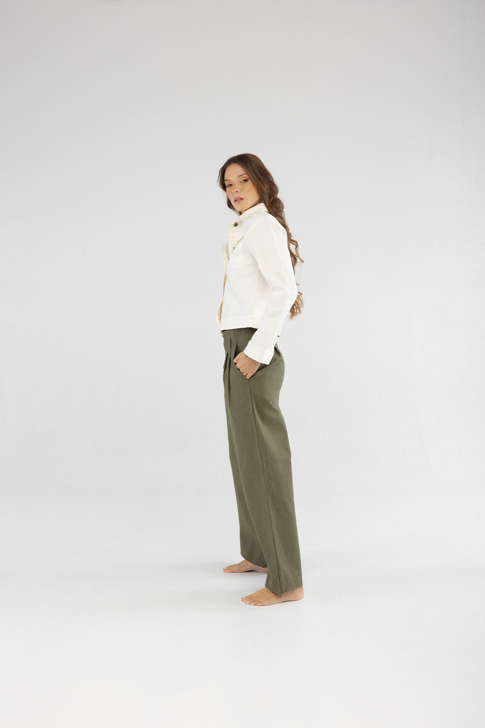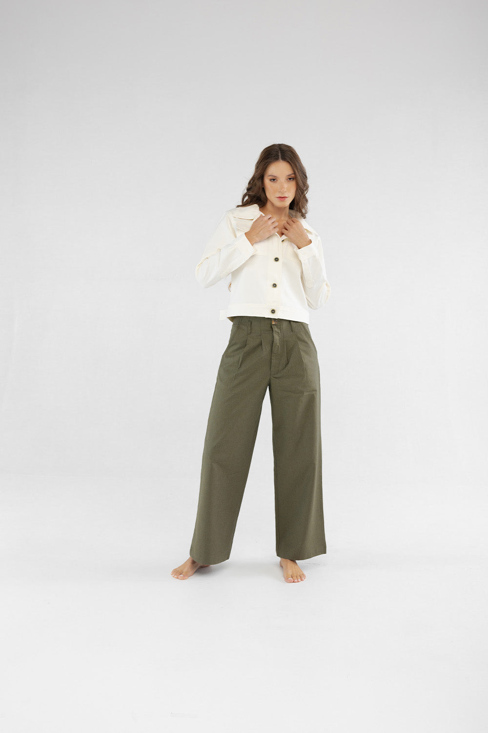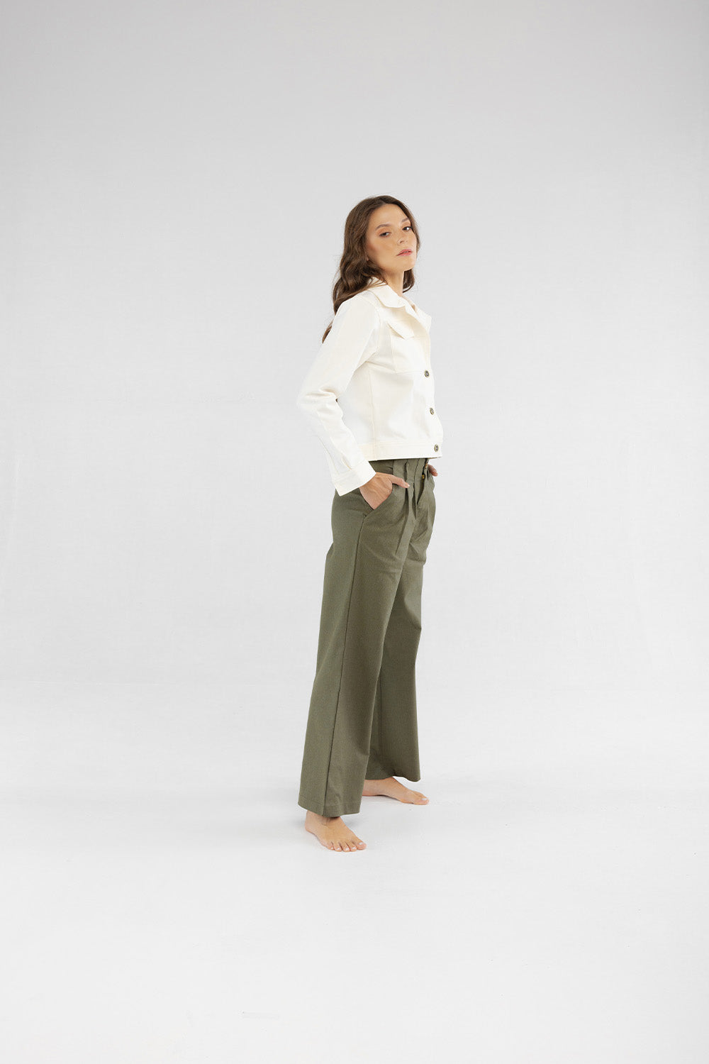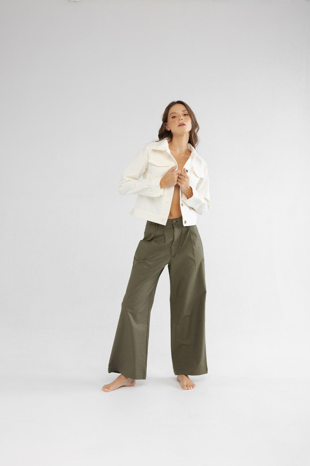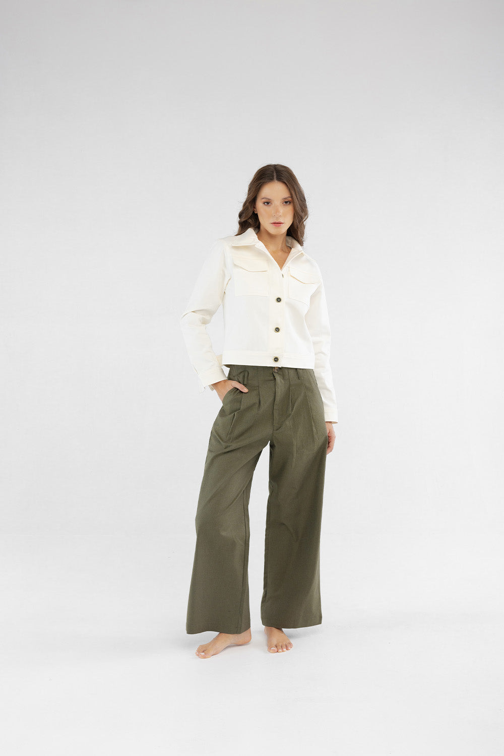 Klasik kot ceket formuna sahip bu model, denim yerine kullanılan hafif pamuk dokusuyla daha zarif bir görünüm sunar. Krem tonunun doğal yumuşaklığıyla sade ama güçlü bir duruşa sahiptir. Formunu koruyan kumaşı sayesinde düzenli bir siluet yaratırken, gün boyu konforlu bir kullanım sağlar. Mevsim geçişlerinde veya şehirde katmanlı kombinlerde zahmetsiz bir tamamlayıcıdır.