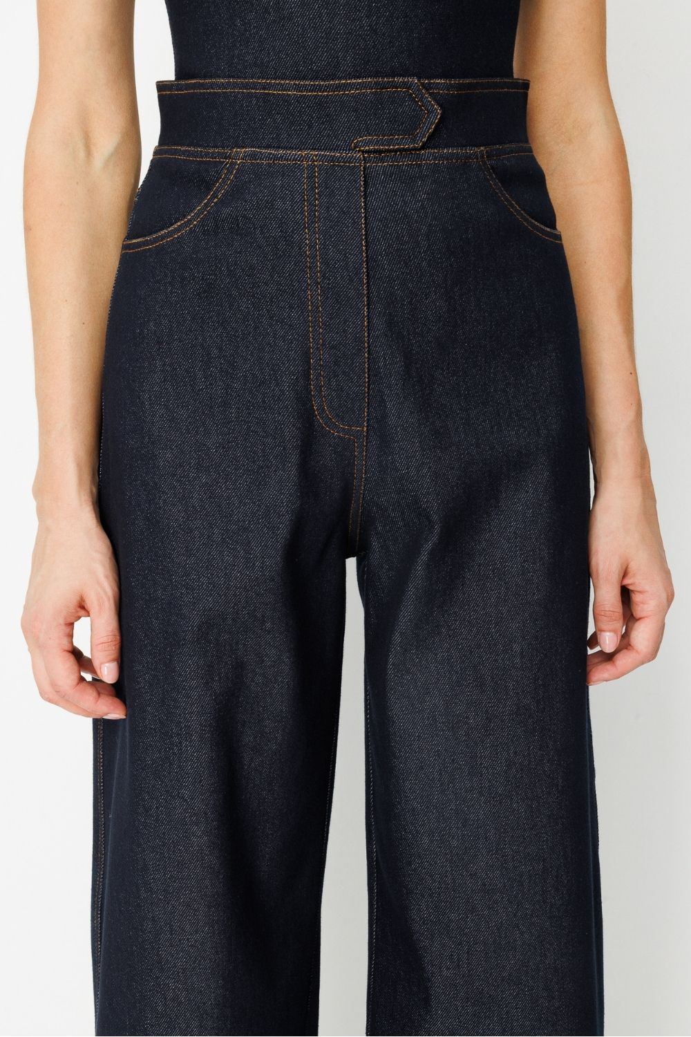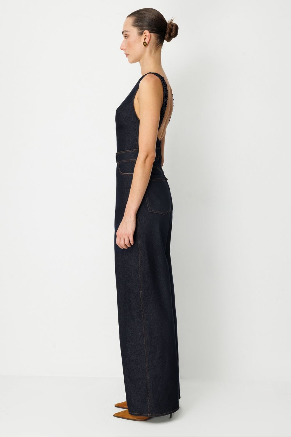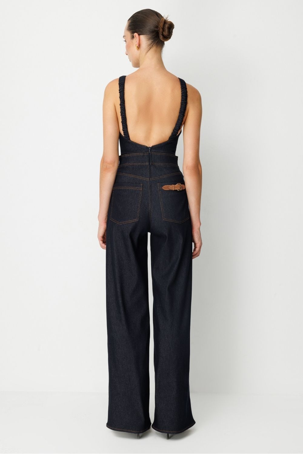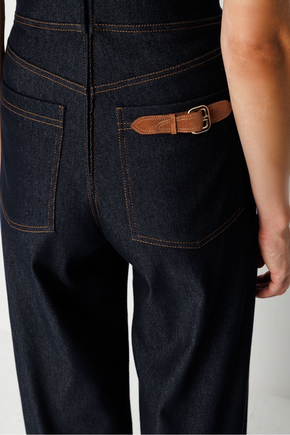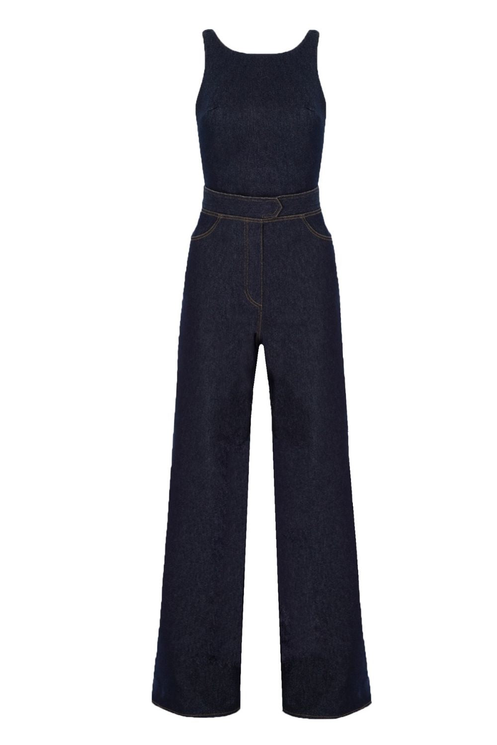 Zamansız şıklığı modern bir kesimle buluşturan bu denim tulum, minimalist çizgileriyle öne çıkıyor.Denim kumaşı sayesinde hem günlük kullanım hem de özel davetler için uygun çok yönlü bir parça. Sade, bisiklet yaka, yuvarlak yakalı üst kısım. Dikiş detaylarıyla ön plana çıkan vücuda oturan üst gövde formu. Yüksek bel kesimiyle beli vurgulayan ve bacak boyunu uzun gösteren siluet. Önde fermuar veya düğme detayı görünmez şekilde gizlenmiş, temiz bir görünüm sunar. Kalın, ribana benzeri elastik sırt askıları, sırtta kesik bir form yaratır ve hareket özgürlüğü sağlar. Arkada yer alan iki klasik ceple işlevsellik kazandırılmıştır. Sağ arka cep üstünde süet kemer detayı ve altın kaplama kemer tokasıyla şık bir aksesuar detayı yer alır. Bel hizasındaki yatay dikiş çizgileri, vücut formunu dengeler.
