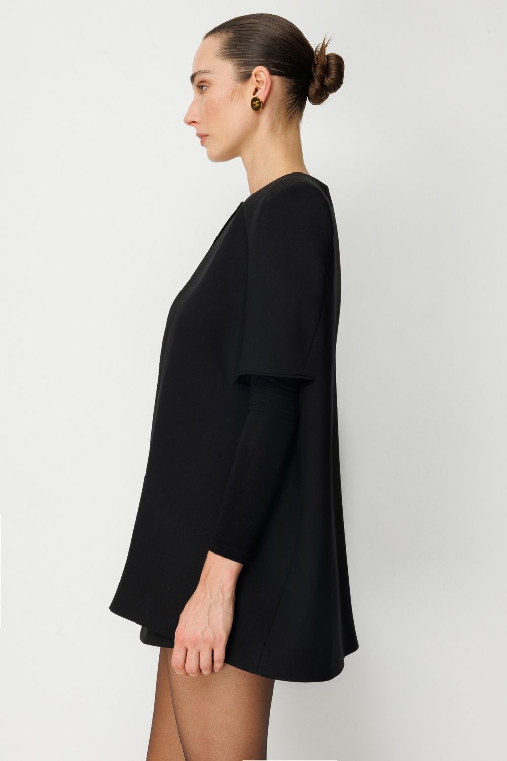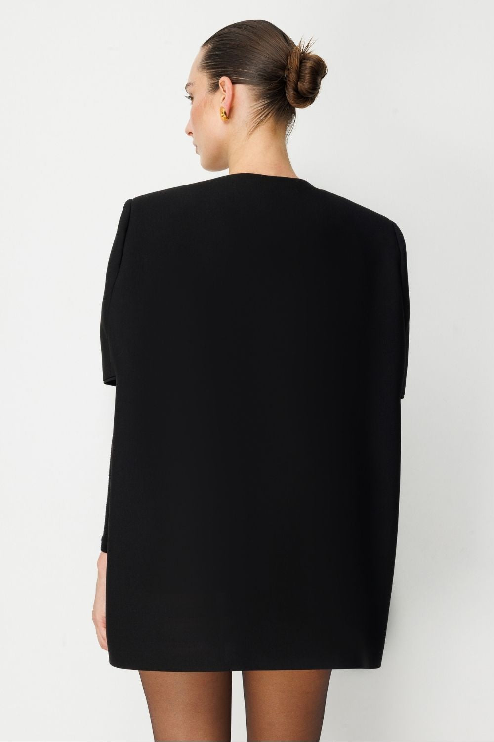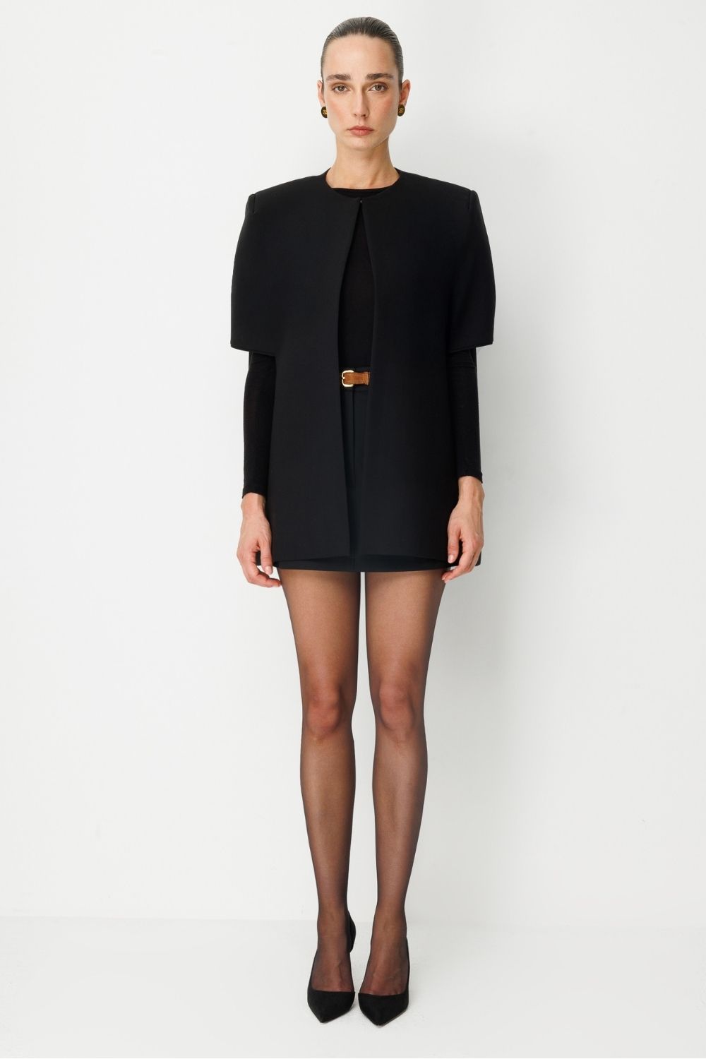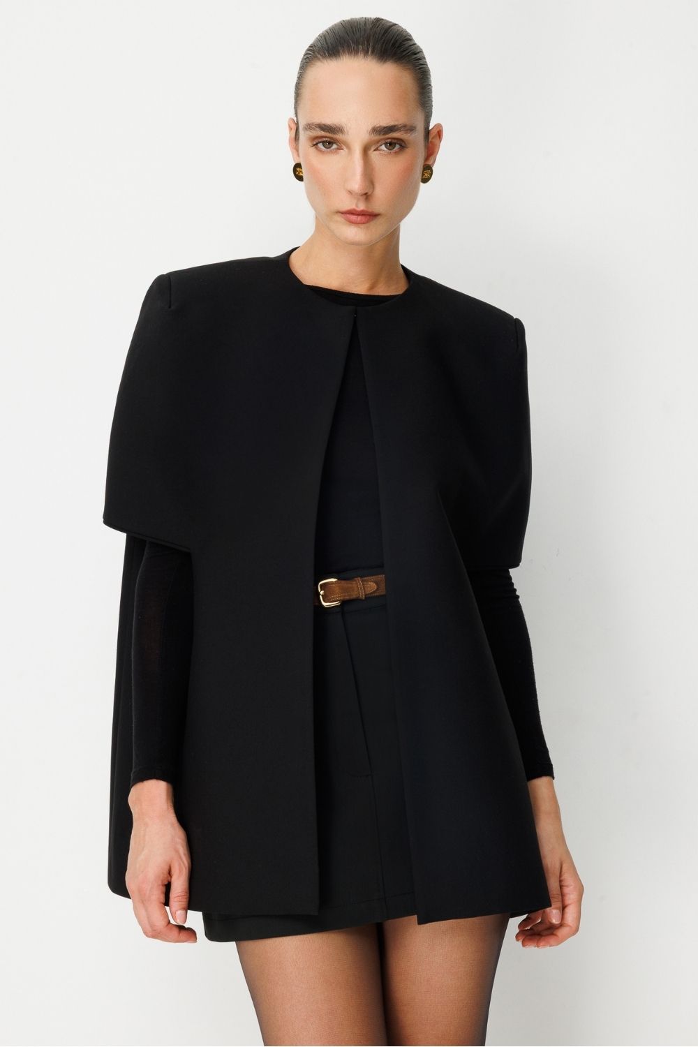 Modern silueti klasik detaylarla buluşturan pelerin ceket, zamansız şıklığın güçlü bir temsilcisi. Kolsuz yapısı ve düz kesimiyle sade bir görünüm sunarken, omuzlarındaki vatka detayı feminen bir zarafet yaratır. Ön kısmındaki açık form, hareket özgürlüğü sağlar. Yırtmaç görünümündeki kollar sayesinde dinamik ve özgün bir stil elde edilir.Hem şehir hayatına hem de özel davetlere uyarlanabilecek bu parça, minimalizmi güçlü detaylarla harmanlayan stil sahibi kadınlar için tasarlandı.