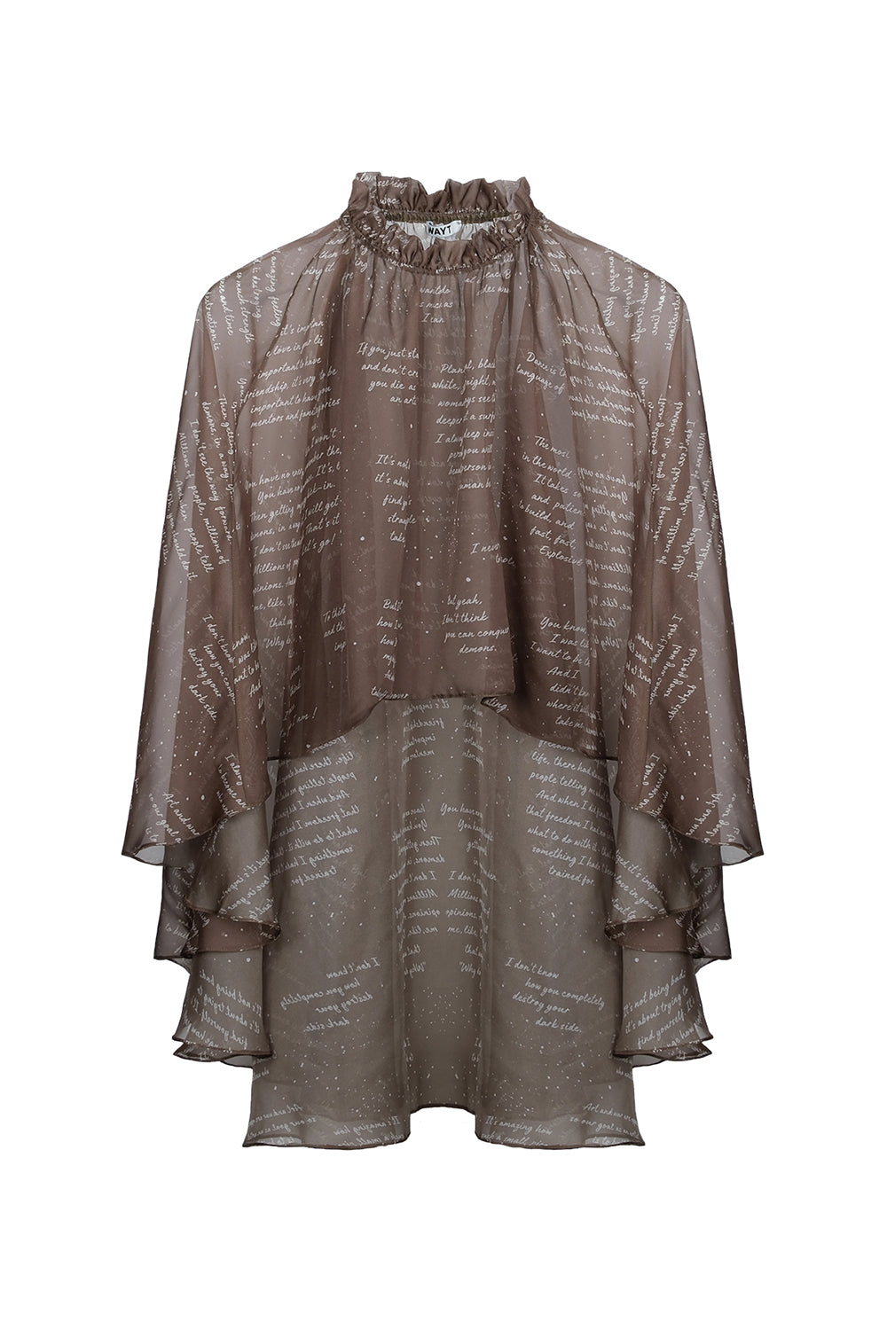 Duygusal ağırlığın ve içsel çatışmanın sessizce açığa çıkışı. Confession, kırılgan bir gücün akışa karıştığı şiirsel bir itirafa dönüşür. Bedene yakın ya da katmanlı kullanımlarda dengede durur.Açıklama:Yüksek yakalı, pelerin formunda büzgülü bluzKoyu zeytin yeşili tonunda, ince transparan şifon kumaşTüm yüzeye yayılan el yazısı stilinde desenAkışkan pelerin siluetiBüzgülü ve lastikli mock yaka detayıÖnde kısa, arkada uzun asimetrik boyBakım:Nazikçe elde yıkayın. Kurutma makinesi kullanmayın. Düşük ısıda hafifçe buharlayın.Kumaş İçeriği:%100 Polyester