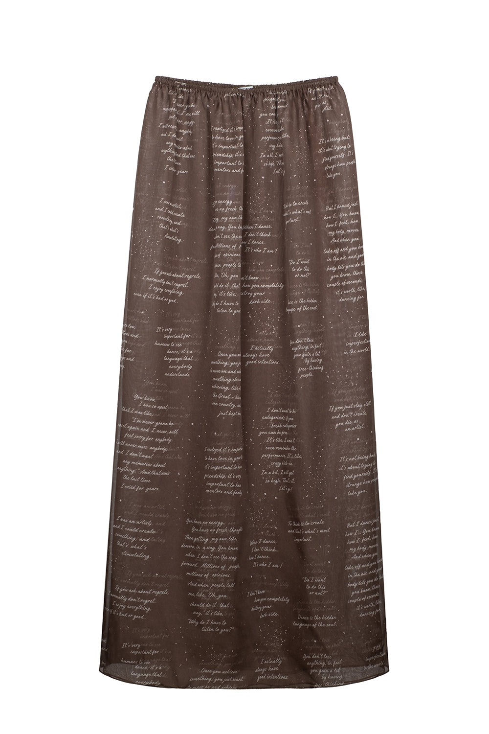 Açıklama:Büzgülü maxi etekKoyu zeytin yeşili tonunda, ince transparan şifon kumaşÇift katmanlı yapıTüm yüzeye yayılan el yazısı stilinde desenEsnek ve konforlu kullanım sunan lastikli belYere kadar uzanan, akışkan siluetBakım:Nazikçe elde yıkayın. Kurutma makinesi kullanmayın. Düşük ısıda hafifçe buharlayın.Kumaş İçeriği:%100 PolyesterTeslimat ve İade