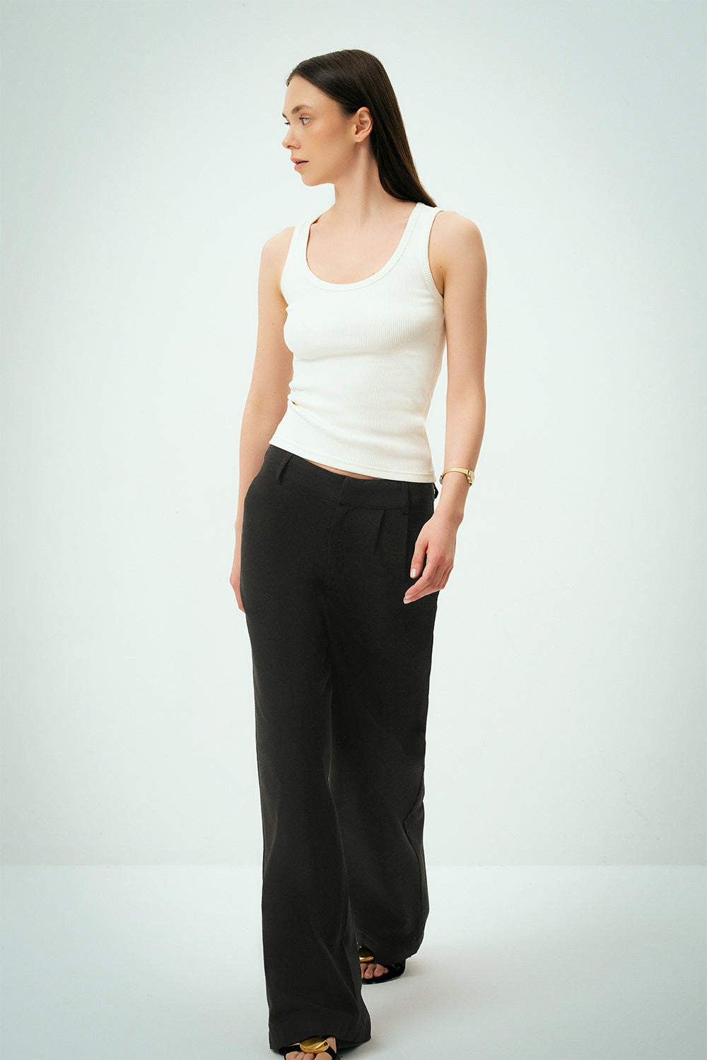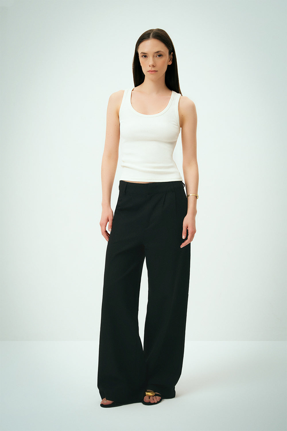 Noir Keten Pantolon, palazzo kalıbı ve doğal keten/viskon kumaş karışımıyla şıklığı ve konforu bir arada sunar.