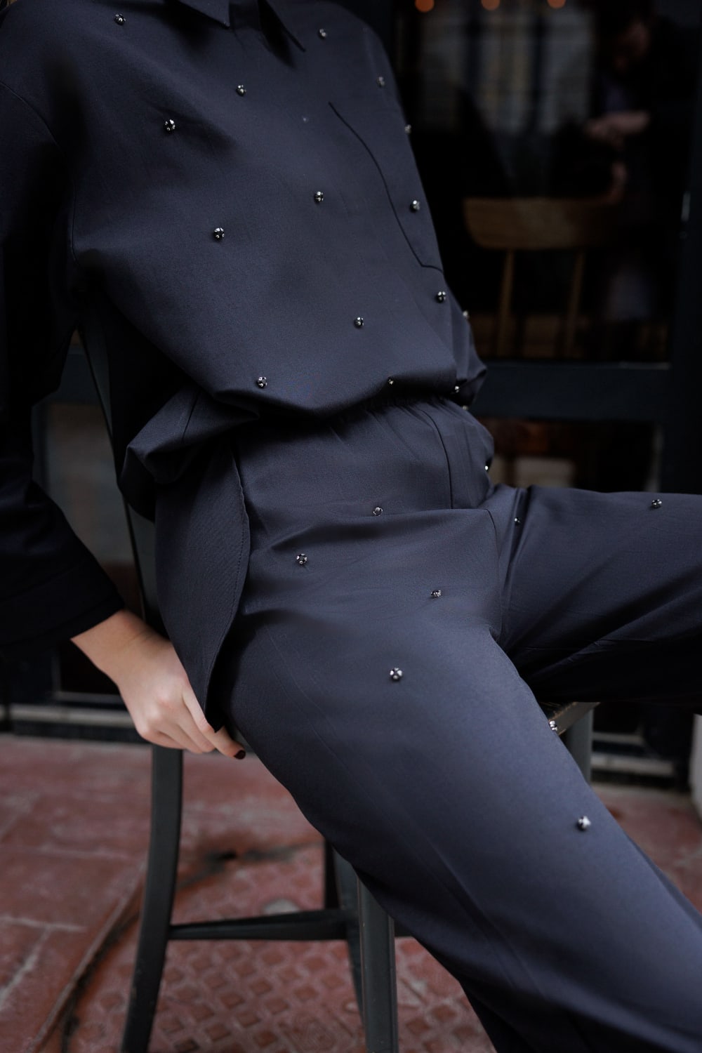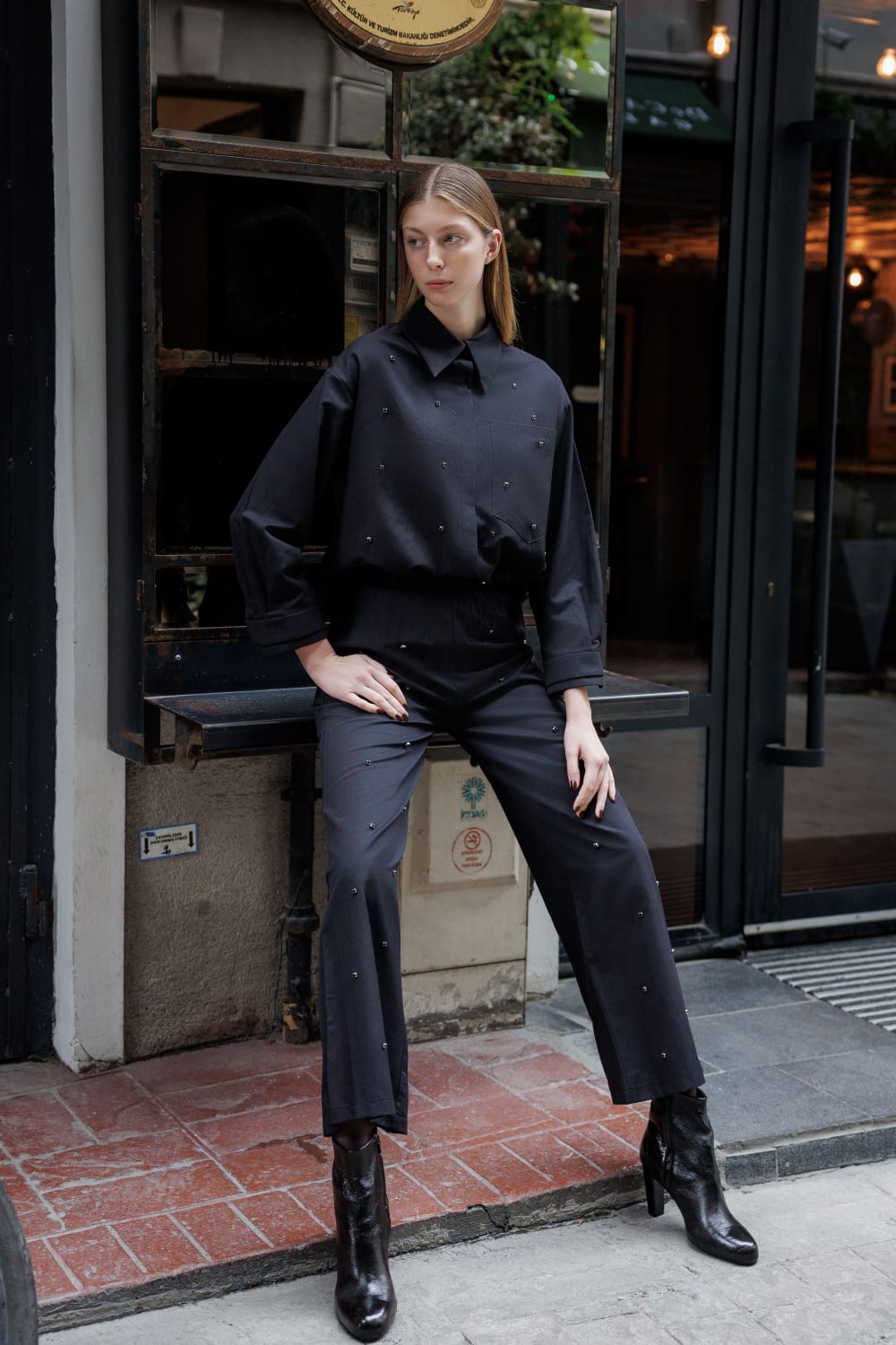 Taş İşlemeli Düz Kesim Siyah Rahat Pantolon