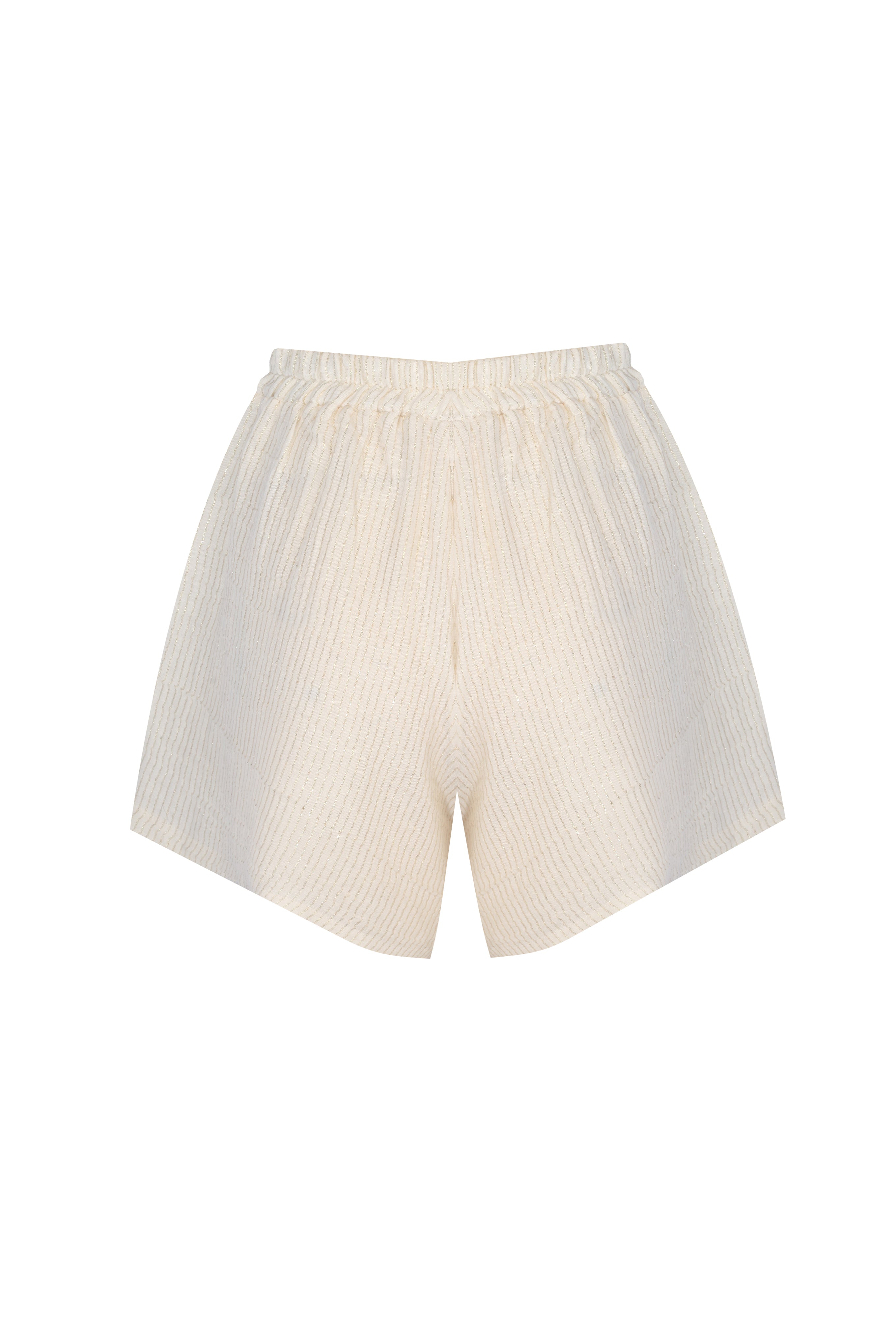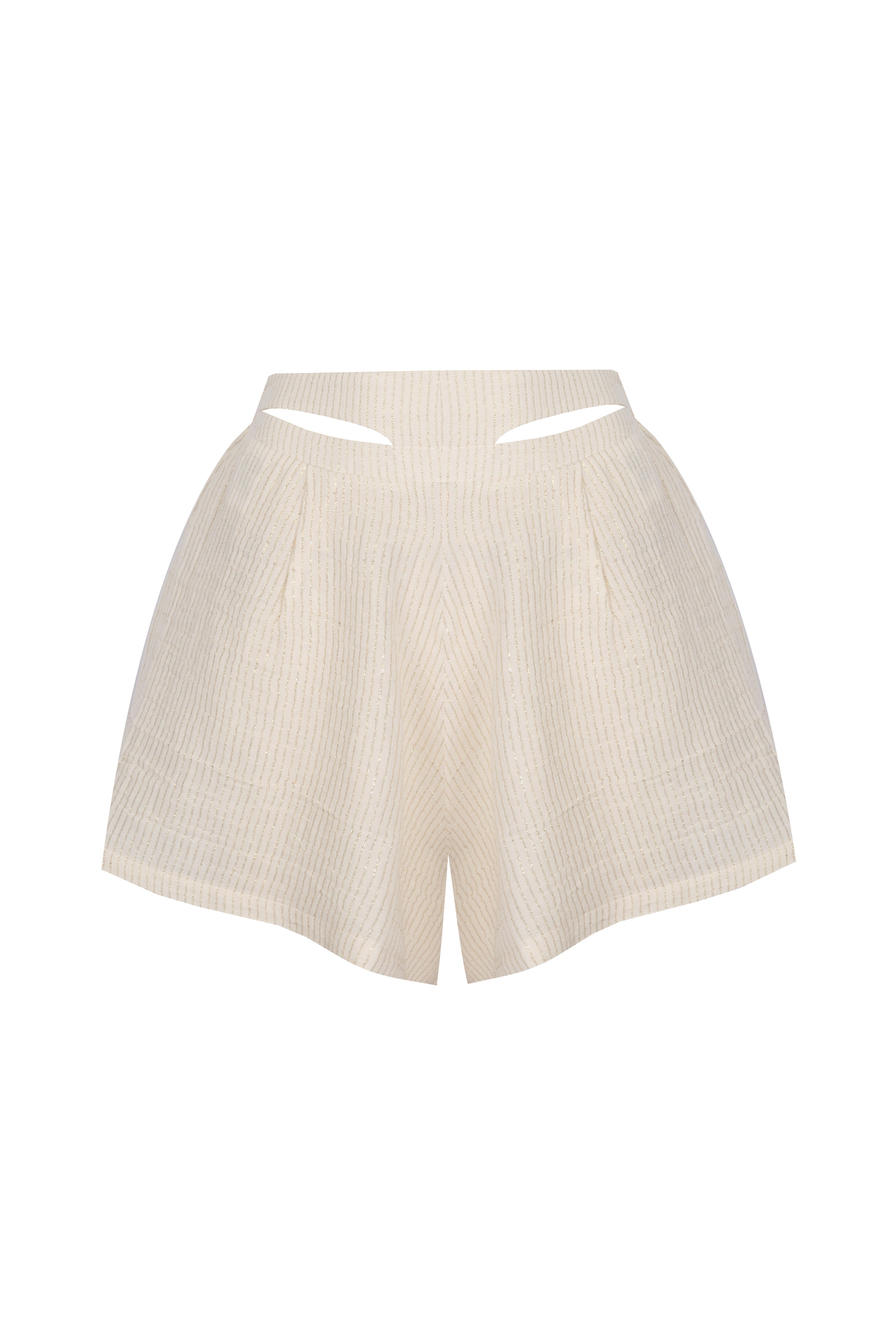 Beli lastikli, cut out detaylı, kendinden simli çizgili kumaş, standart beden short.