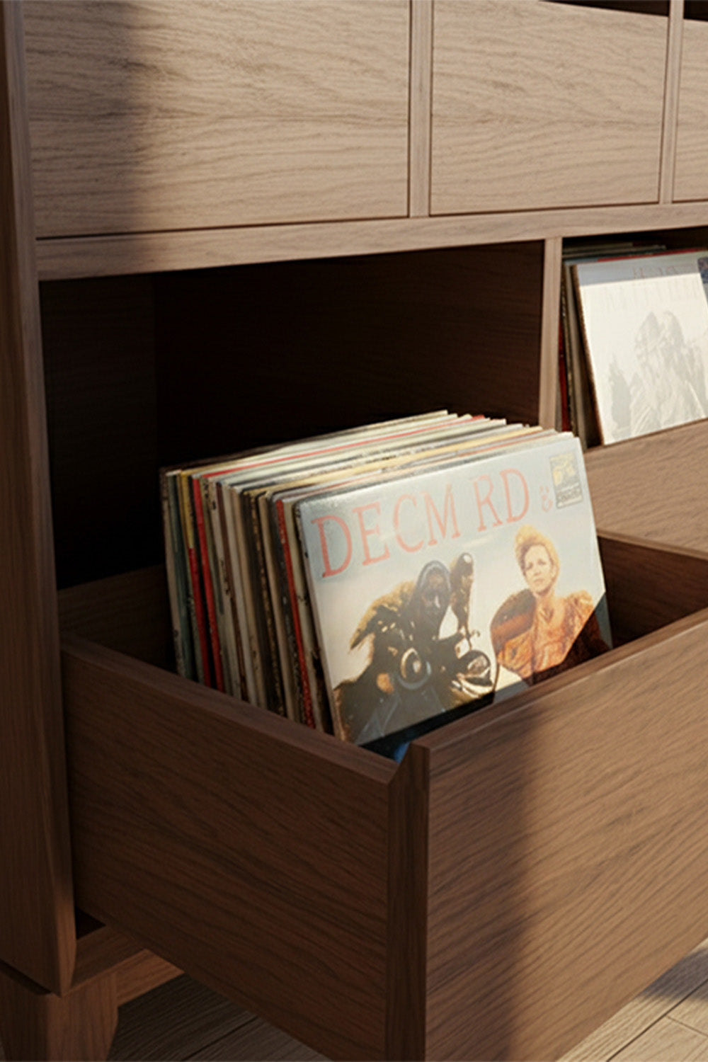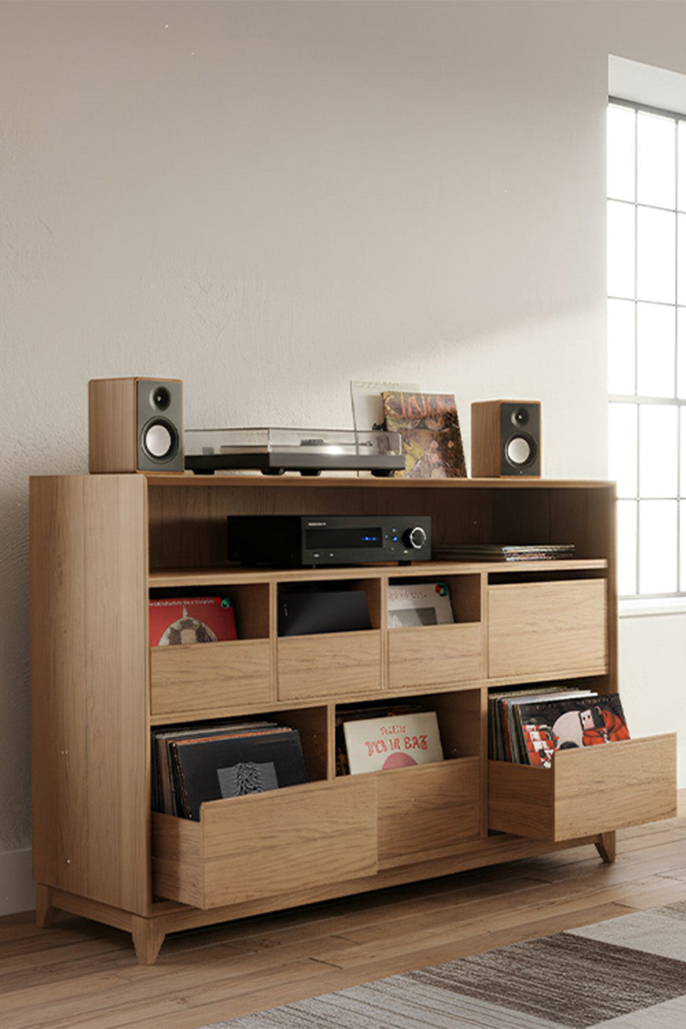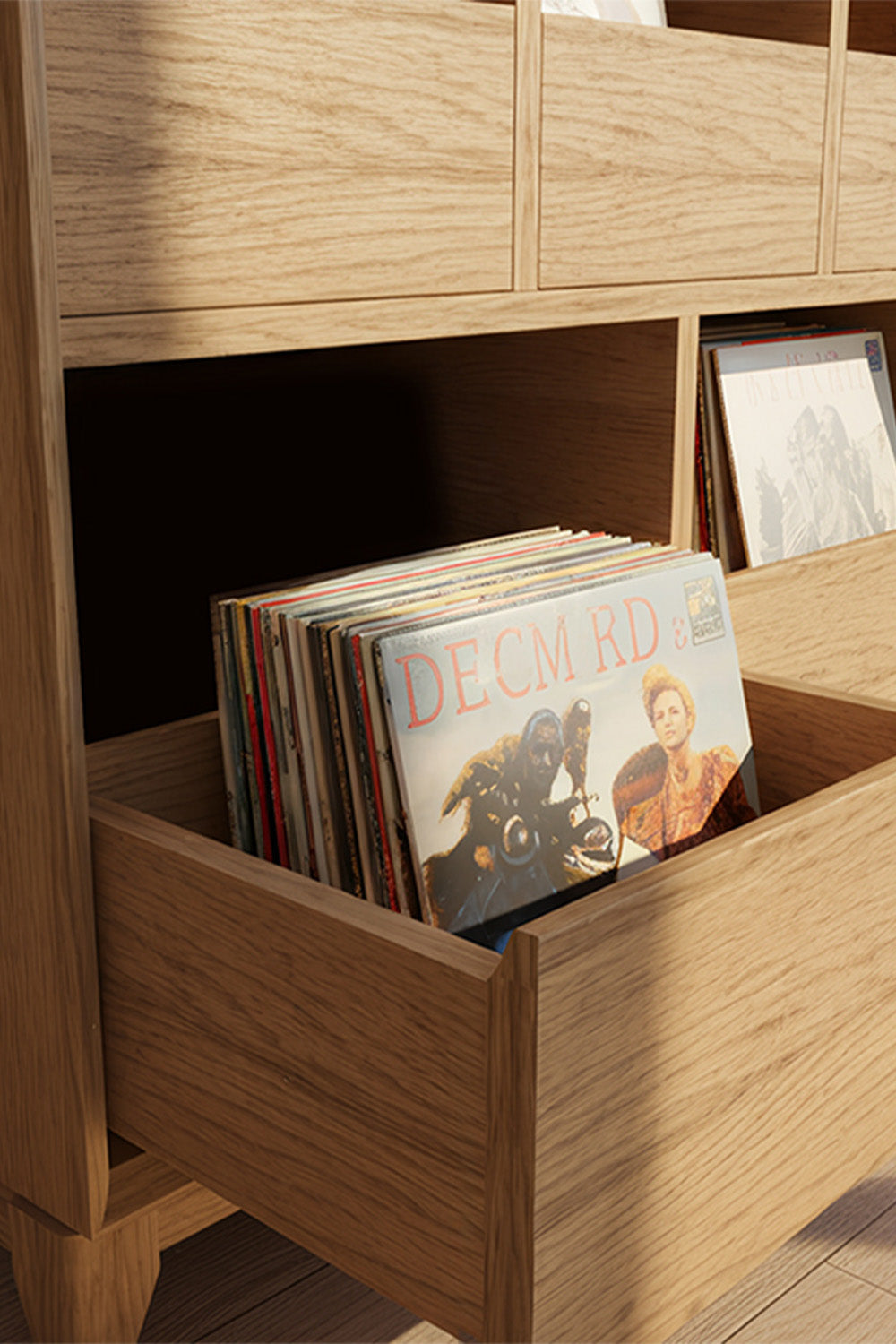 Viny M Plak Dolabı, plak koleksiyonunuzu şık ve düzenli şekilde sergilemeniz için üretildi. Çekmeceleri, plaklarınıza kolayca erişebilmenizi sağlarken zarar görmelerini de engellemek, rafları ise müzik sisteminiz ve aksesuarlarınız için ideal alan sunmak için tasarlandı. Zamansız tasarımıyla her ortama uyum sağlayan Viny, Masif ahşabın sıcak dokusunu ve analog sesin büyüsünü bir araya getiriyor.