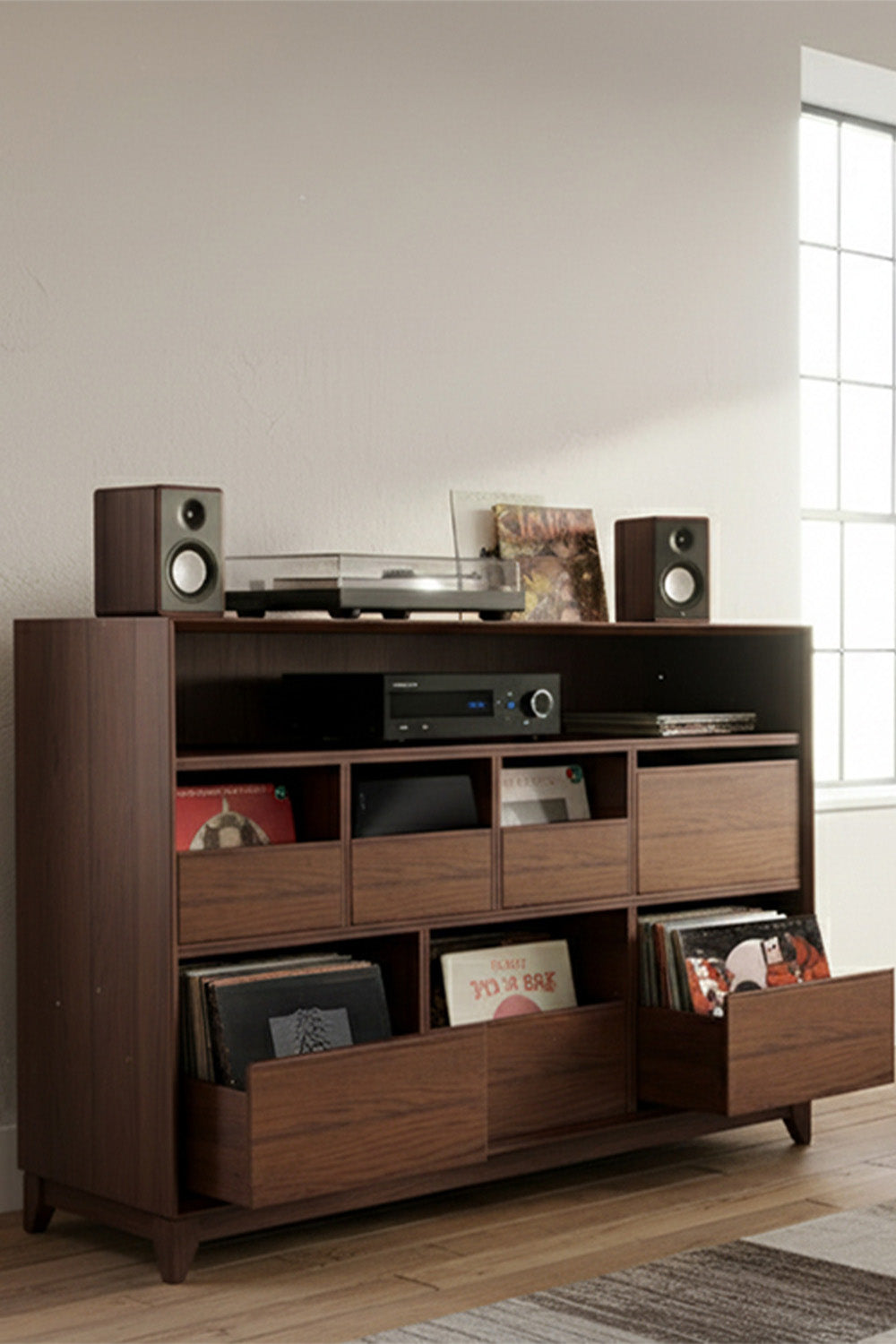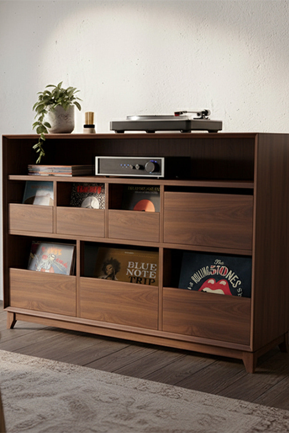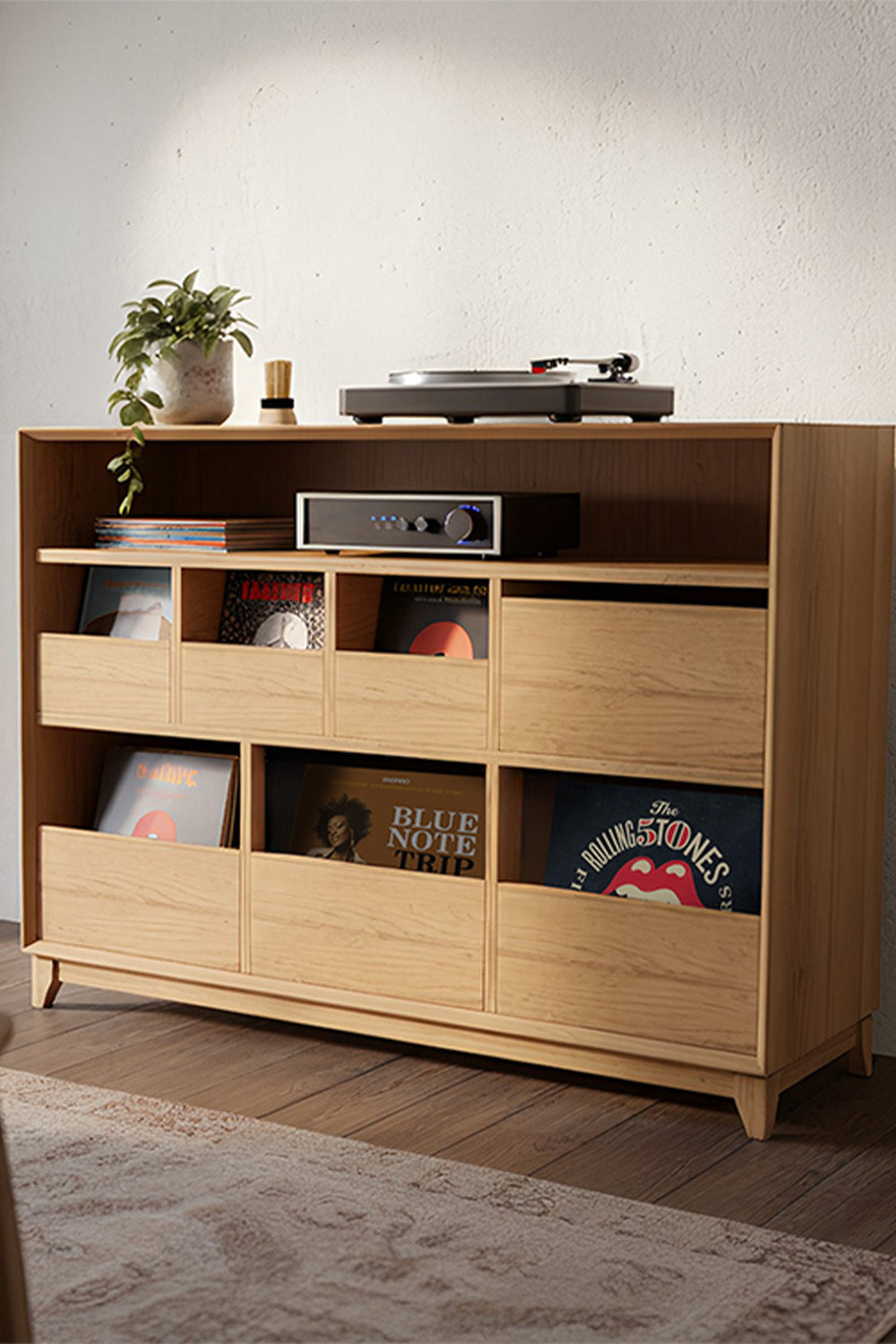 Viny M Plak Dolabı, plak koleksiyonunuzu şık ve düzenli şekilde sergilemeniz için üretildi. Çekmeceleri, plaklarınıza kolayca erişebilmenizi sağlarken zarar görmelerini de engellemek, rafları ise müzik sisteminiz ve aksesuarlarınız için ideal alan sunmak için tasarlandı. Zamansız tasarımıyla her ortama uyum sağlayan Viny, Masif ahşabın sıcak dokusunu ve analog sesin büyüsünü bir araya getiriyor.