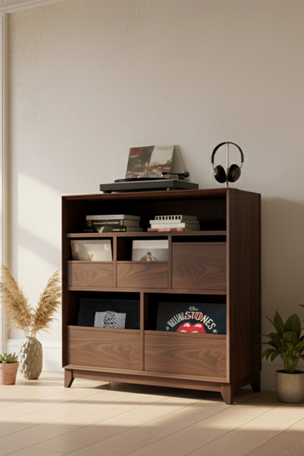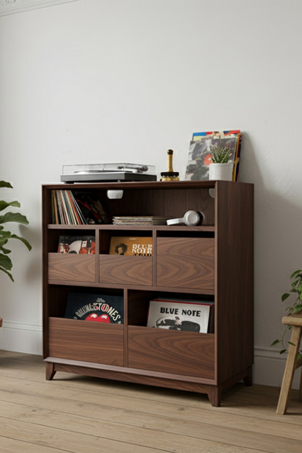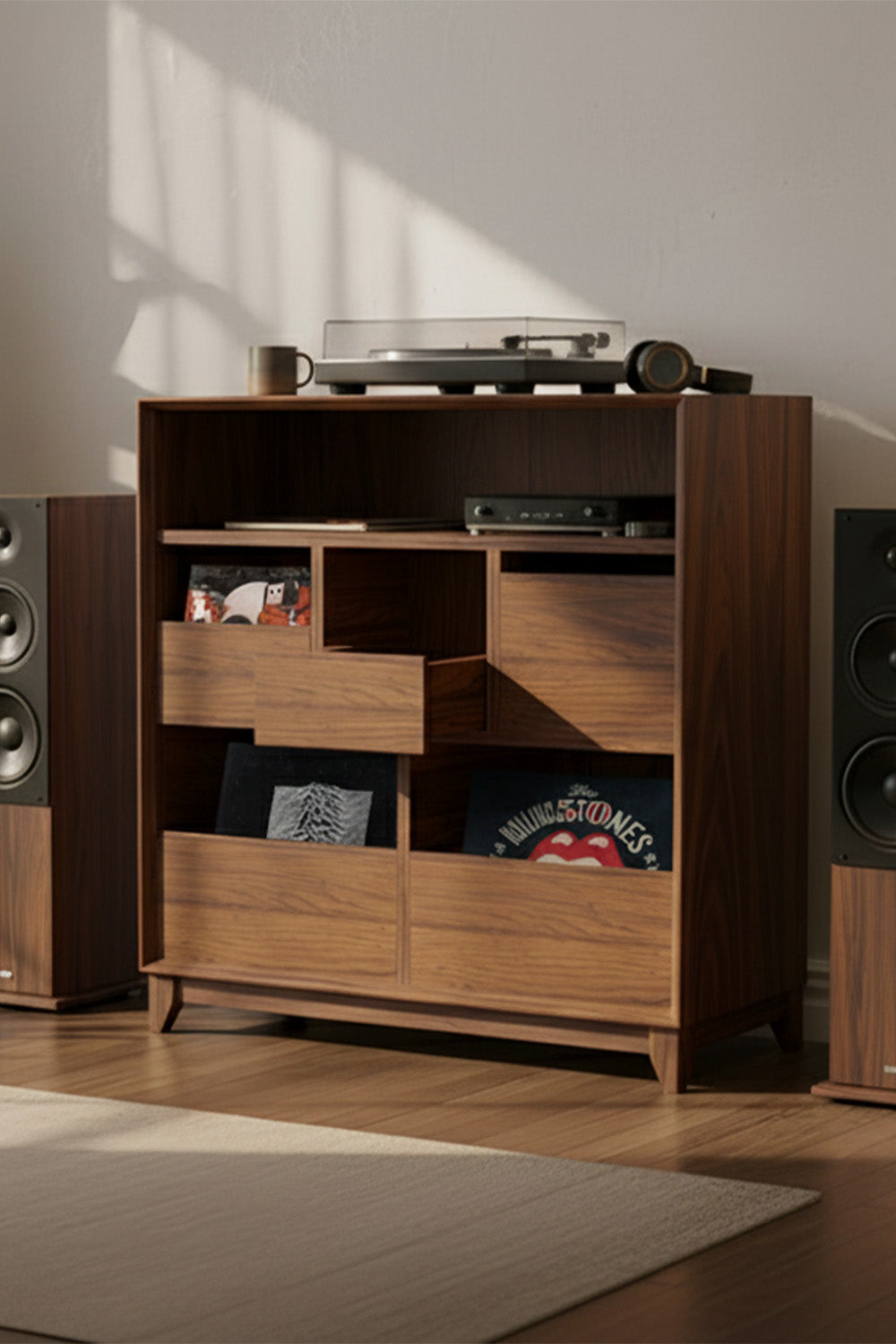 Viny S Plak Dolabı, plak koleksiyonunuzu şık ve düzenli şekilde sergilemeniz için üretildi. Çekmeceleri, plaklarınıza kolayca erişebilmenizi sağlarken zarar görmelerini de engellemek, rafları ise müzik sisteminiz ve aksesuarlarınız için ideal alan sunmak için tasarlandı. Zamansız tasarımıyla her ortama uyum sağlayan Viny, Masif ahşabın sıcak dokusunu ve analog sesin büyüsünü bir araya getiriyor.
