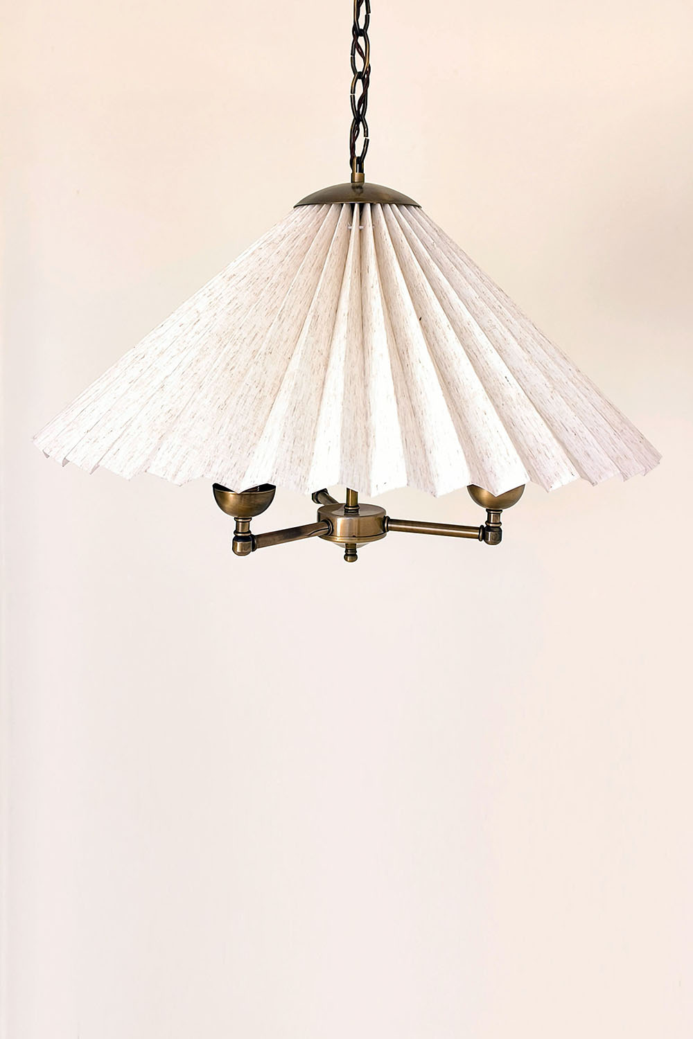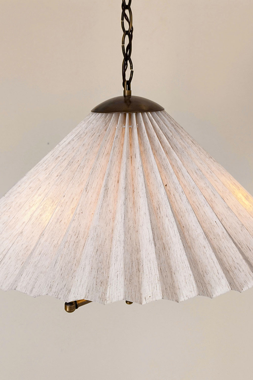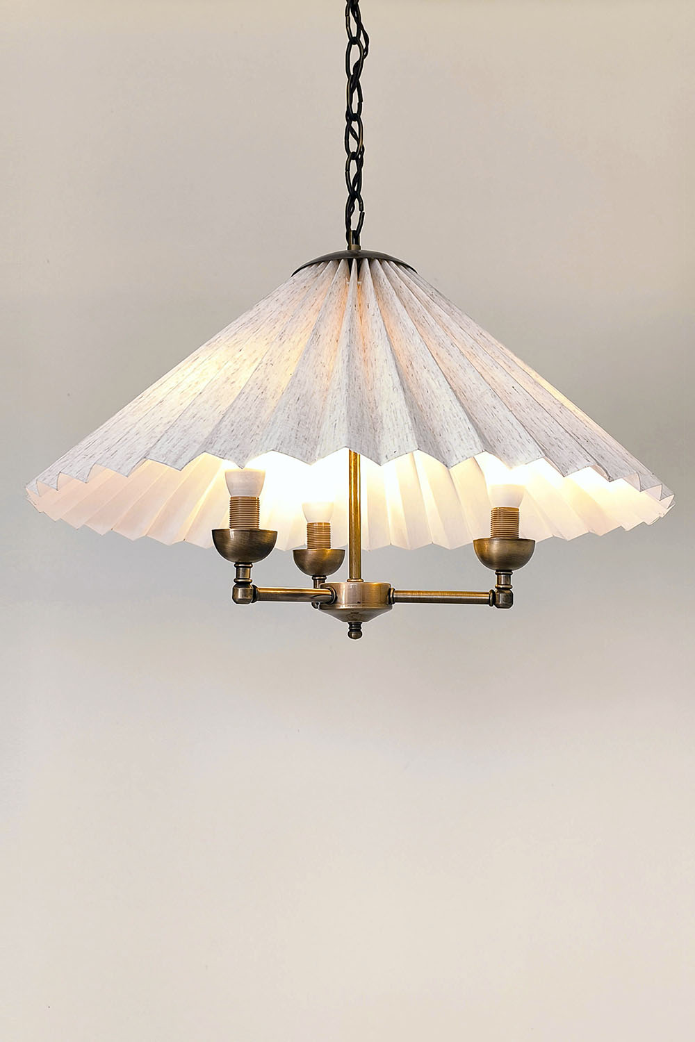 Zamansız pile estetiğini antik pirinç zincir detaylarıyla buluşturan bu özel avize, mekânlara sıcak ve rafine bir atmosfer kazandırmak için tasarlanmıştır. Geniş pileli kumaş şapka, ışığı yumuşak ve dengeli biçimde dağıtarak göz yormayan bir aydınlatma sağlar.
