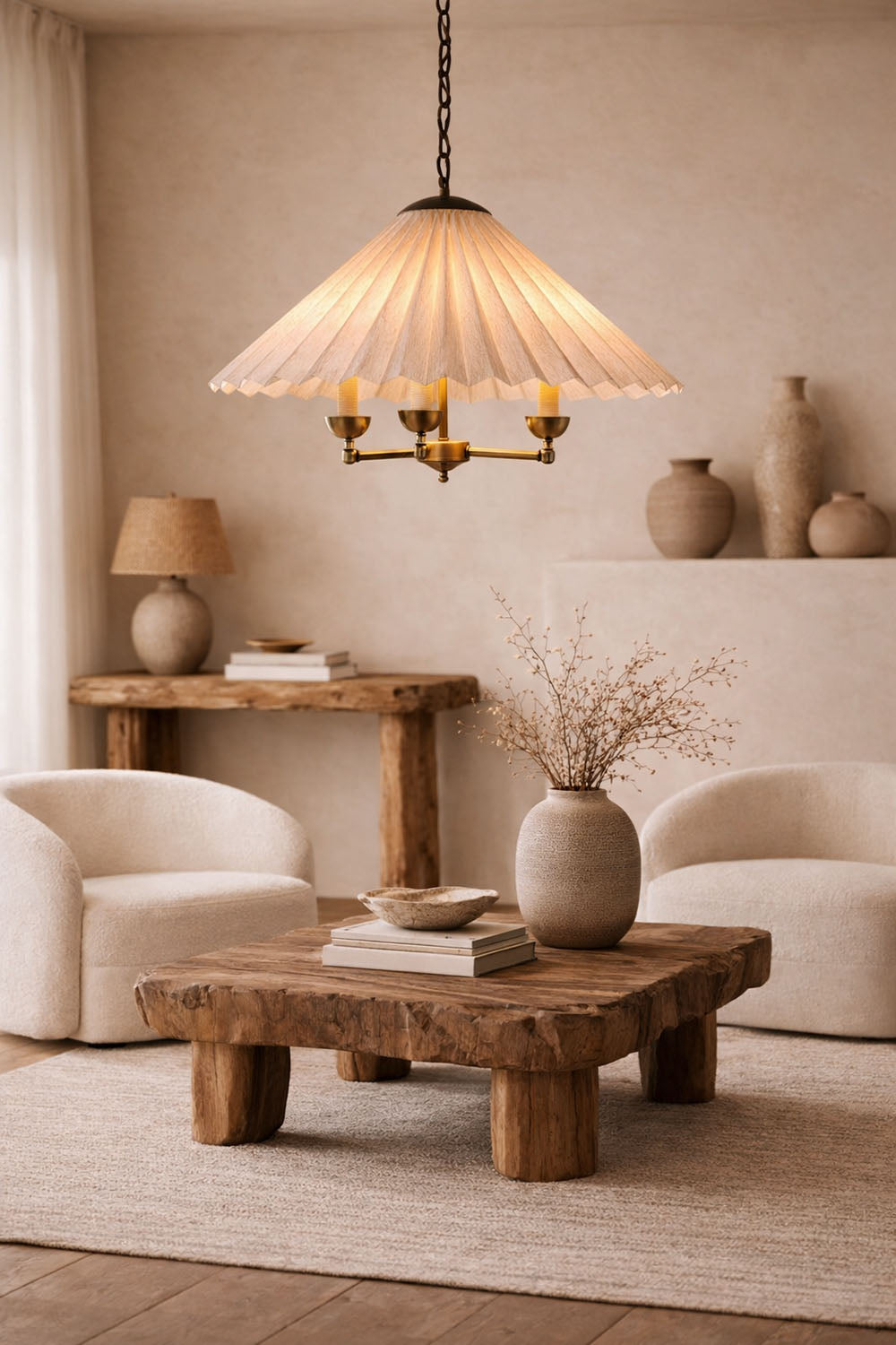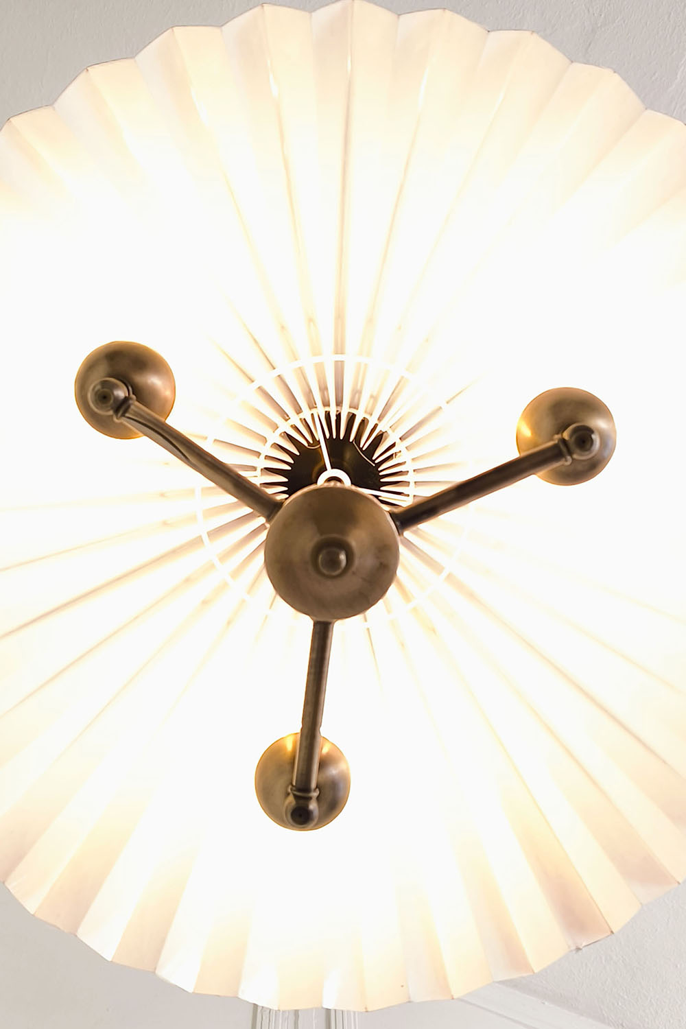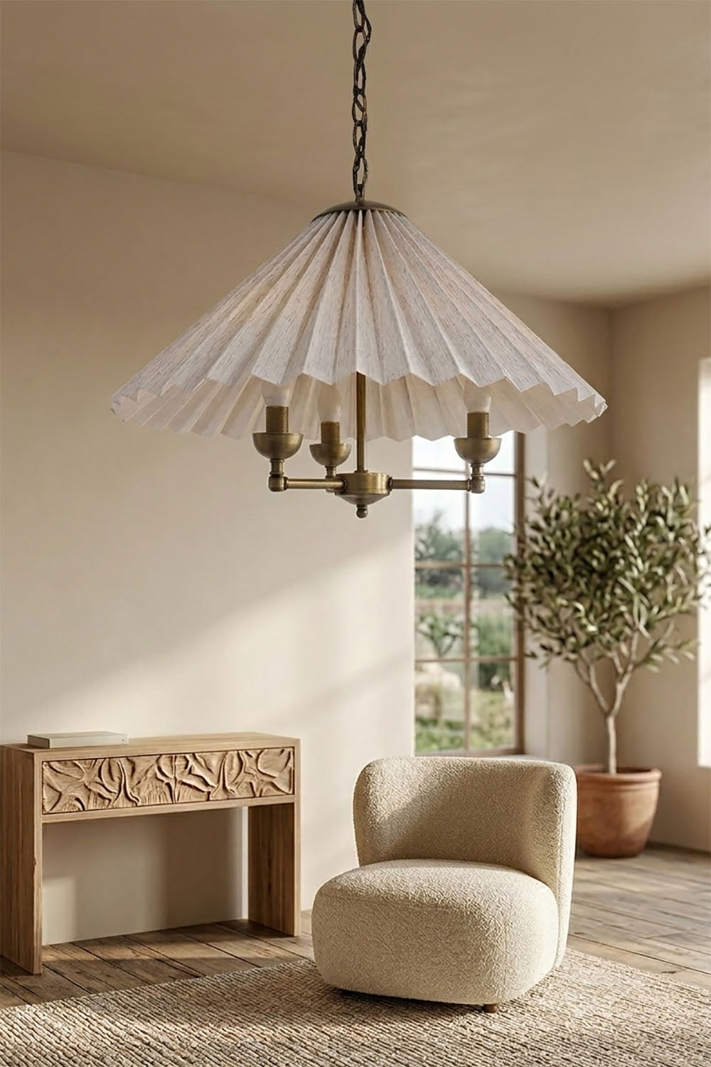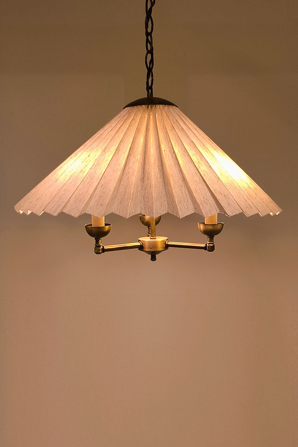 Zamansız pile estetiğini antik pirinç zincir detaylarıyla buluşturan bu özel avize, mekânlara sıcak ve rafine bir atmosfer kazandırmak için tasarlanmıştır. Geniş pileli kumaş şapka, ışığı yumuşak ve dengeli biçimde dağıtarak göz yormayan bir aydınlatma sağlar.