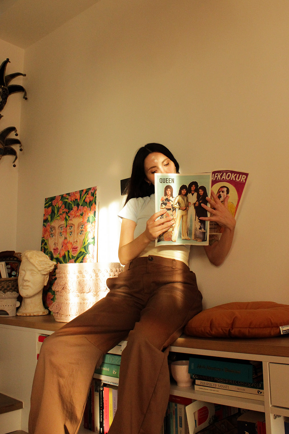 RUE Balon Fit Pantolon yüzeyinde, iki farklı kahverenginin birbirine yumuşakça karıştığı bir degrade uygulama bulunur. Bu ton geçişi, doğal bir katman derinliği yaratarak Daydreamer’ın hafif gölge–ışık oyunlarını taşır.