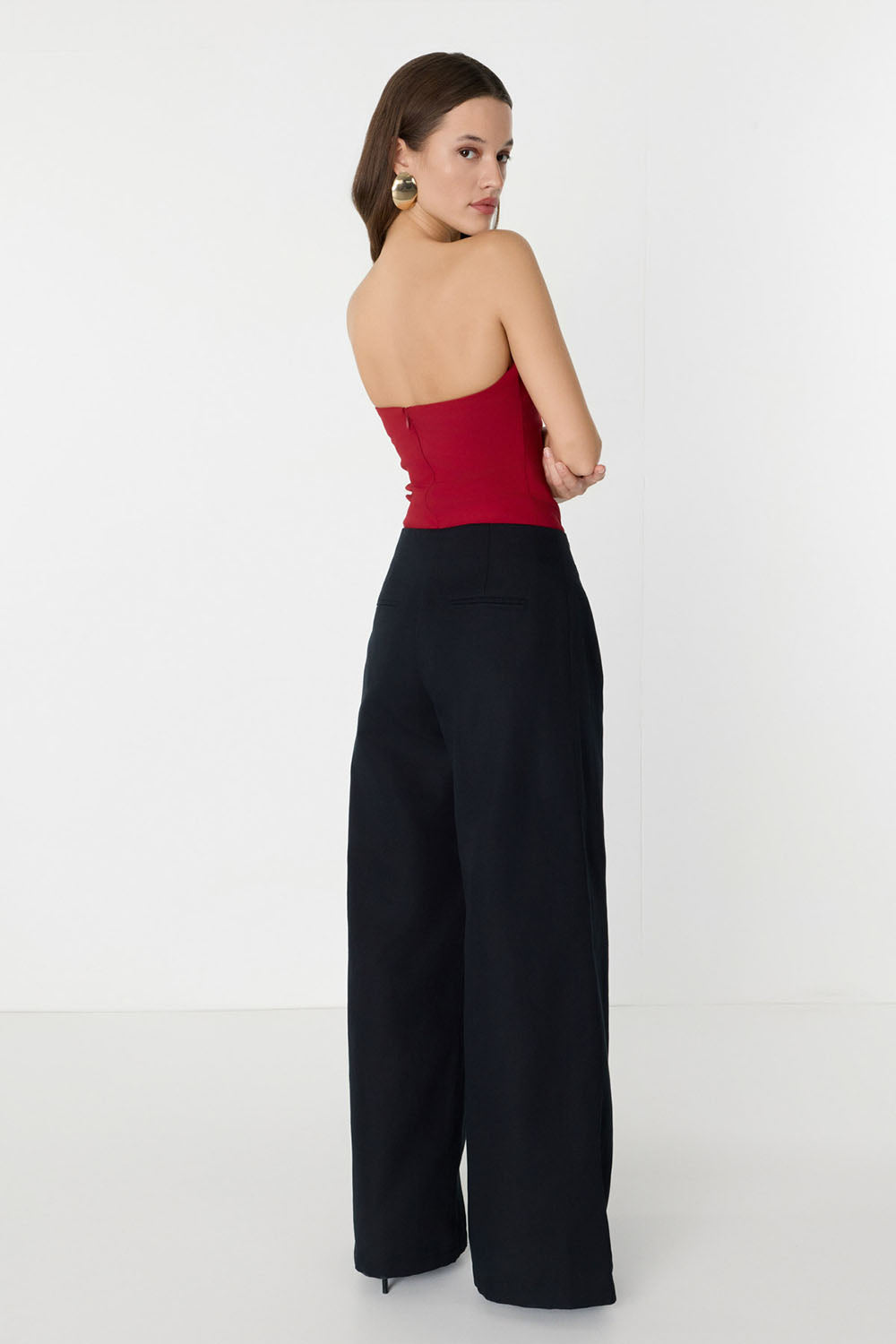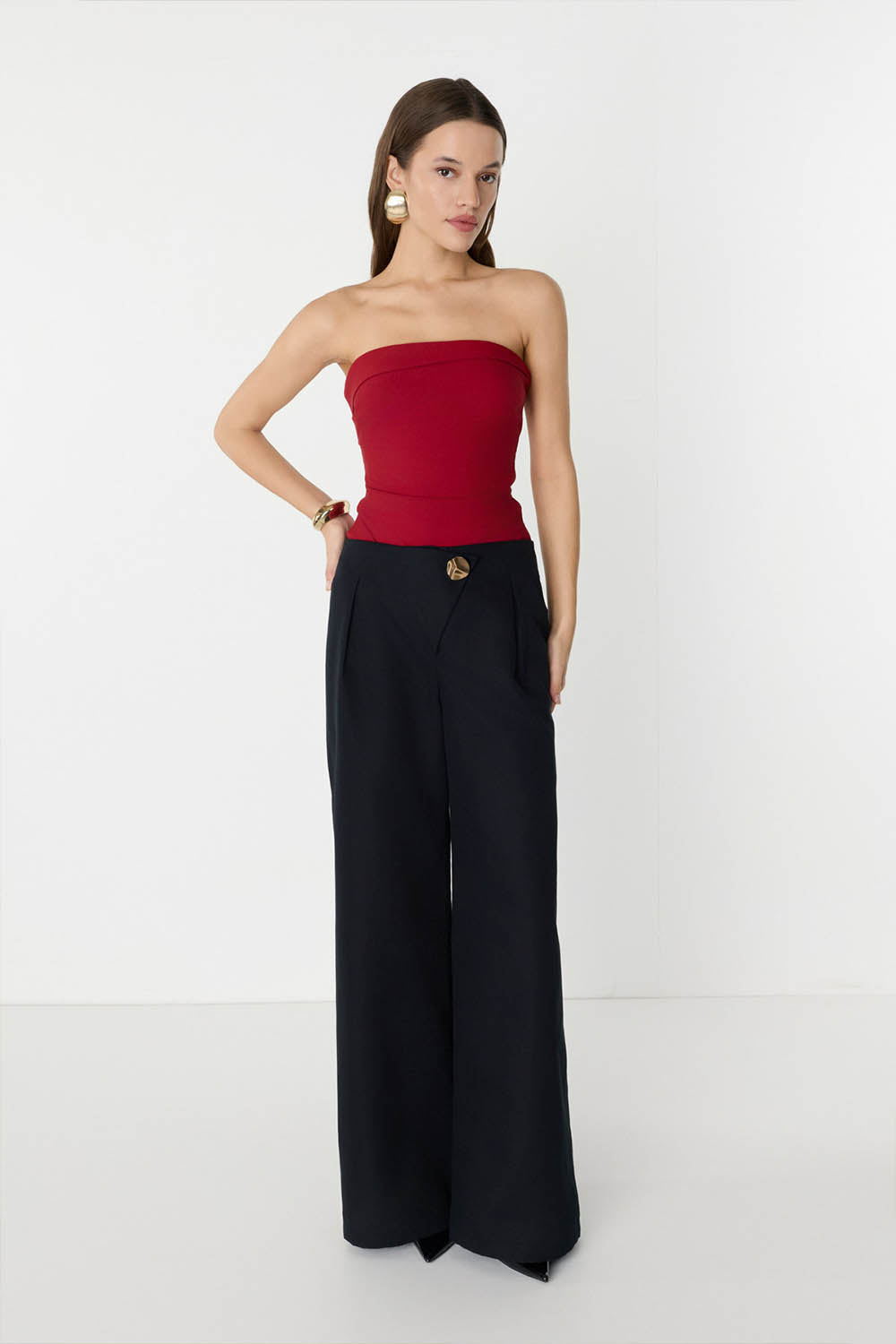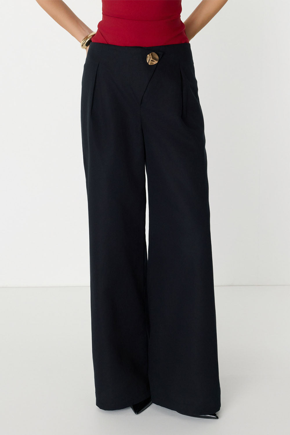 Düğme Detaylı Geniş Paça Siyah Pantolon
