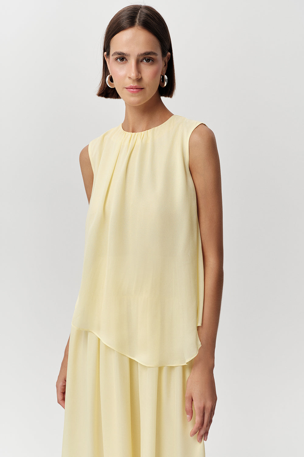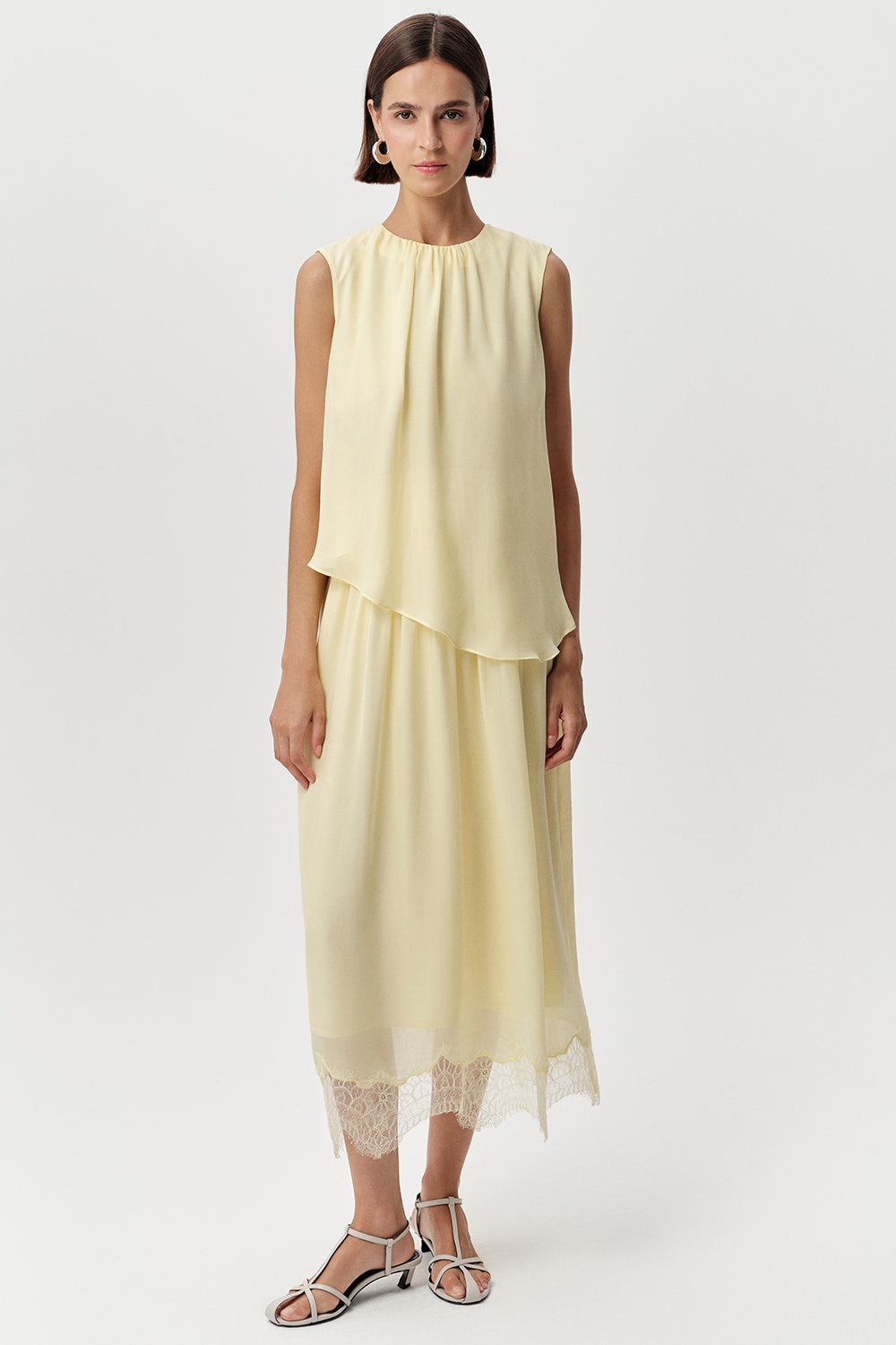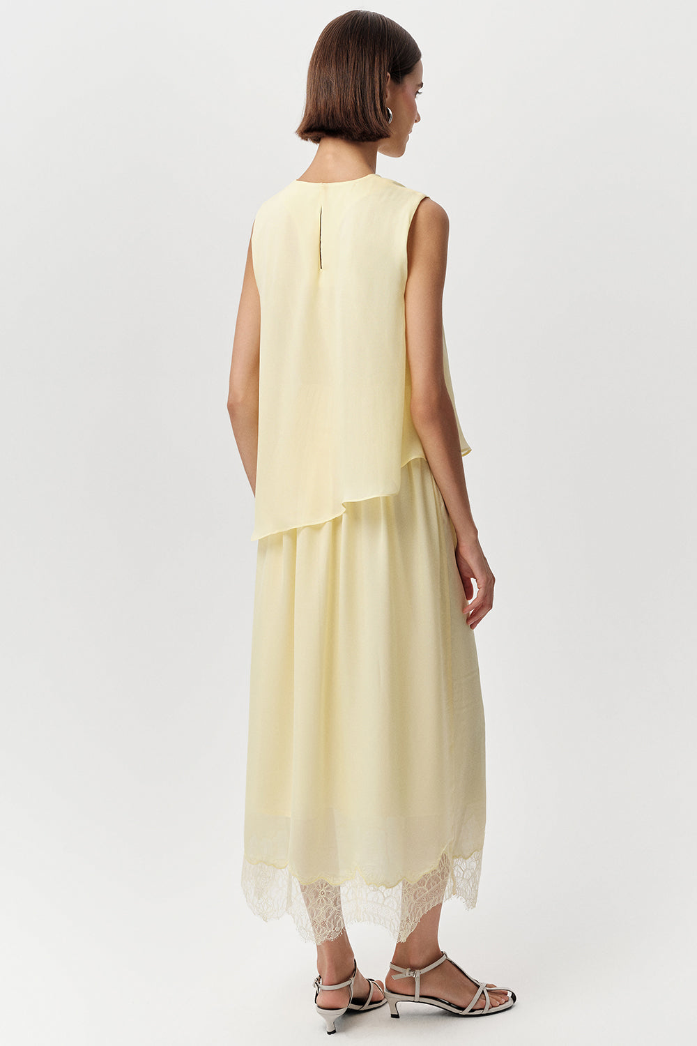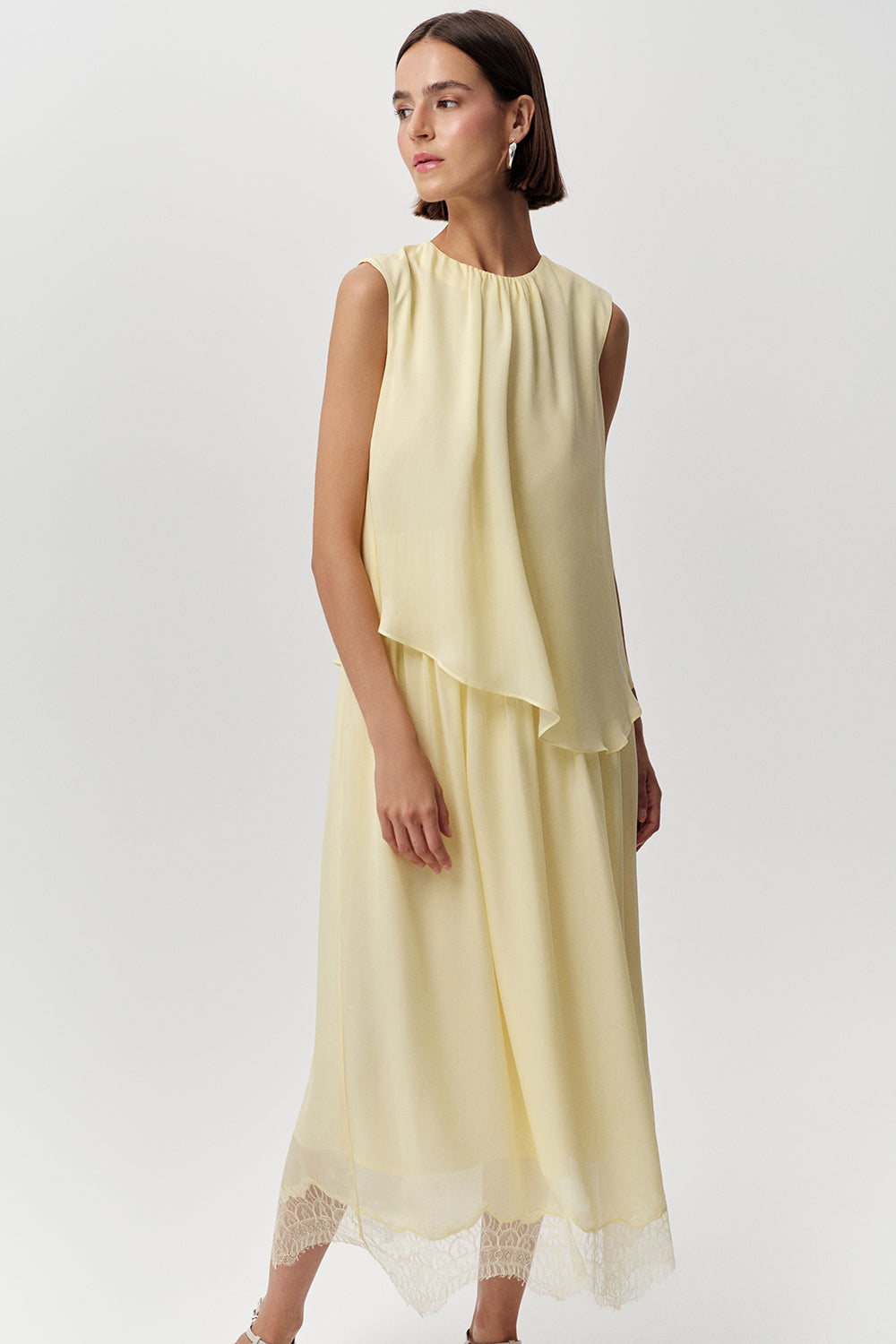 Elbisenin regular kesimi, vücuda rahat bir oturma sunar. Kolsuz tasarımı, sıcak havalarda ferahlık sağlarken, midi boyu ve dökümlü, katmanlı eteği hareket özgürlüğüyle birlikte zarafeti ön plana çıkarır. Etek ucundaki dantel detayları, elbiseye feminen ve dikkat çekici bir dokunuş ekler. Canlı sarı rengiyle enerjik bir stil sergileyen bu elbise, size pozitif bir his katar.