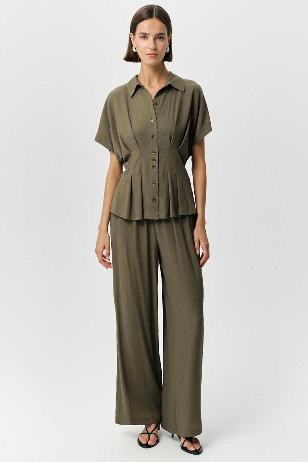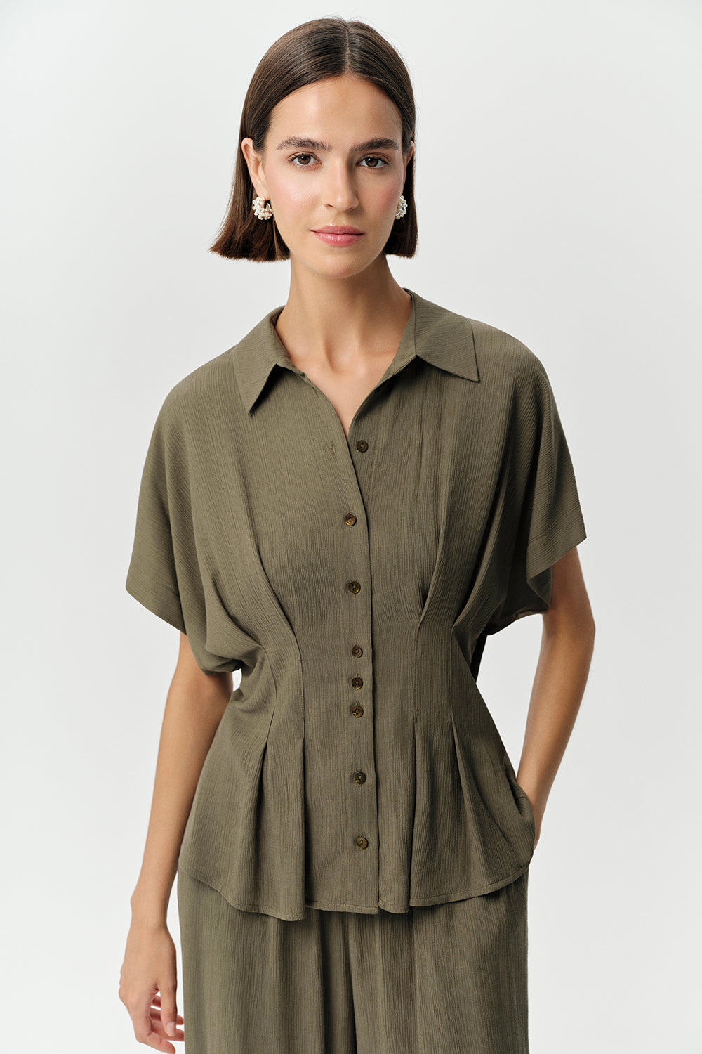 Gardırobunuzda yerini alacak, şık ve konforlu bu Krinkle Haki Gömlek ile tanışın. Gömlek yaka tasarımı ve bele oturan kesimi, her vücut tipine uyum sağlayan zarif bir siluet sunar. Alt kısmındaki peplum detayı, gömleğe modern ve feminen bir hava katarken, düzenli kesimi ve kısa kolları ile sıcak havalarda bile rahatlık sağlar. Düğmeli ön kısmı, kullanım kolaylığı sunar ve krinkle kumaş dokusu, gömleğe benzersiz bir görünüm kazandırır.