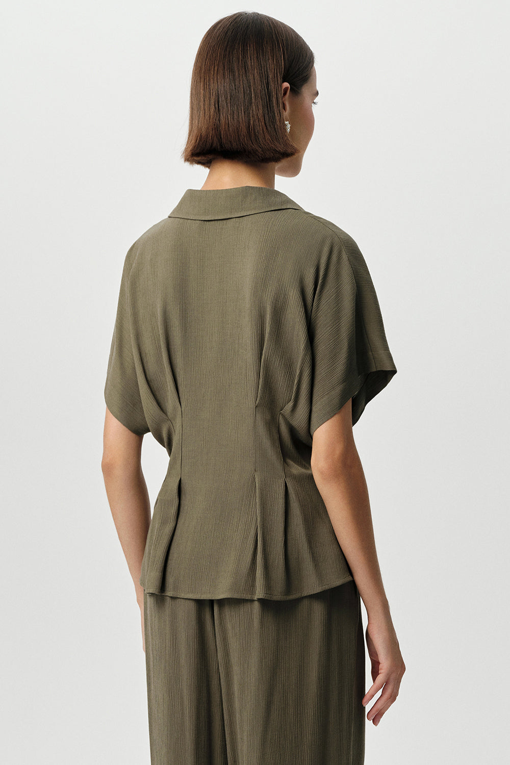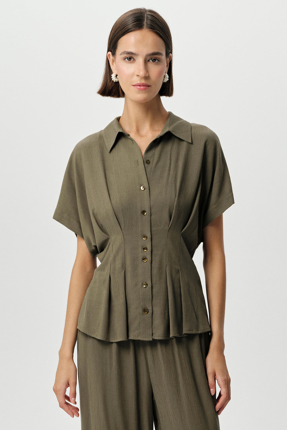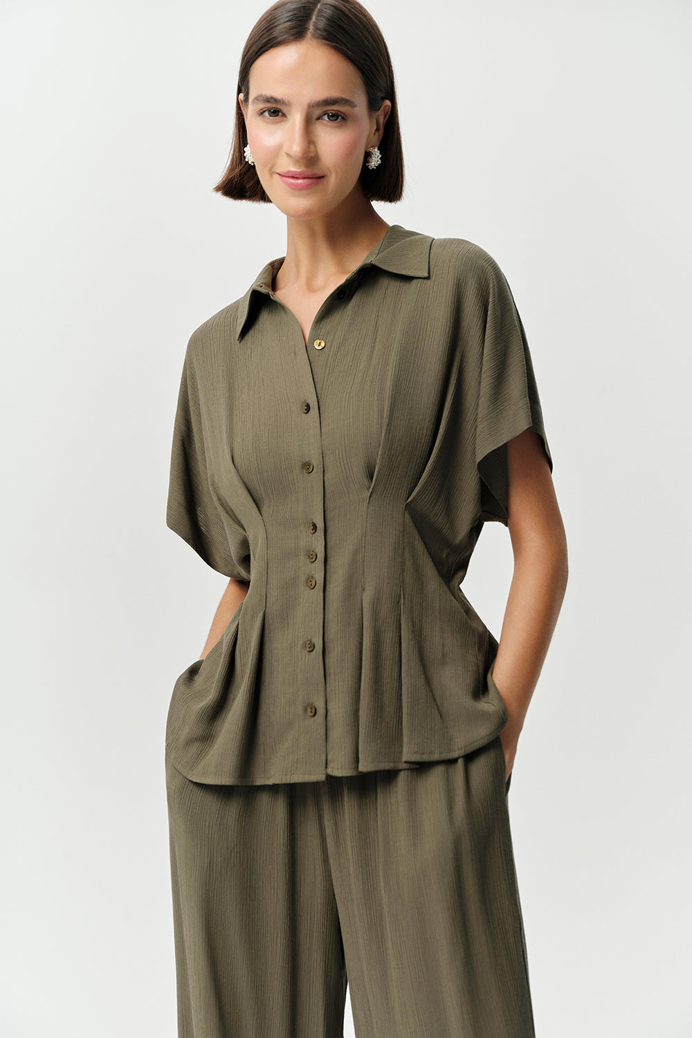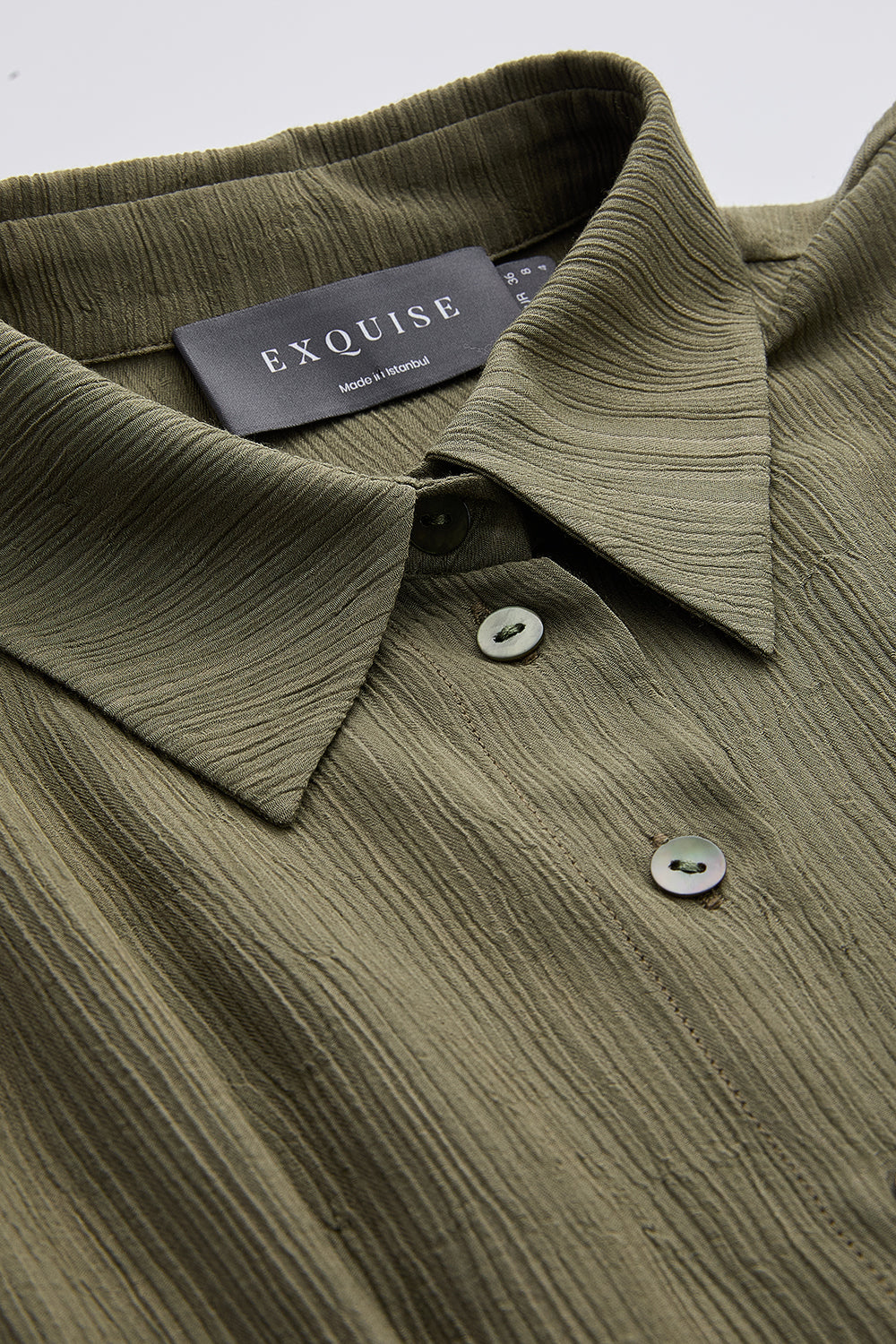 Gömlek Yaka Bele Oturan Düğmeli Regular Krinkle Haki Gömlek