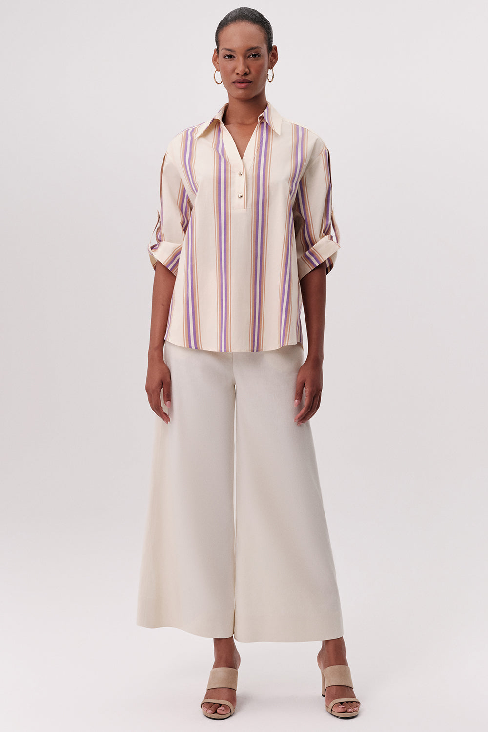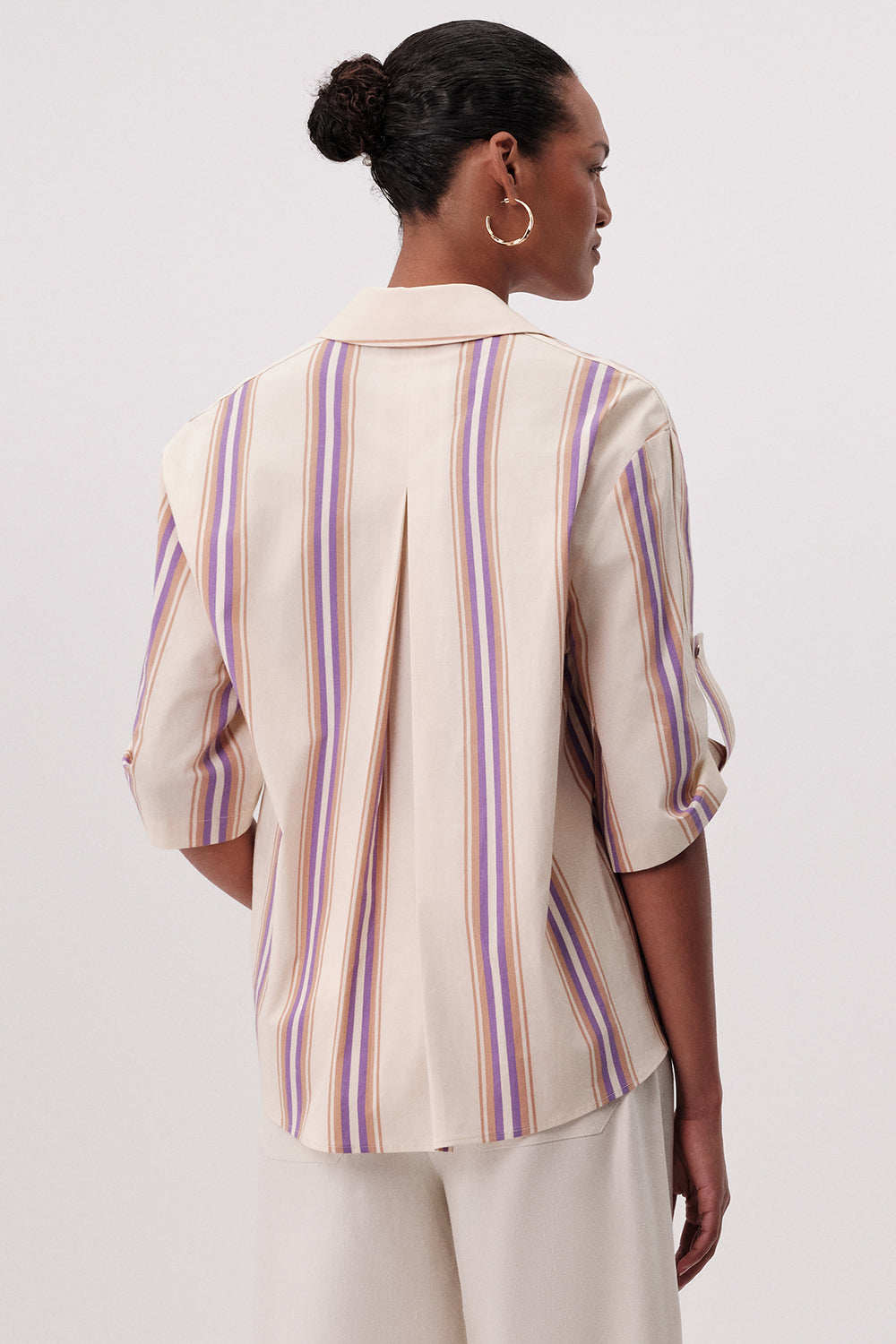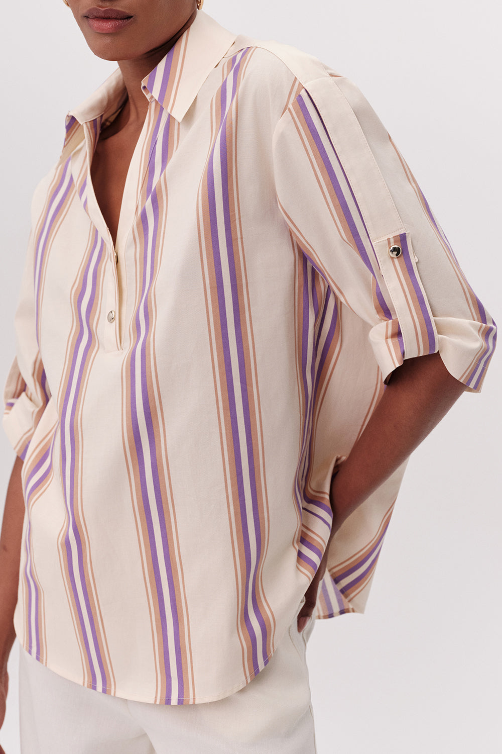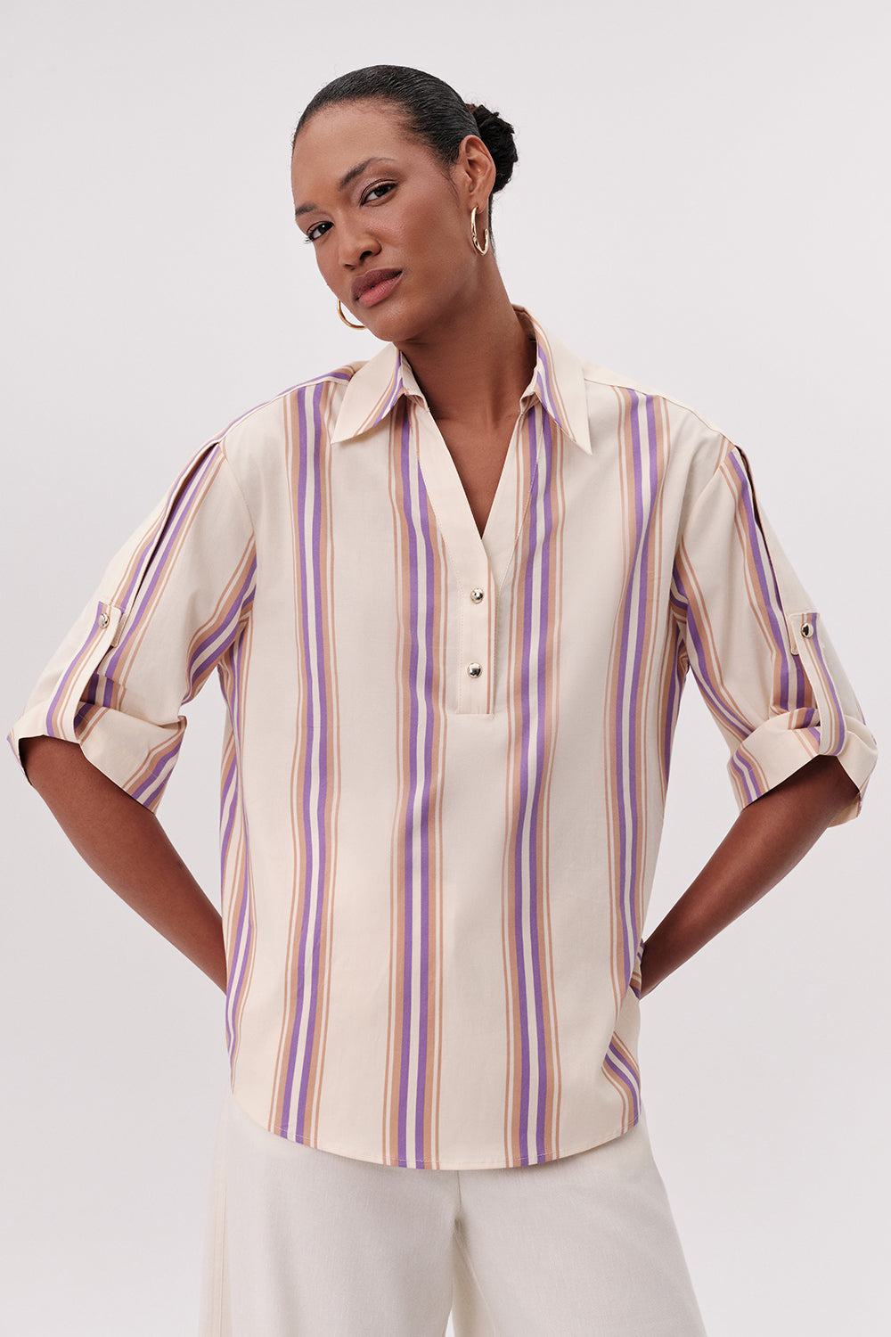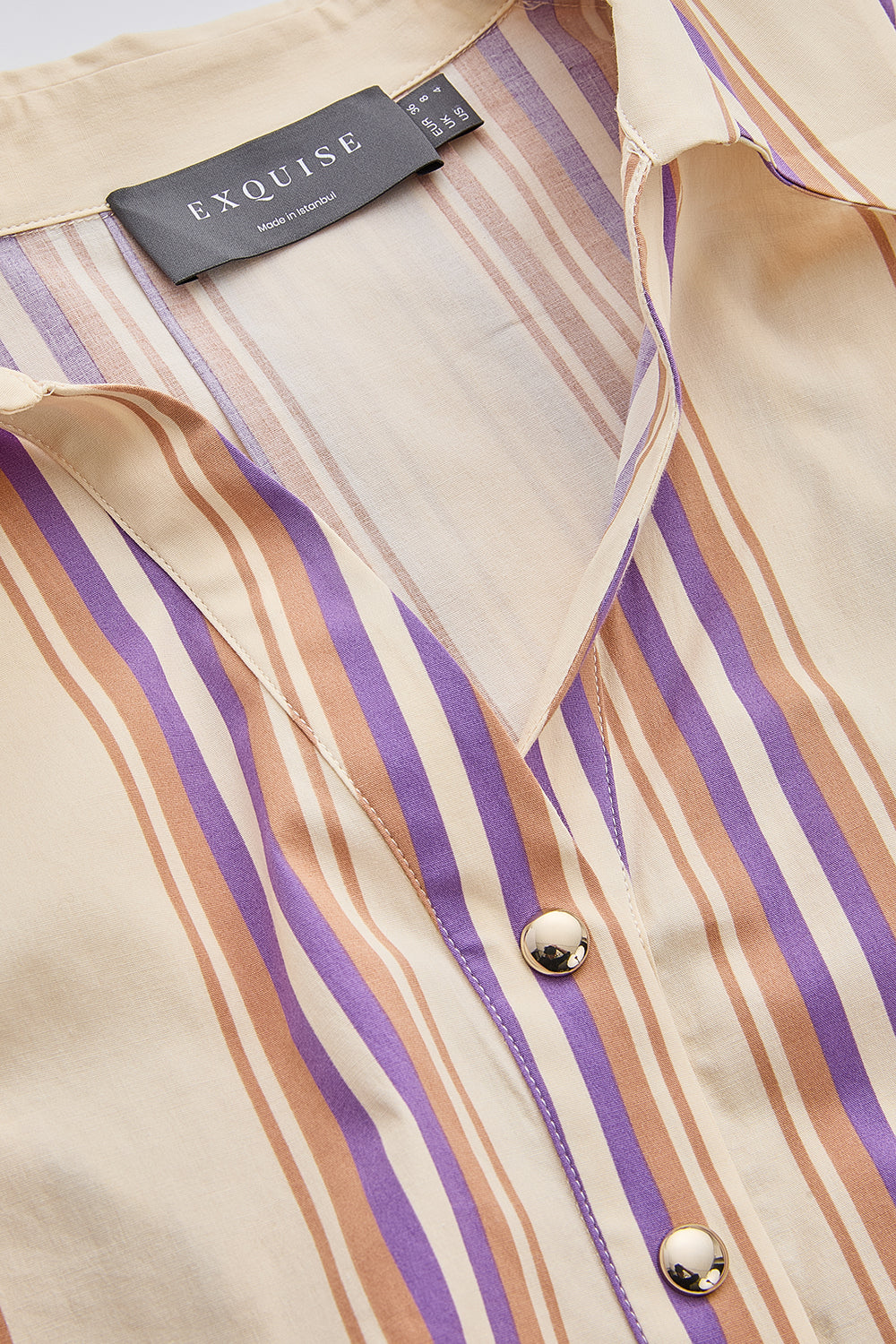Gömlek yaka, kısa kollu, desenli ve düğmeli bu bluz, gardırobunuz için kullanışlı bir parça olacaktır. Regular kesimi ile farklı vücut tiplerine uyum sağlayan bu çok renkli bluz, hem günlük kullanım hem de belirli etkinlikler için uygun bir seçenektir. Krem rengi zemin üzerine yerleştirilmiş mor, turuncu ve kahverengi çizgiler, tasarıma modern bir hava katmaktadır.