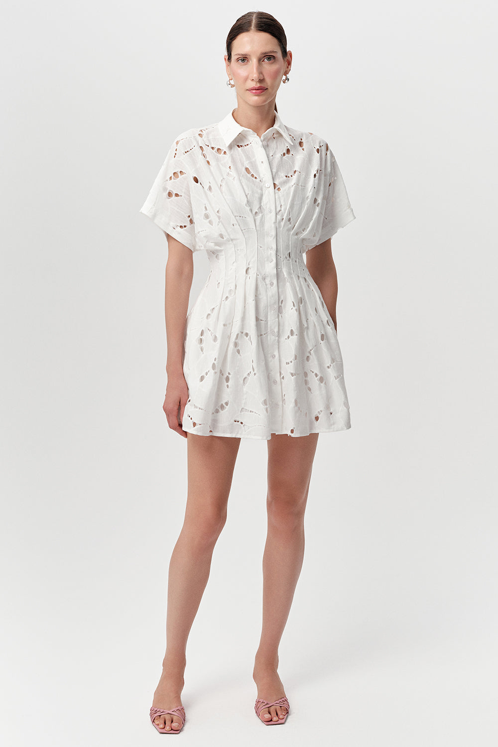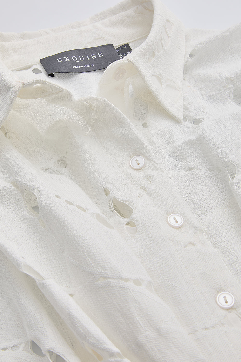 Bu kısa kollu elbise, spor ve şık bir görünüm arayanlar için idealdir. İster günlük bir gezinti, ister plaj kenarında keyifli bir gün, isterseniz de öğleden sonraki davetlerinizde tercih edebilirsiniz. Üzerindeki düğmeler, elbiseye klasik bir form kazandırır ve kolay giyip çıkarma imkanı sunar. Beyaz rengin saflığı ve delikli dokunun hafifliği, bu elbiseyi yaz ayları için ideal bir seçim haline getirir.