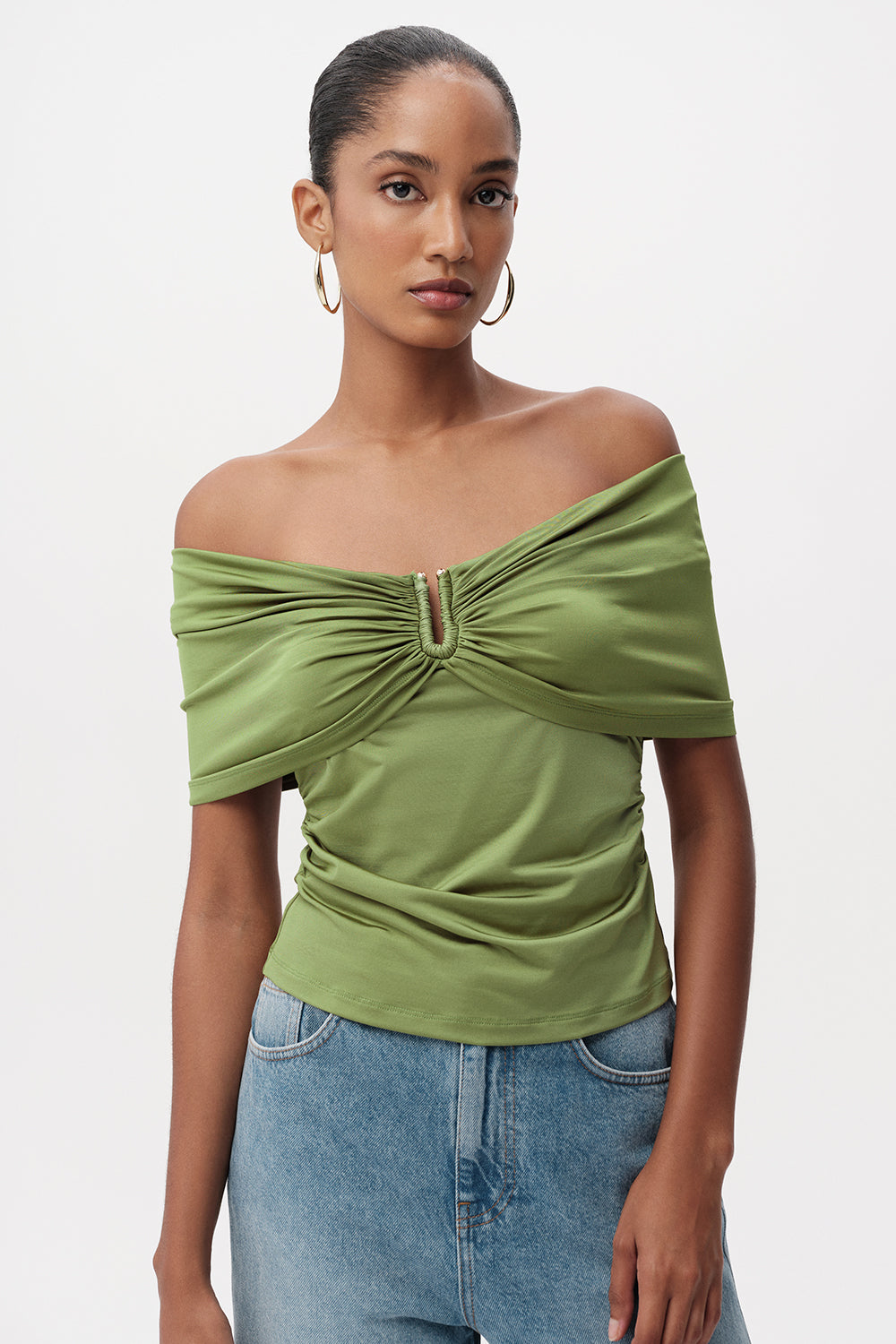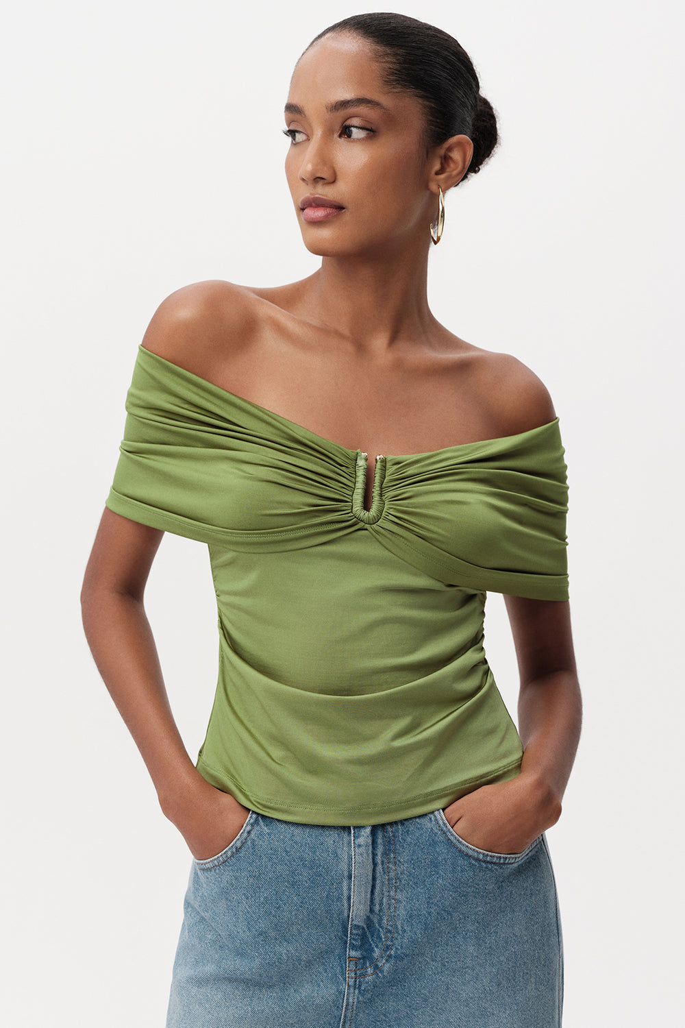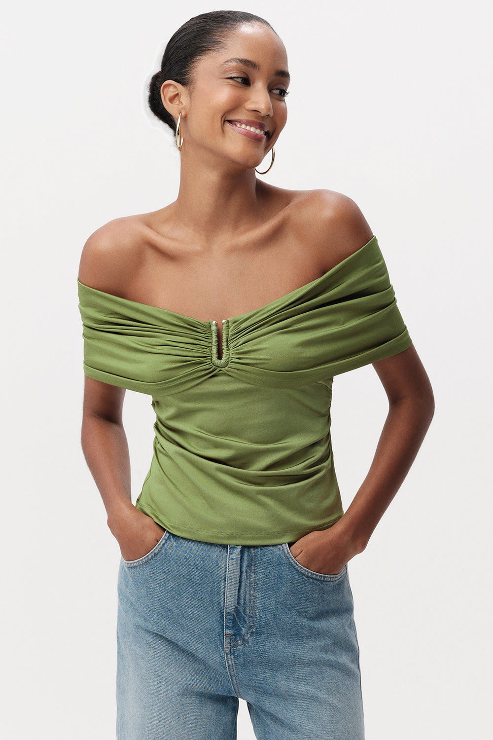 Omuzları Açık Metal Tokalı Slim Fit Örme Haki Bluz