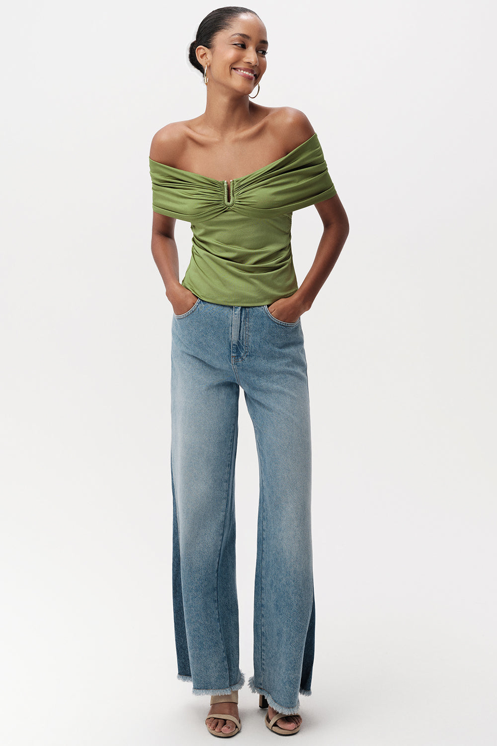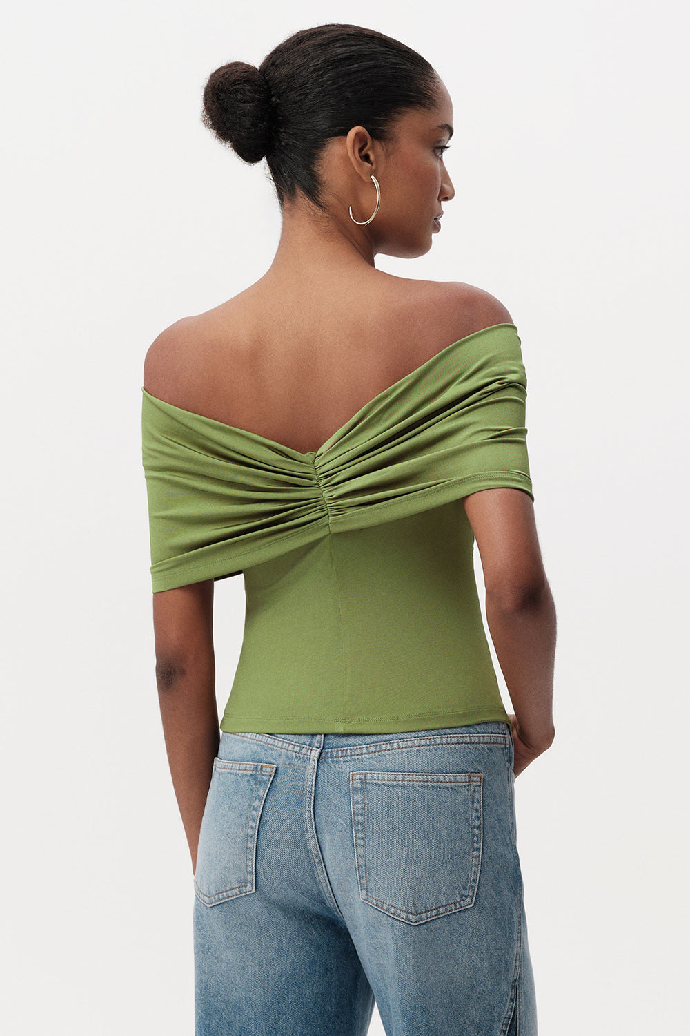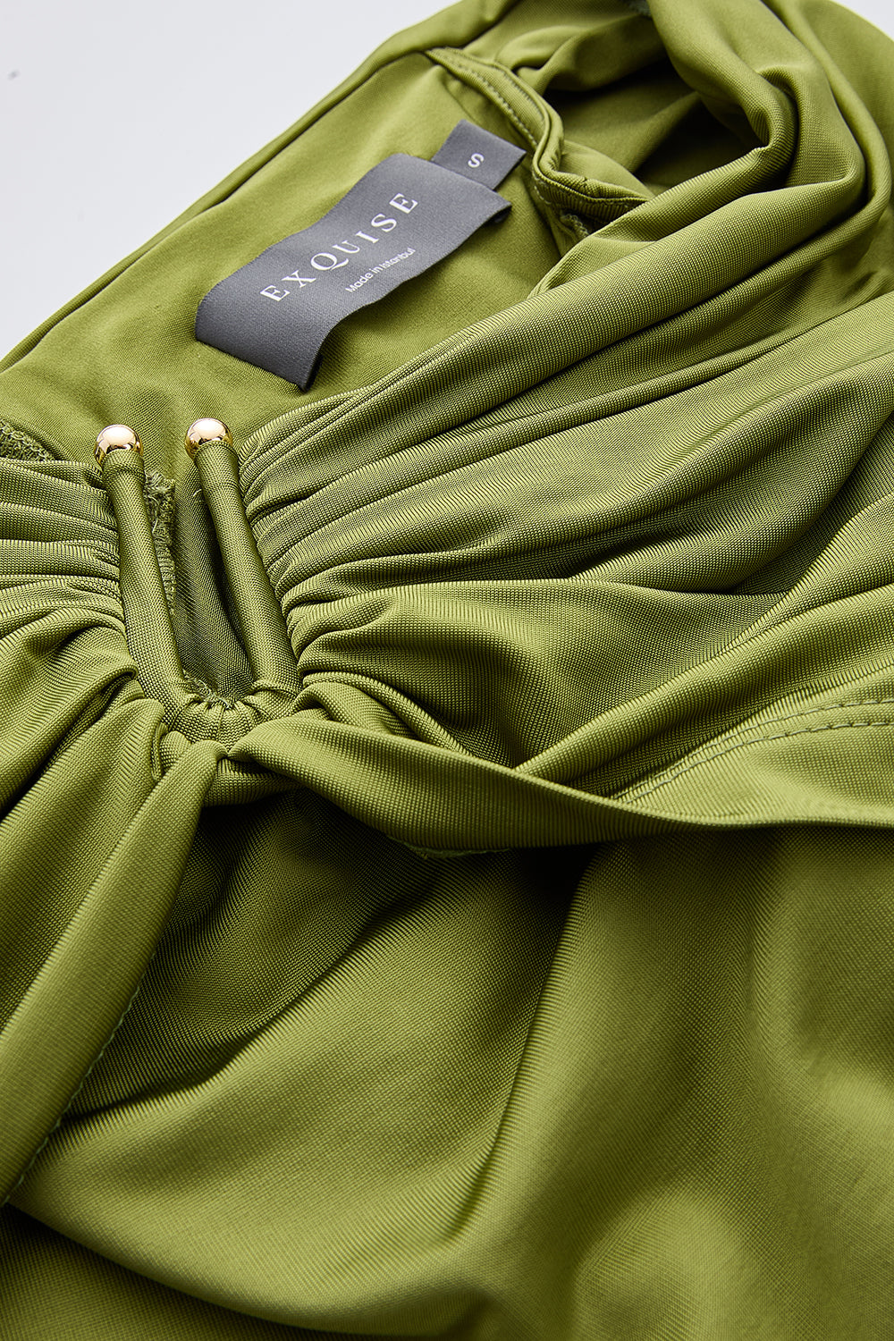 Omuzları Açık Metal Tokalı Slim Fit Örme Haki Bluz