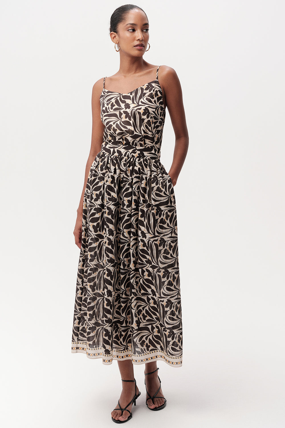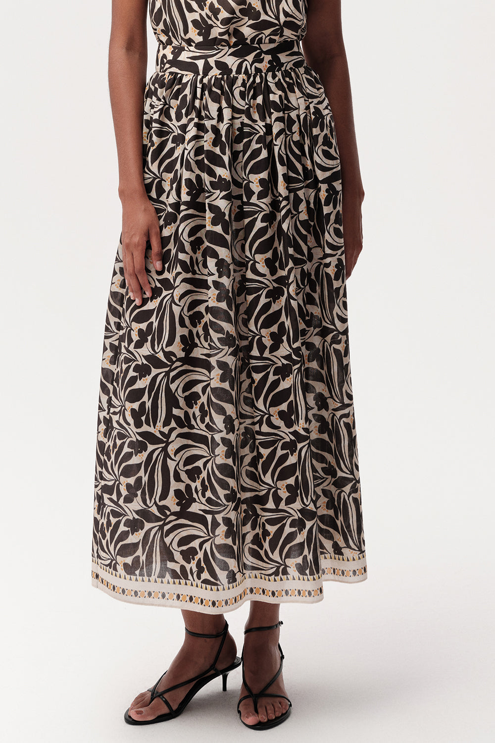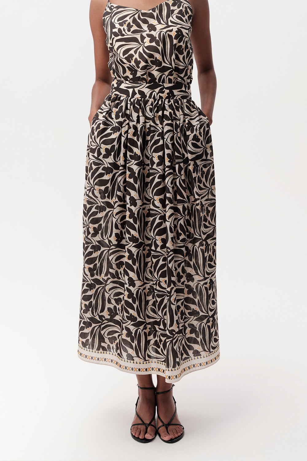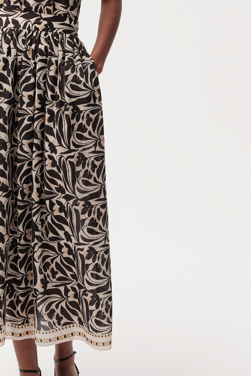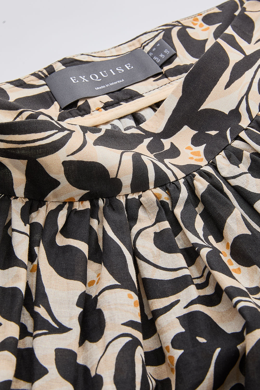 Bu yüksek bel midi etek, gardırobunuza zarafet ve işlevsellik katmak üzere tasarlandı. Klasik bir tasarıma modern bir dokunuş katan etek, göz alıcı altın rengi detayları ve zarif çiçek desenleriyle dikkat çekiyor. Bej zemin üzerine işlenmiş siyah ve beyaz renklerin harmonisi, eteğe sofistike bir görünüm kazandırıyor. Midi boyu, her duruma uyum sağlayan zamansız bir şıklık sunarken, yüksek bel kesimi ise vücut hatlarınızı vurgulayarak daha uzun ve zarif bir silüet oluşturmanıza yardımcı olur.
