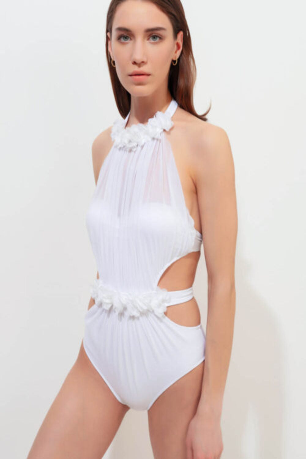 Bendis White Swimsuit With White Chiffon Flowers Straps