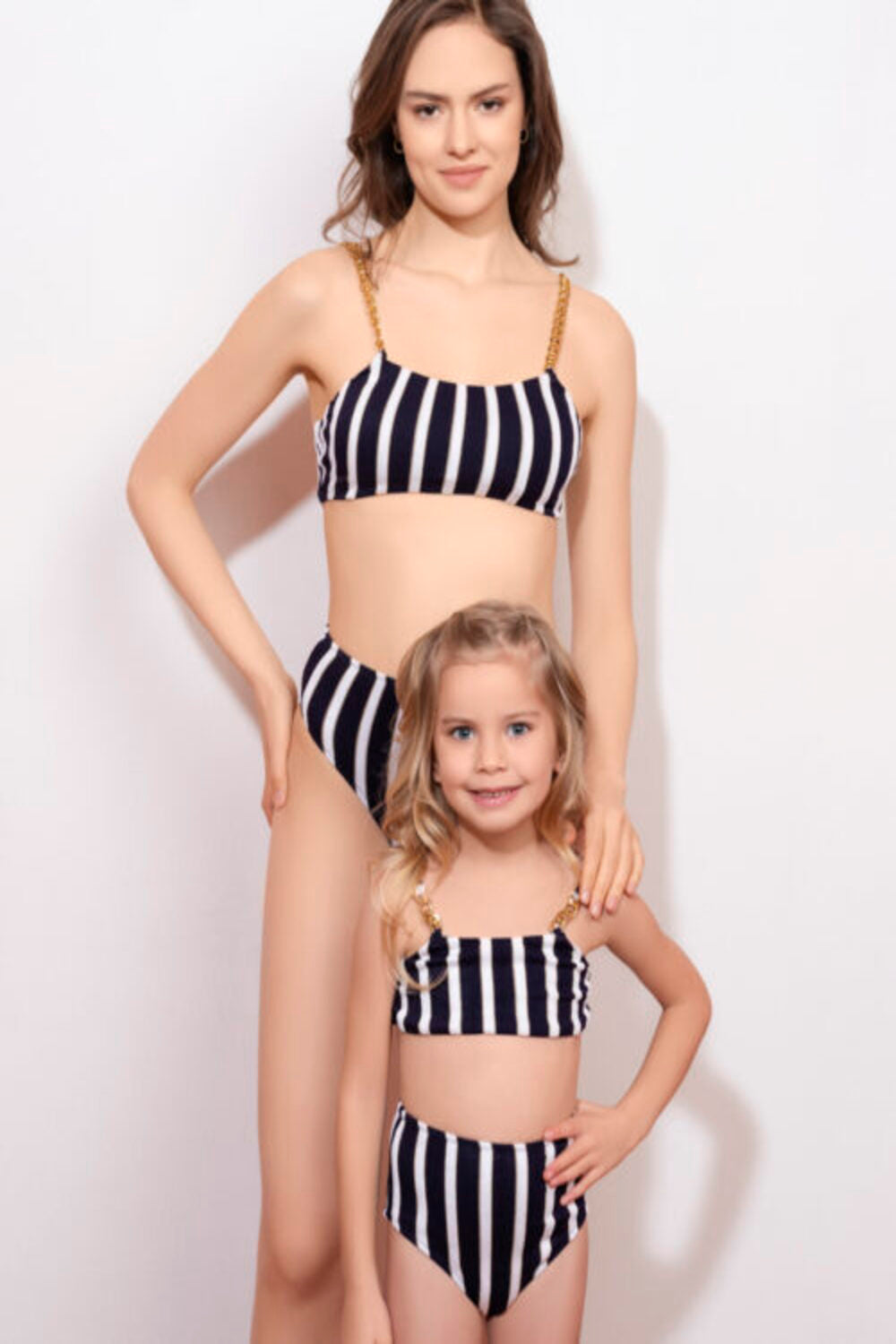 Maria Navy Stripe High Waist Bikini With Gold Chain Straps