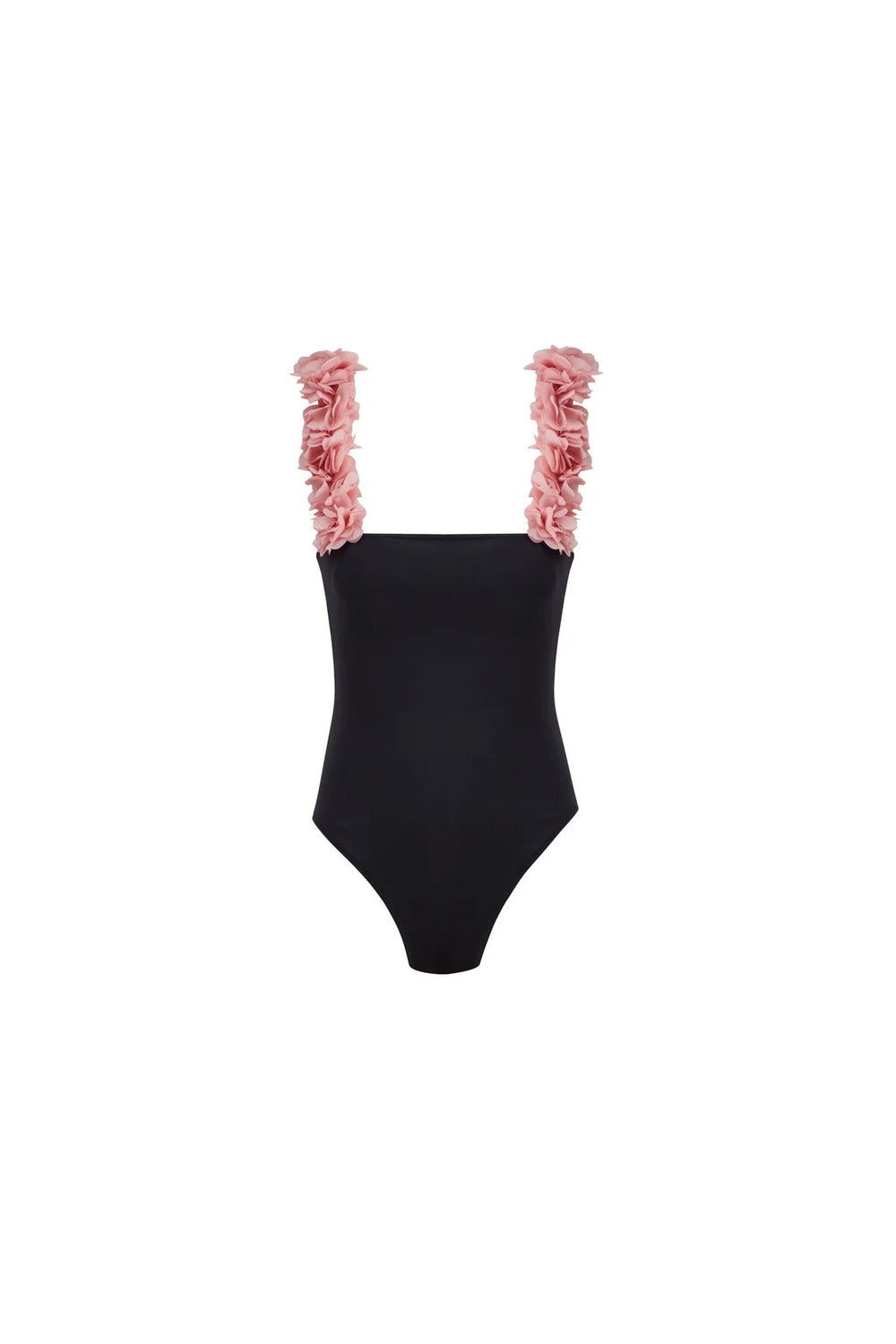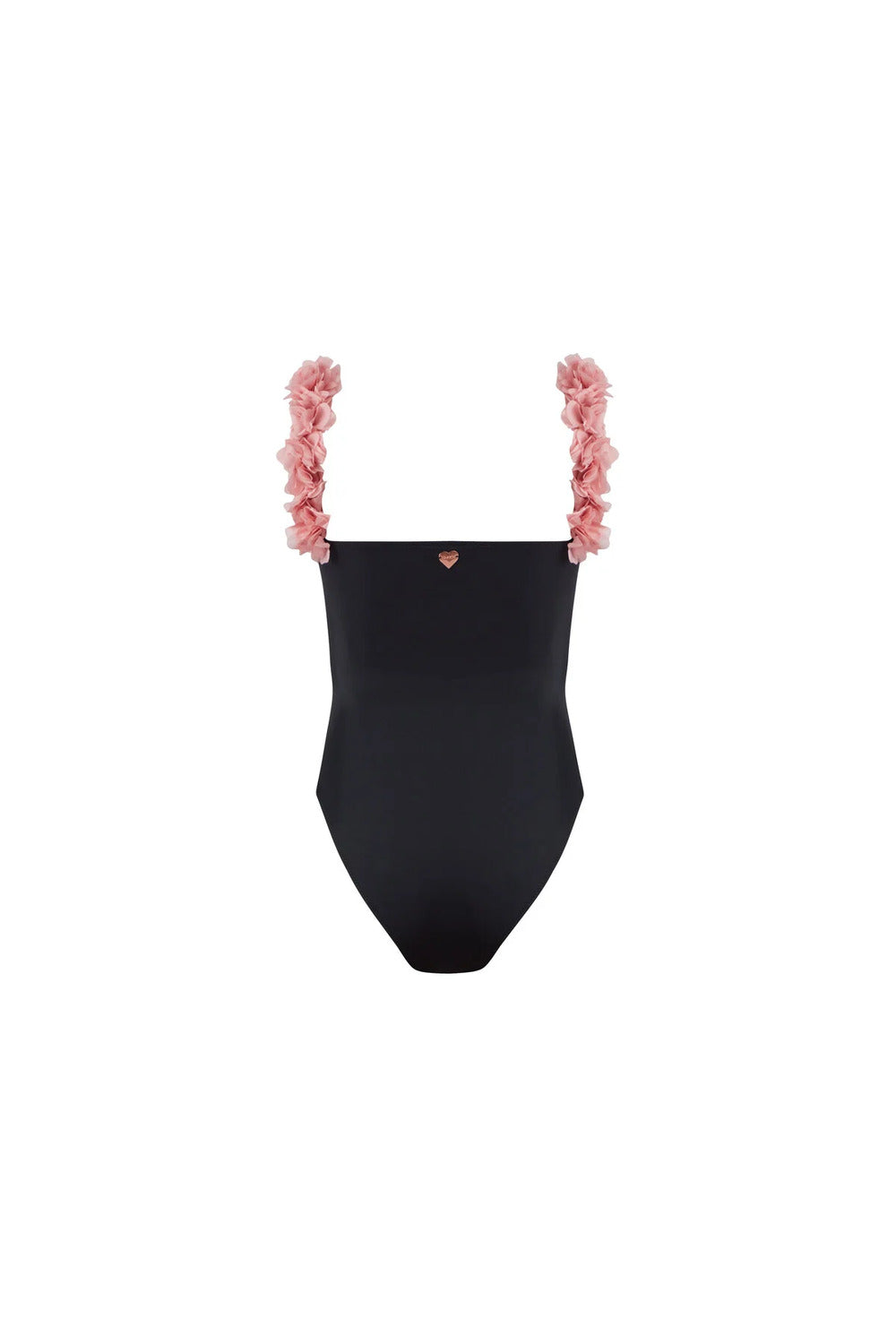 Rosa Black Kids Swimsuit With Pink Chiffon Flowers Straps