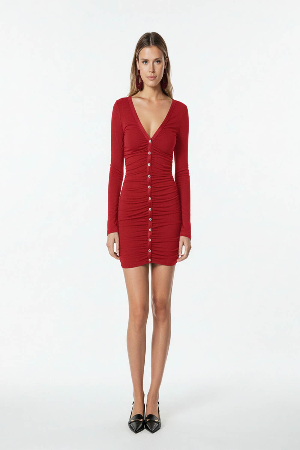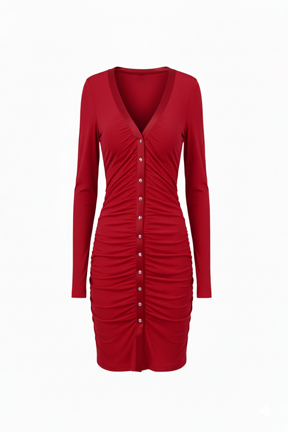 ARLENA Elbise, derin V yaka detayı, önden düğme kapaması ve vücudu zarifçe saran ince büzgüleriyle zahmetsiz bir şıklık sunar. Lüks esnek sandy kumaştan tasarlanan bu parça, her hareketle akıcı bir form kazanır — hem gündüz hem gece kullanımı için idealdir.