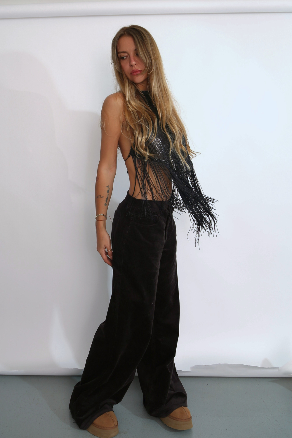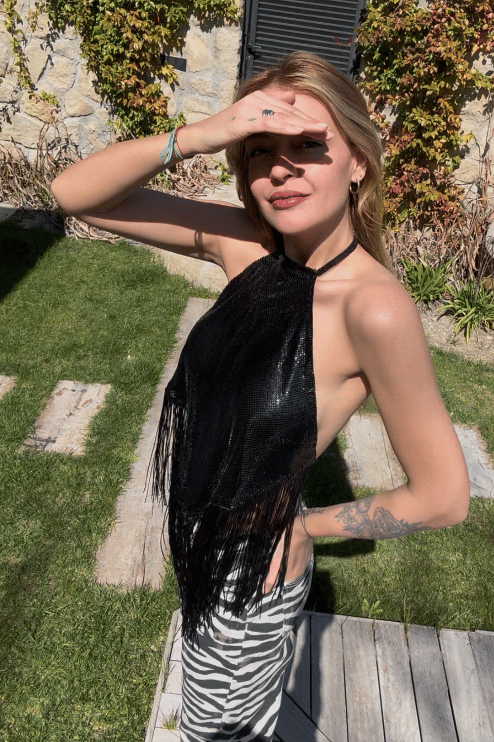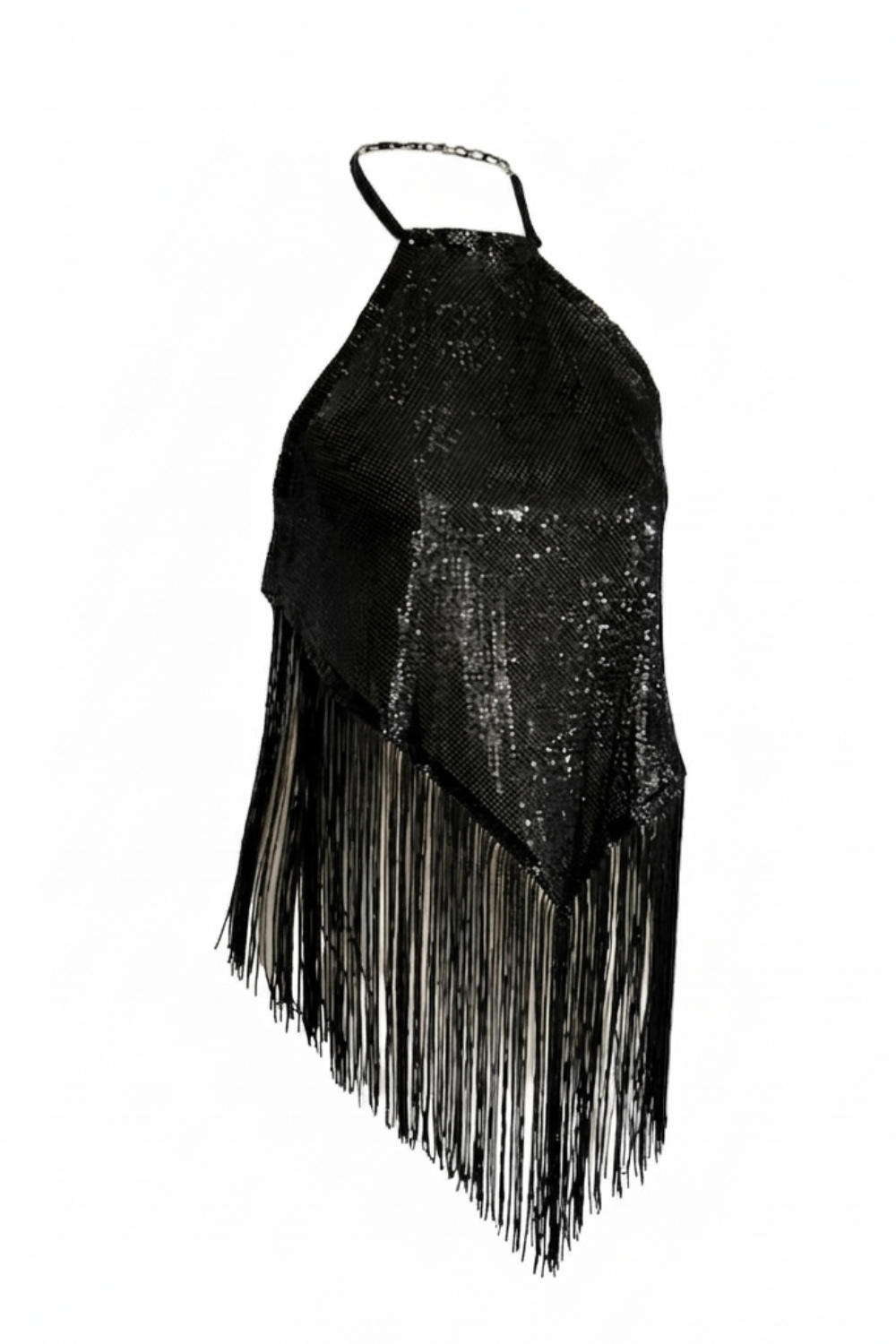Parlak metal kumaşı ve hareketli püskül detayıyla dikkat çeken bu halter top, özel davetler, gece kombinleri ve sahne görünümleri için güçlü ve iddialı bir parçadır. Boyun ve sırt kısmındaki ayarlanabilir kapamalar sayesinde farklı bedenlere uyum sağlayacak şekilde tasarlanmıştır.