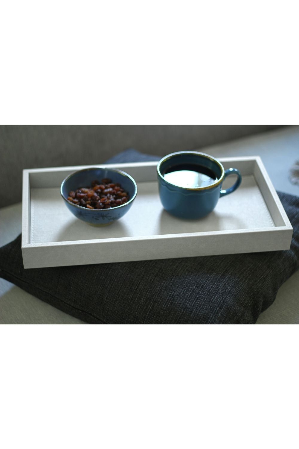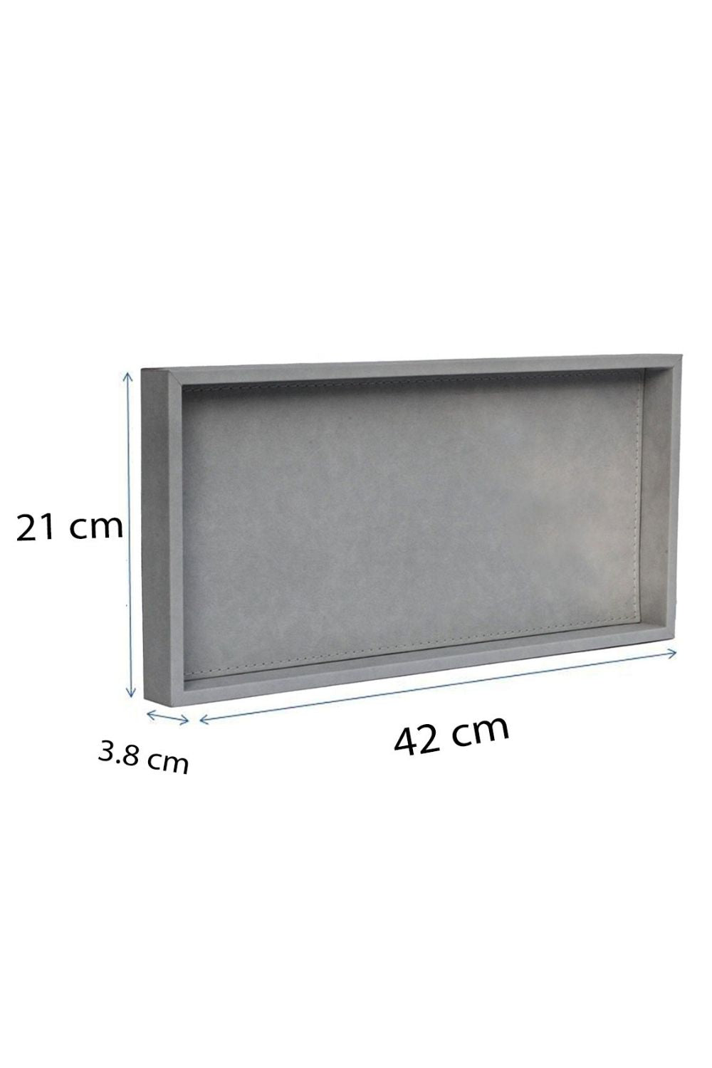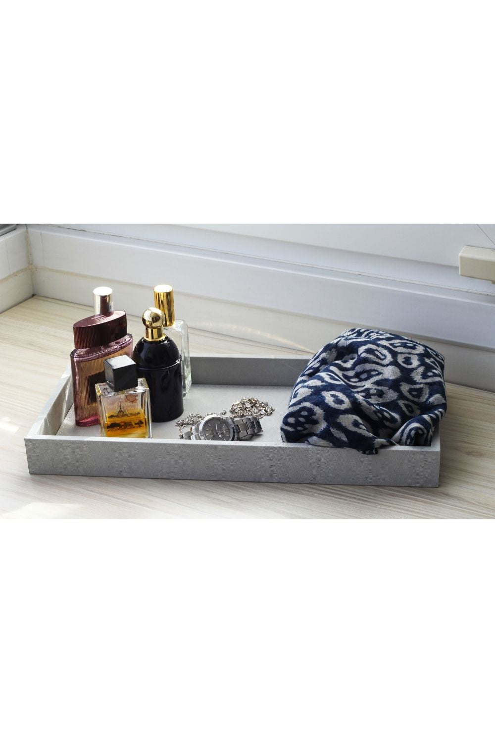 Açık Gri tonuyla dikkat çeken bu büyük boy suni deri tepsi, zarif tasarımıyla hem