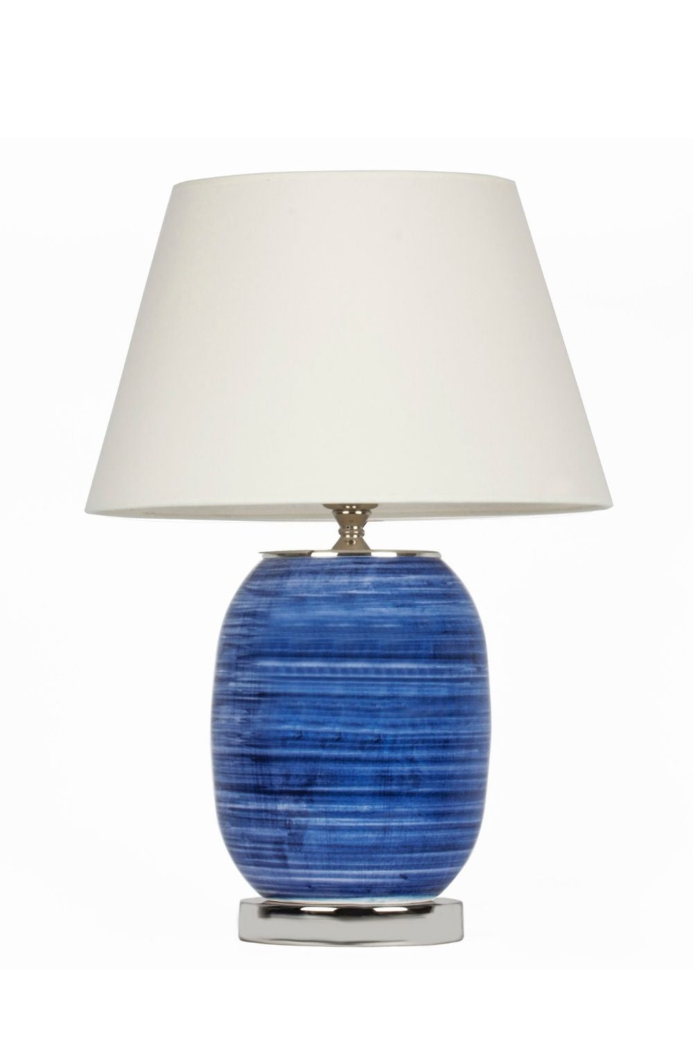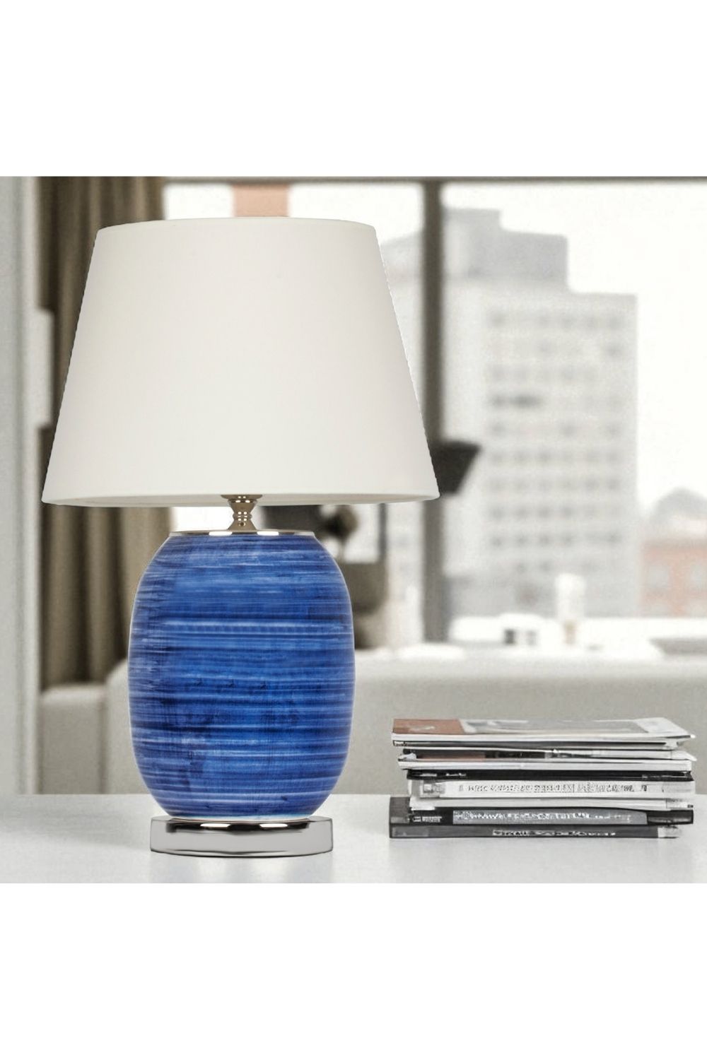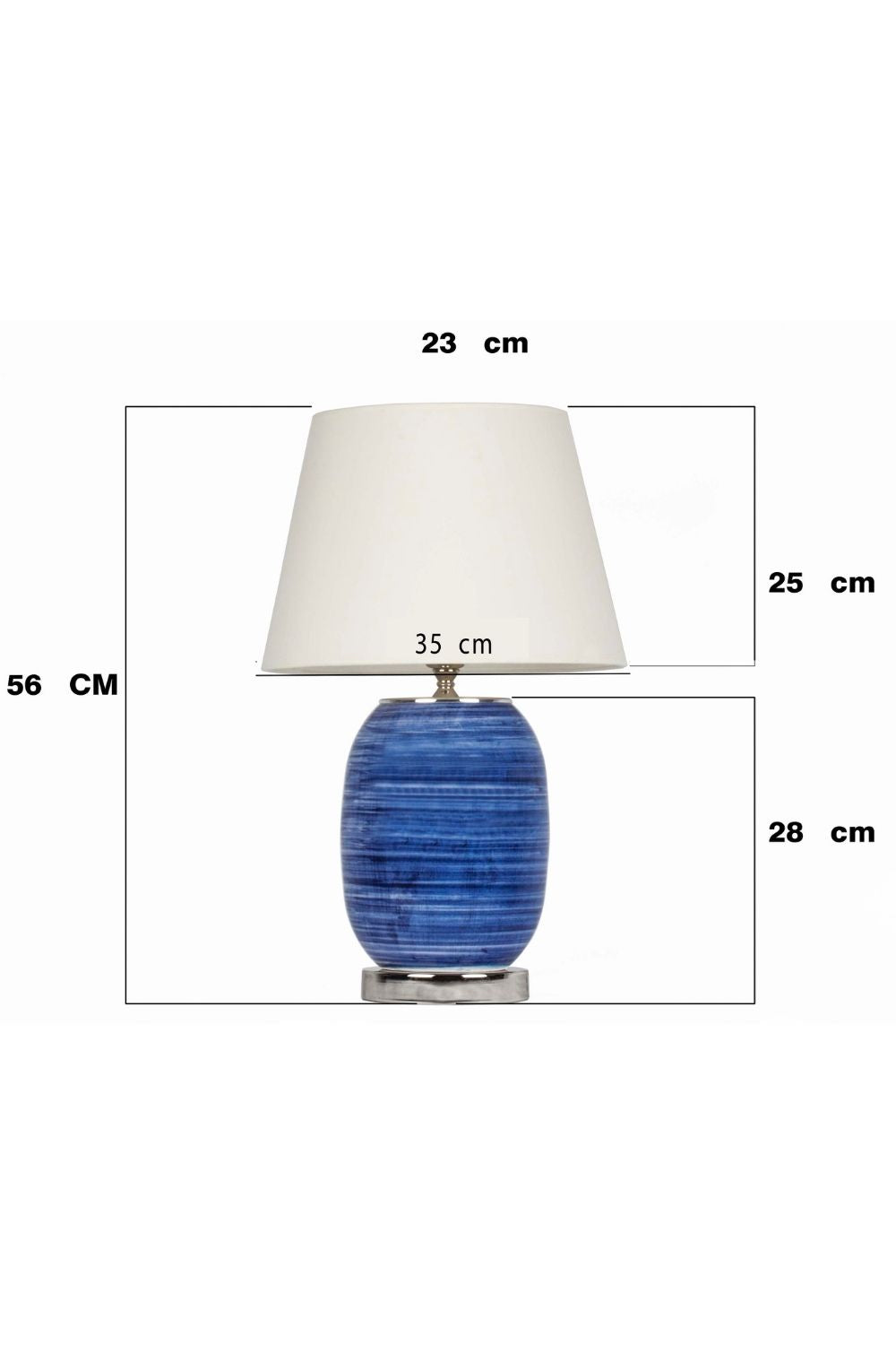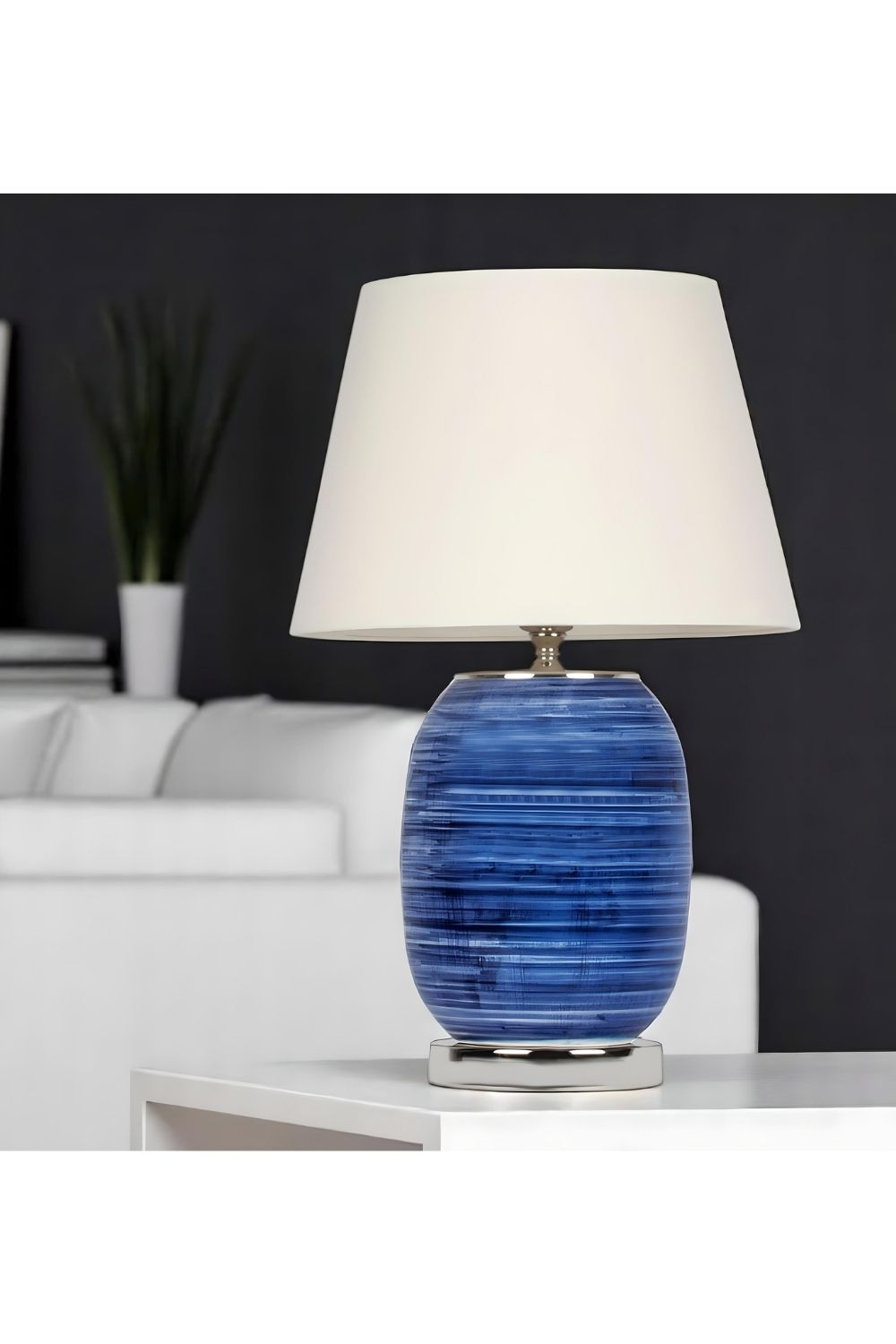 mavi tonlardaki el yapımı seramik gövdesi ve sade krem kumaş abajuru ile