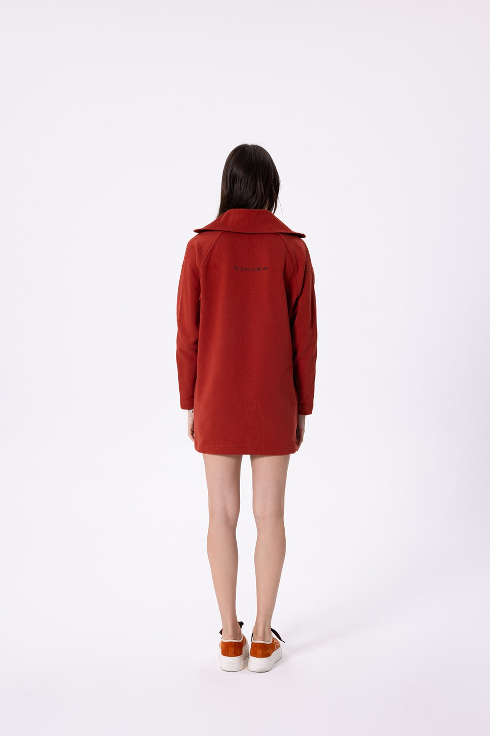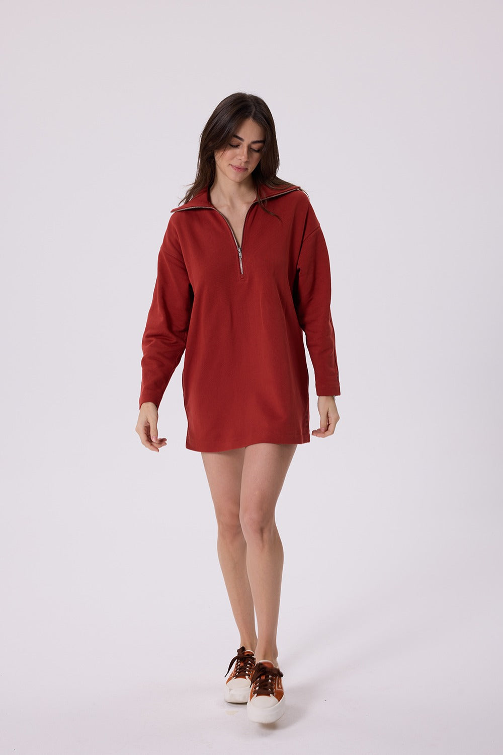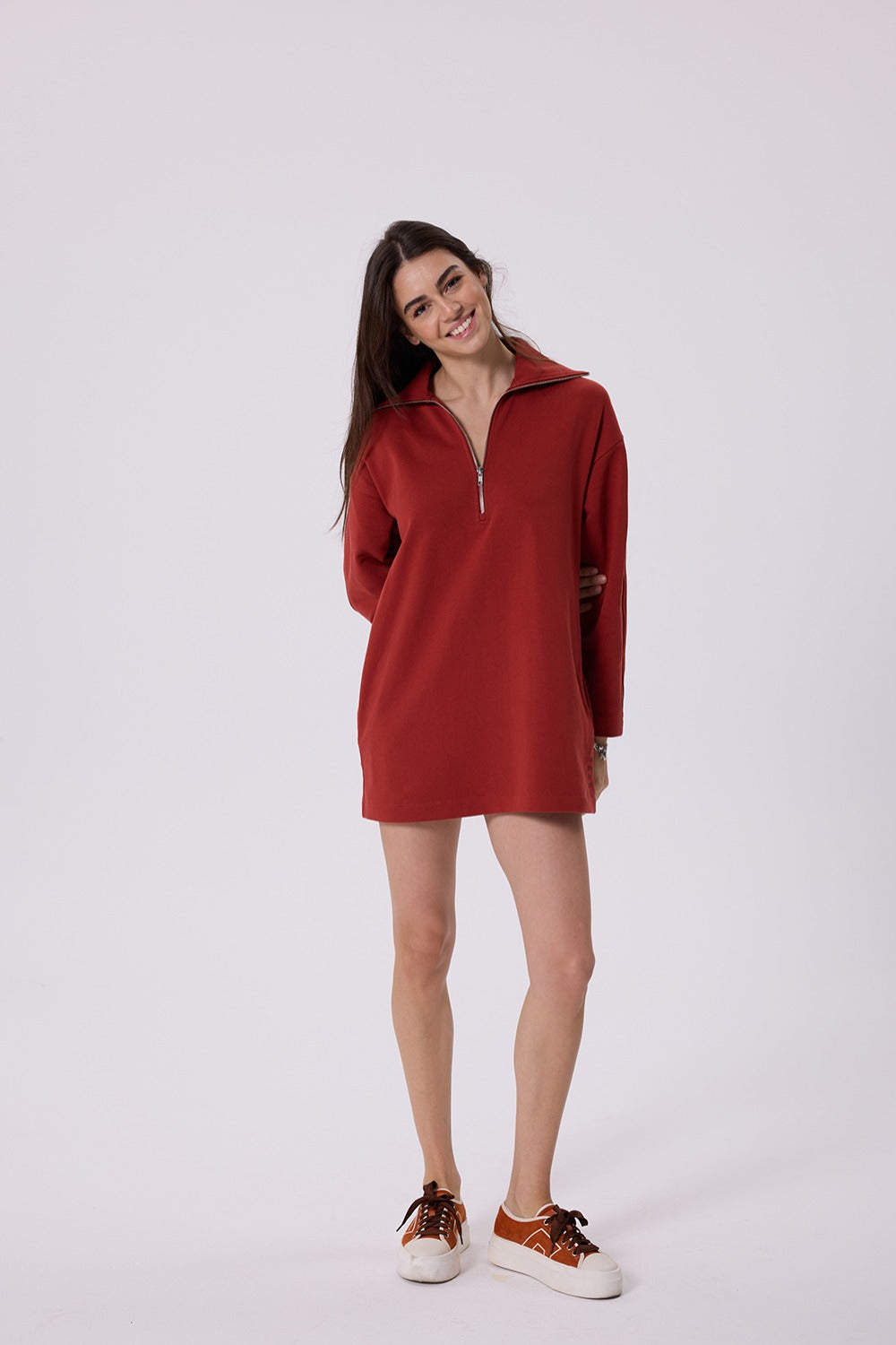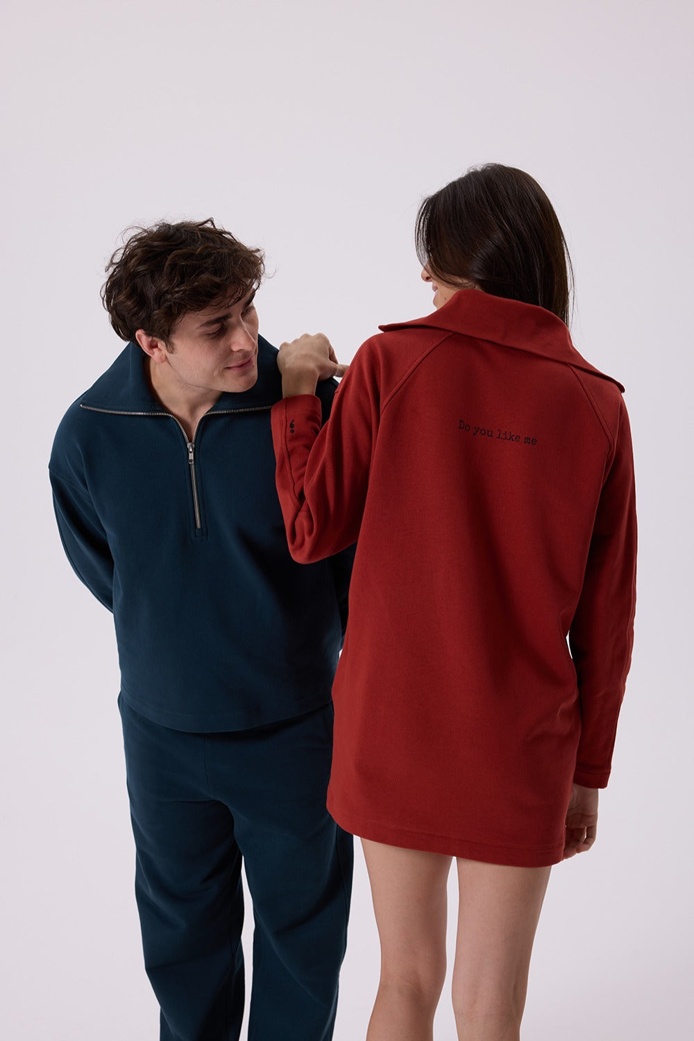 Bu mini sweatshirt elbise, sonbahar, kış ve ilkbahar için kombinlenebilecek ideal bir parça. İster soğuk ister sıcak olsun, bu acı biber yağı rengi sweatshirt elbiseyi birçok parçayla kombinleyebilir ve hem cool ve hem de rahat görünebilirsiniz. Şehirde yürüyüşe çıkmak, kahve içmek veya derse gitmek için hayalimizdeki parça. 2025'in Netflix'de en popüler dizilerinden biri olan Adolescence'in ikonik replikleri rahat kumaşımıza işlendi: "Do you like me" ve "Get the day back". İkisi de umut ve sevgiyi vurgularken kalbimize dokunuyorlar.