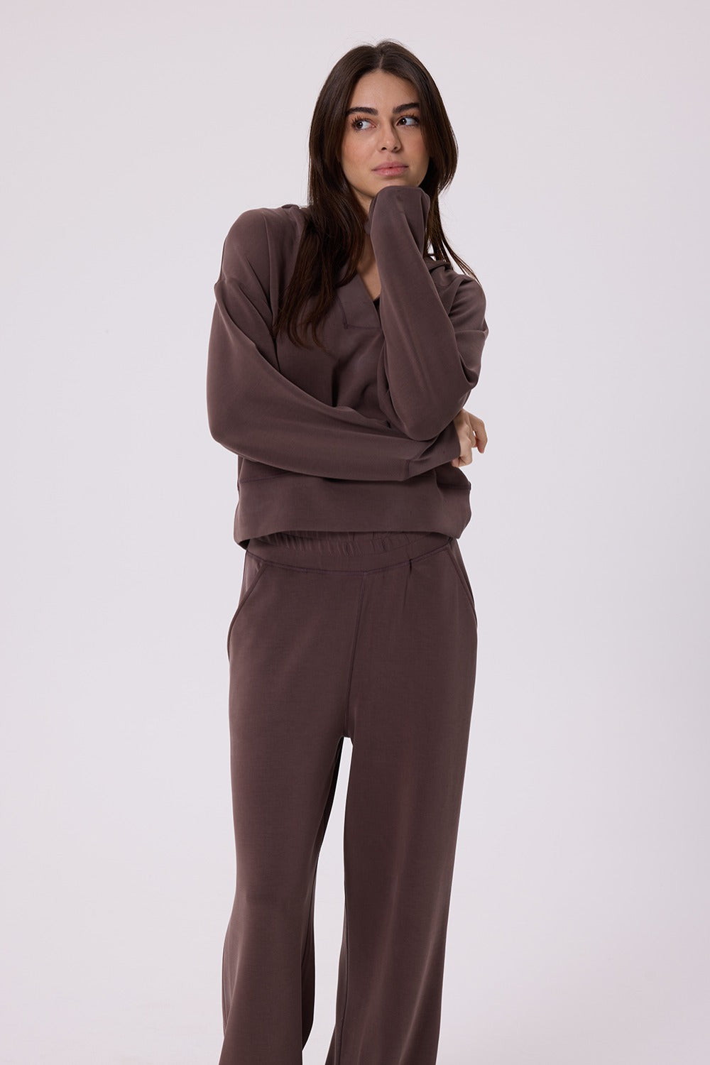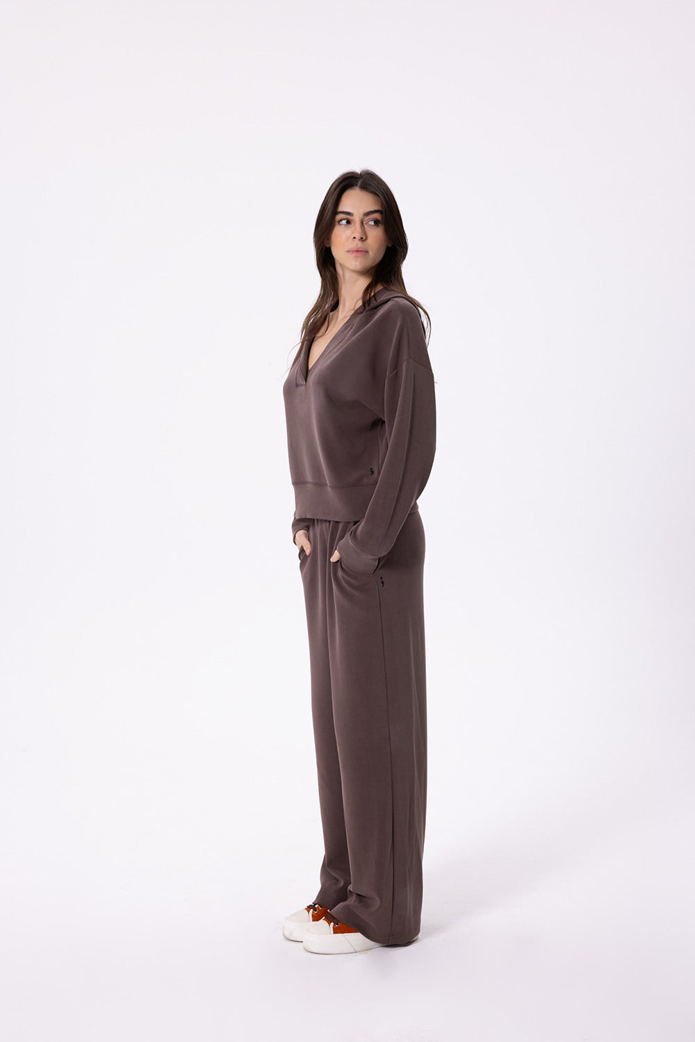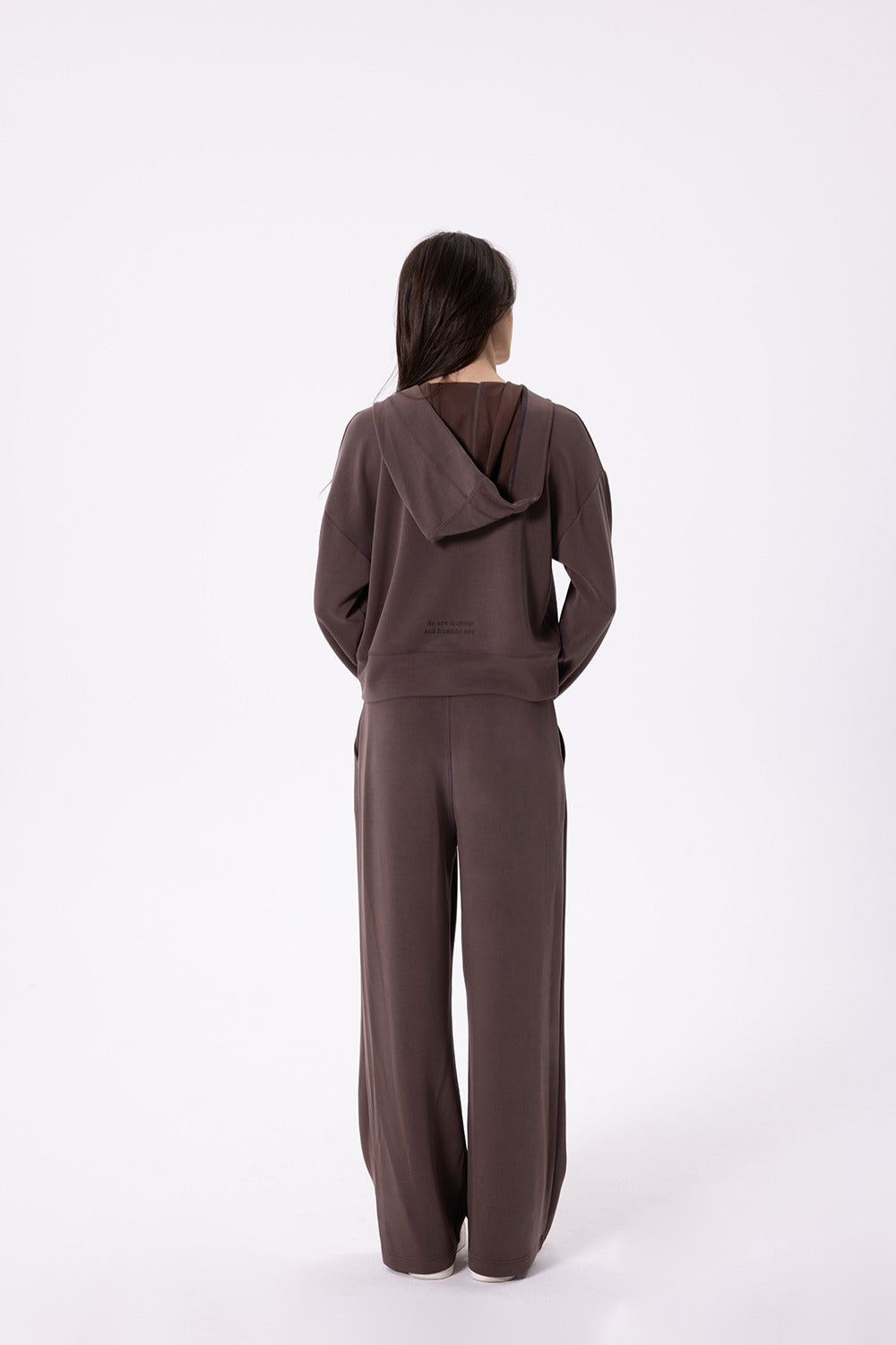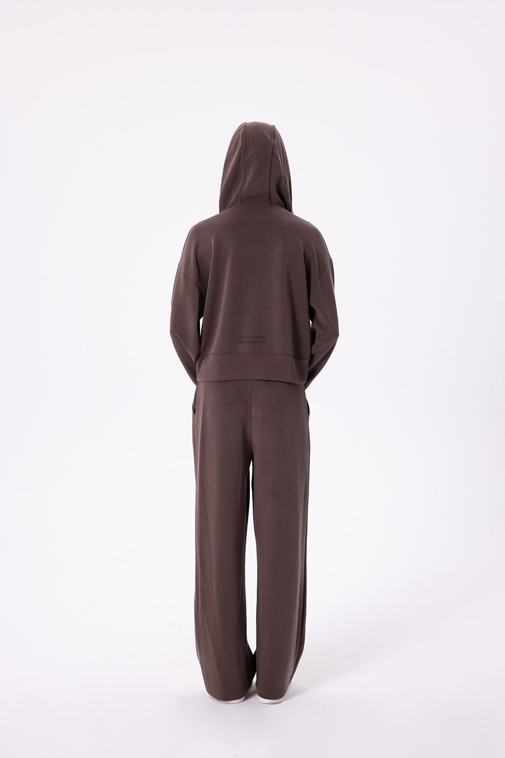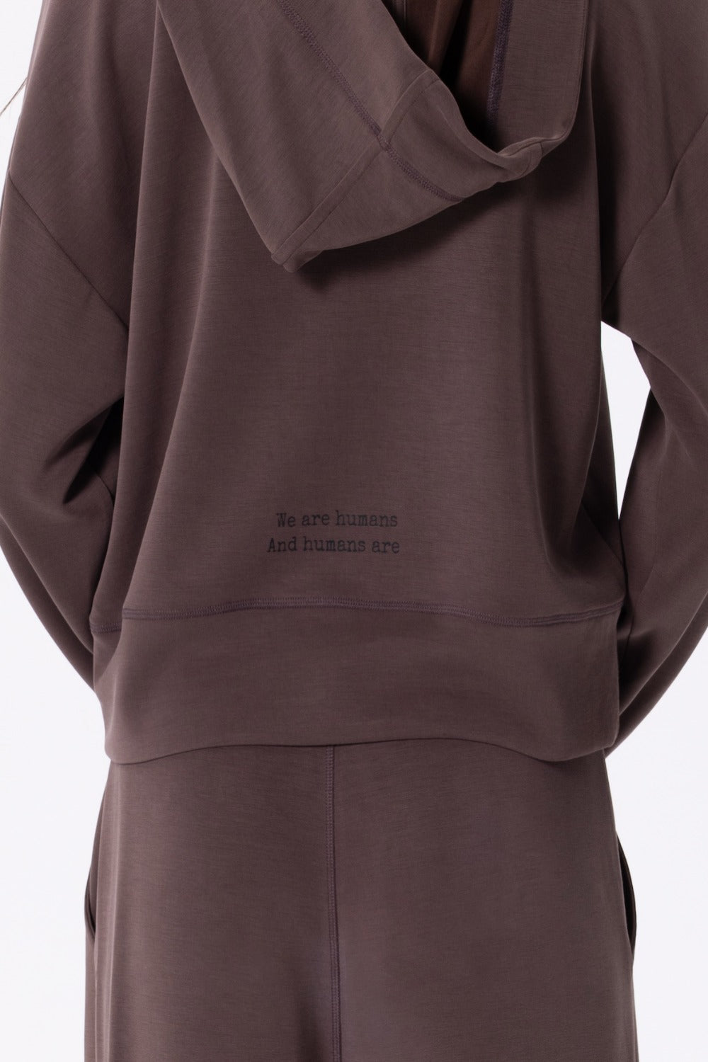 Yumuşak modal karışımından üretilen bu kapşonlu üst, ipeksi ve nefes alabilen yapısıyla üst düzey konfor sunar. Rahat ve şık kesimi ve uyumlu parçalarıyla, gün boyunca rahatça dinlenmek veya hareket etmek için idealdir. Zamansız, sade ve sakin bir görünüm için zengin Kahverengi rengi mevcuttur. Squid Game başrolun son sözleri "We are humans. And humans are" üzerine baskı yapılmıştır.