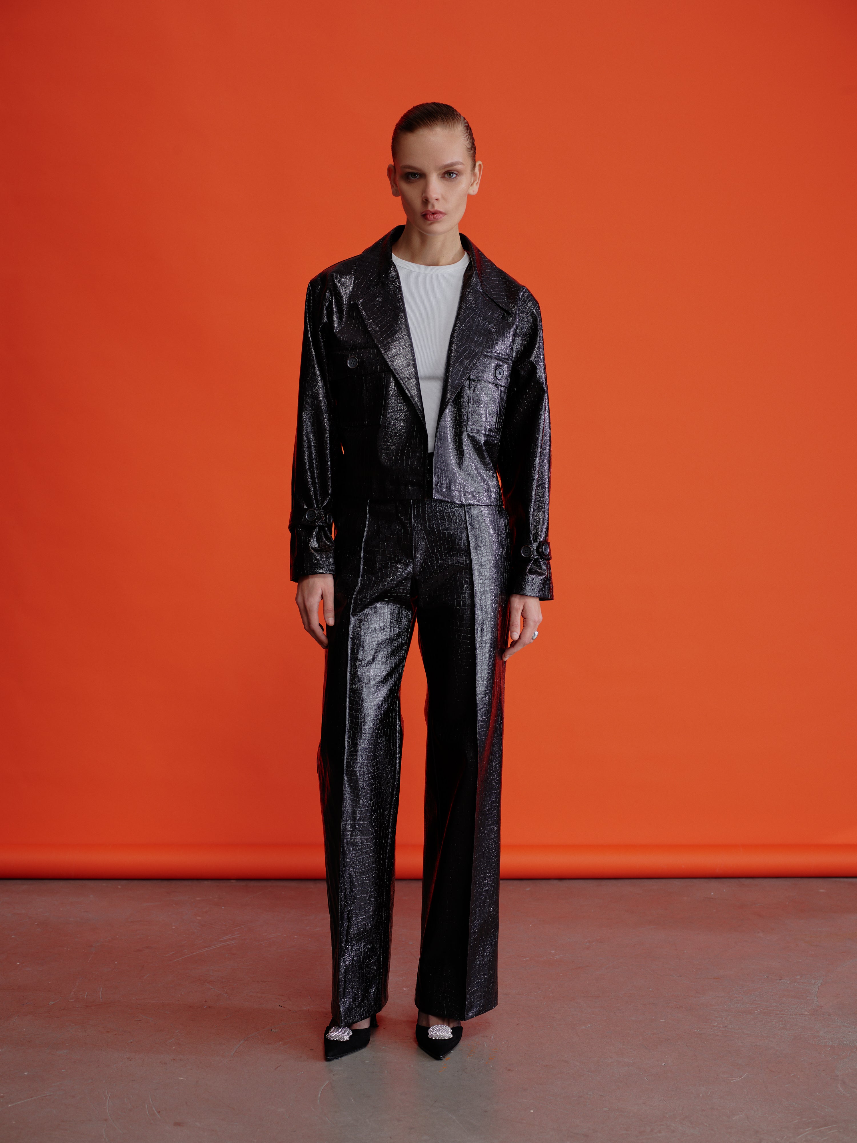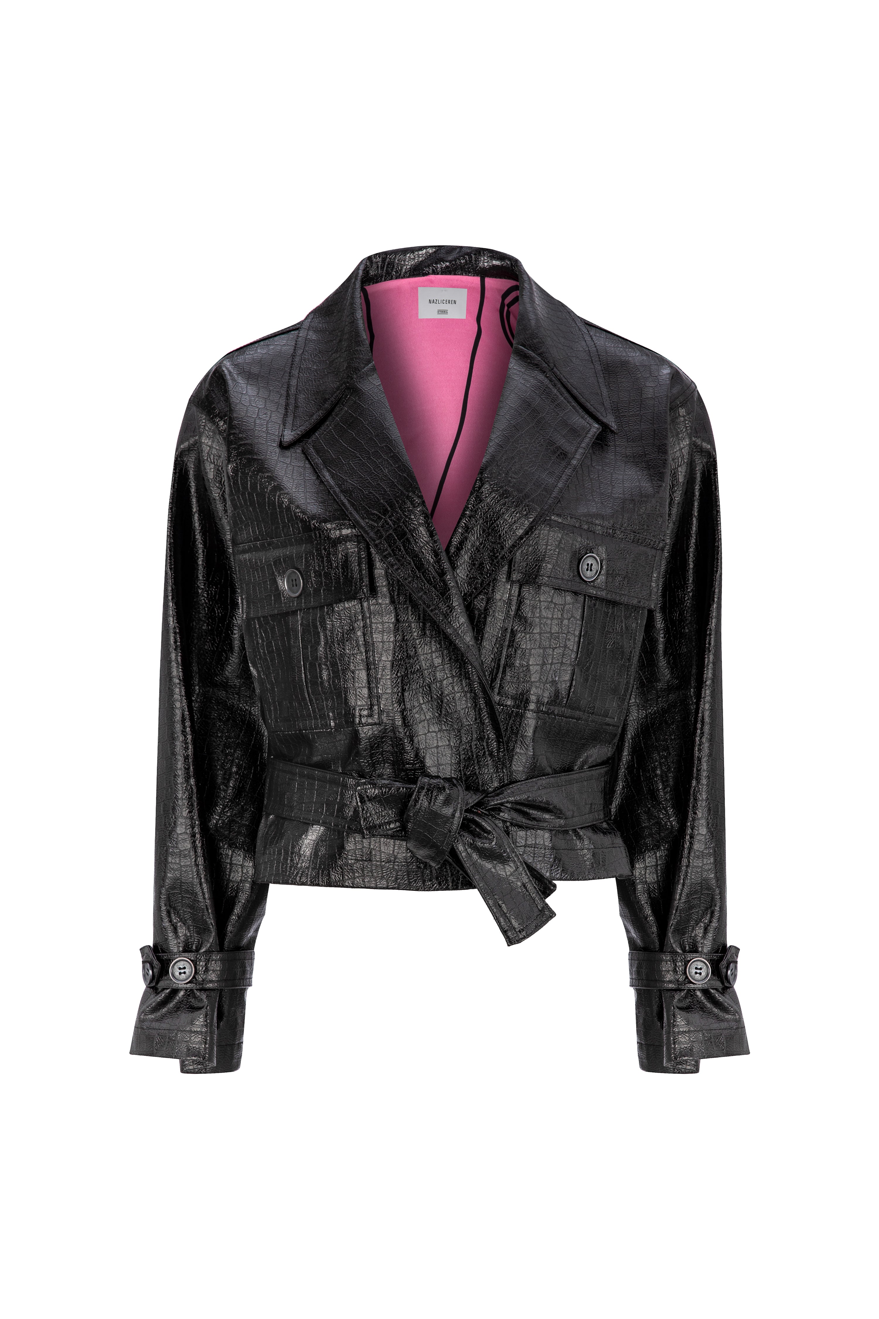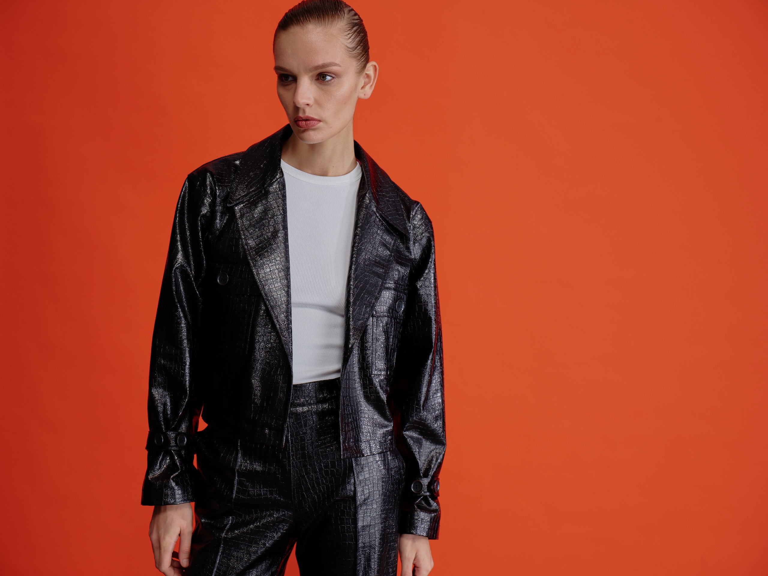 Callie Ceket, kroko efektli suni deriden üretilmiştir. Bu siyah tasarım oversize kesime, düşük omuz dikişlerine ve kapaklı ceplere sahiptir.