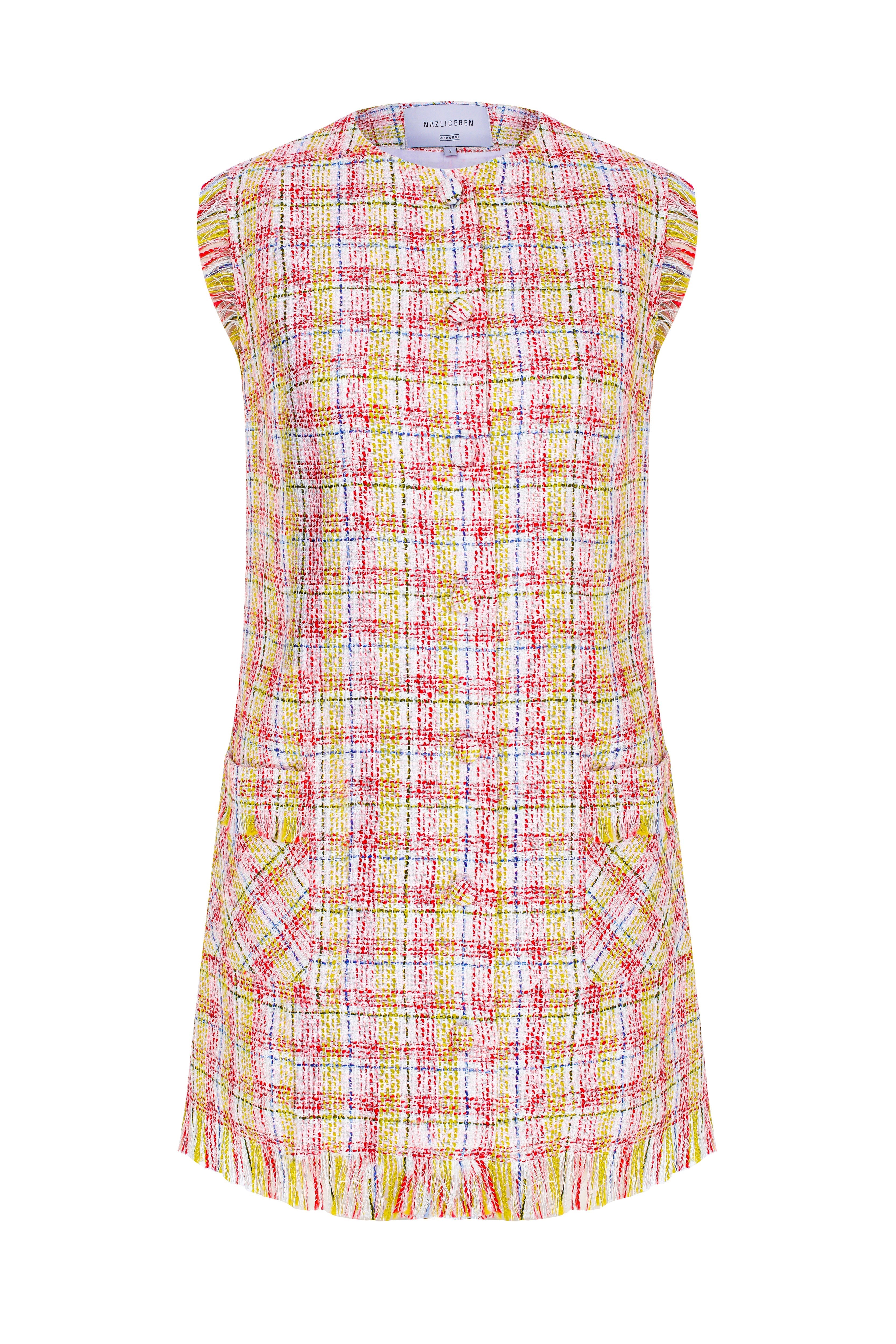 Tüvit Chloe elbise, tasarıma feminen bir yaklaşım getiriyor. Kolsuz tasarıma sahiptir ve düz bir etekle şekillendirilmiş, ardından büyük boy yamalı ceplerle tamamlanmıştır. Son dokunuş olarak kenarlardaki ham kenarlı tüvit süslemelerle tamamlanmıştır. Zarif bir gündüz görünümünün parçası olarak katmanlı takılar ve düz ayakkabılarla basitçe stilize edin.
