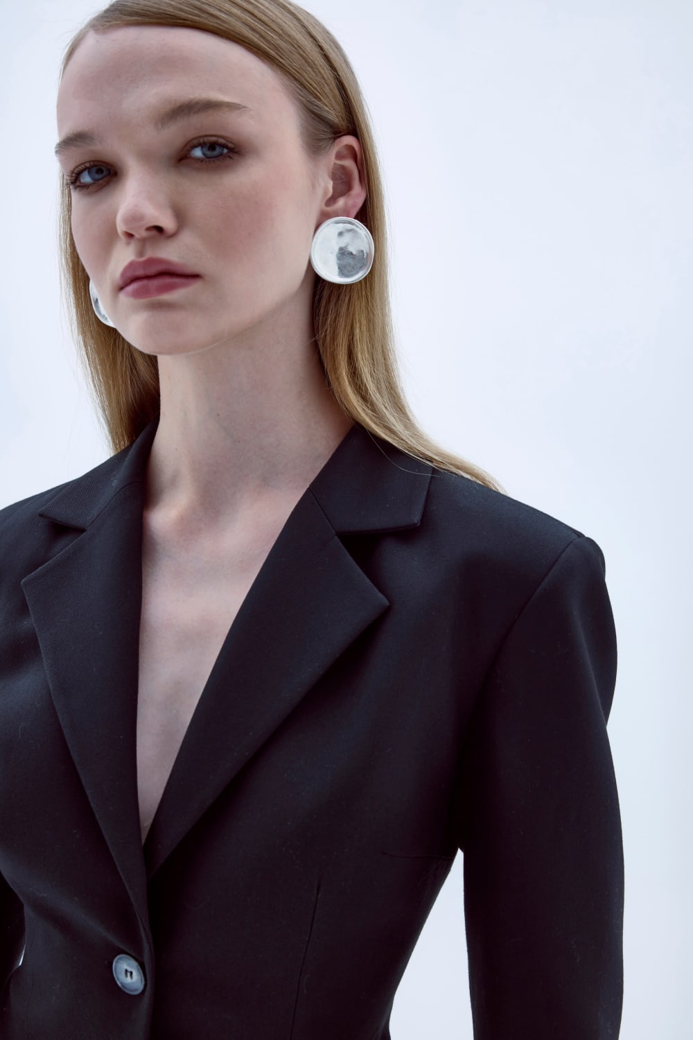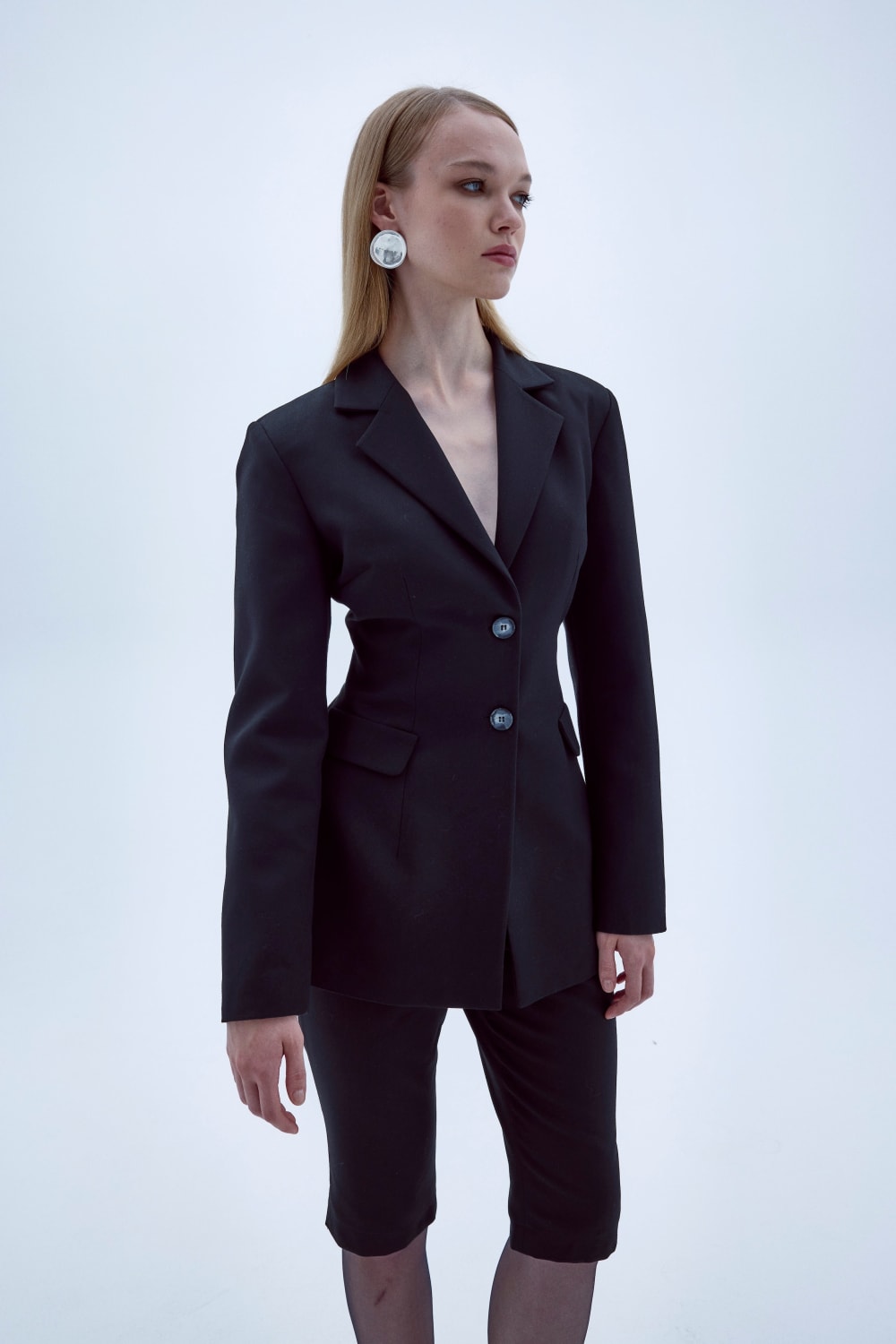 Marylebone Fitted Ceket, mükemmel bir şekilde tasarlanmış, bele oturan ve yastıklı omuzlara sahip cesur, güçlü bir görünüm sunan bir parçadır. Siyah pamuk kumaştan üretilen bu şık ceket, sofistike ve güçlü bir hava taşır. Arced Pantolonlar veya Millie Pantolonlar ile zahmetsizce bir araya getirerek modern ve zarif bir takım oluşturabilirsiniz.