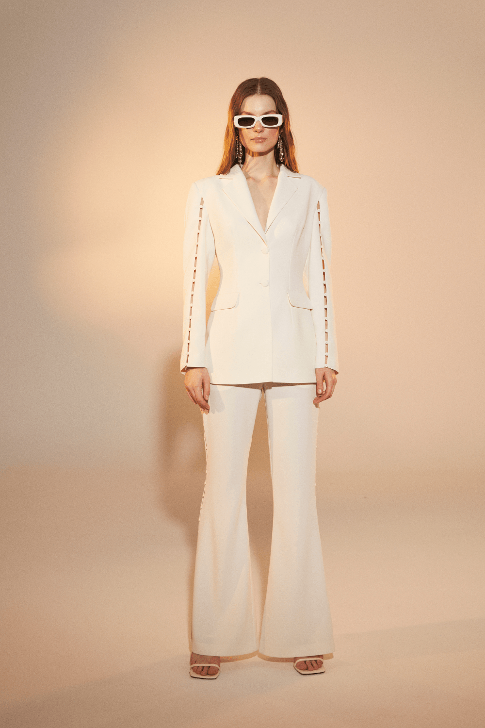 Marylebon Krep Ceket, kollarda düğme detaylarıyla sıradışı bir görünüm sunar. Beyaz krep kumaşıyla şıklığı ve zarafeti bir araya getiren, yüksek işçiliği ile de göz dolduran bu ceket Bele oturan tasarımıyla vücudu kusursuz bir şekilde sarar. Düğün, nikah, özel etkinlikler veya kokteyl partileri gibi her türlü etkinlik için ideal bir seçimdir. Stilinizi tamamlamak için Marylebon Pantolon ile kombinleyebilirsiniz.