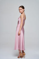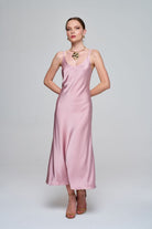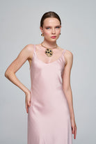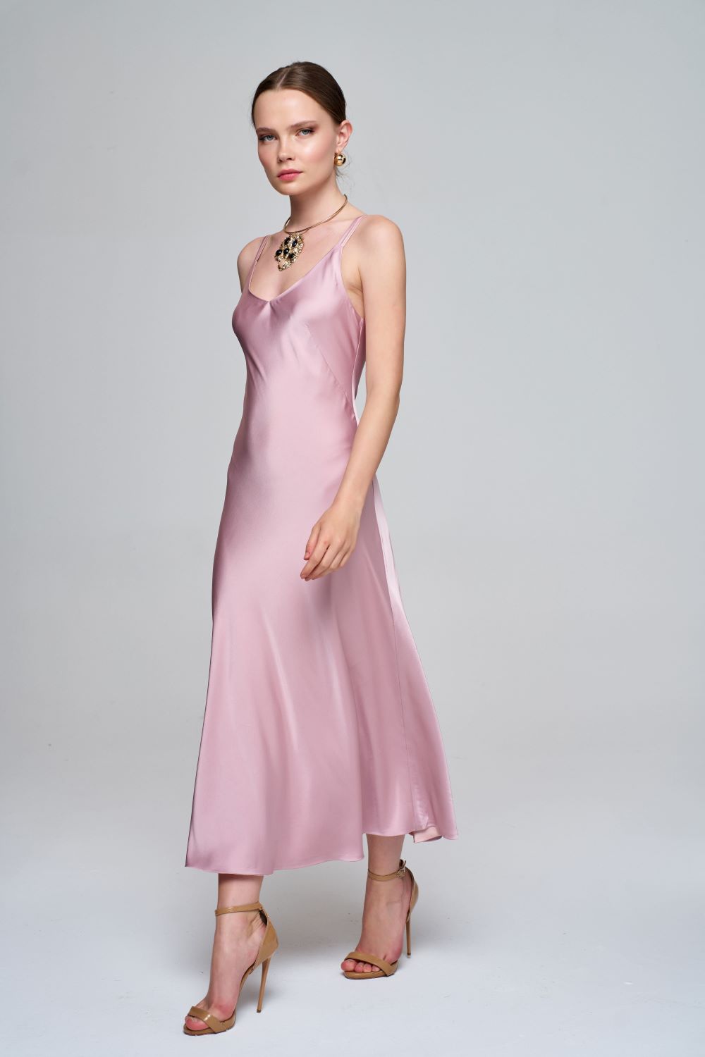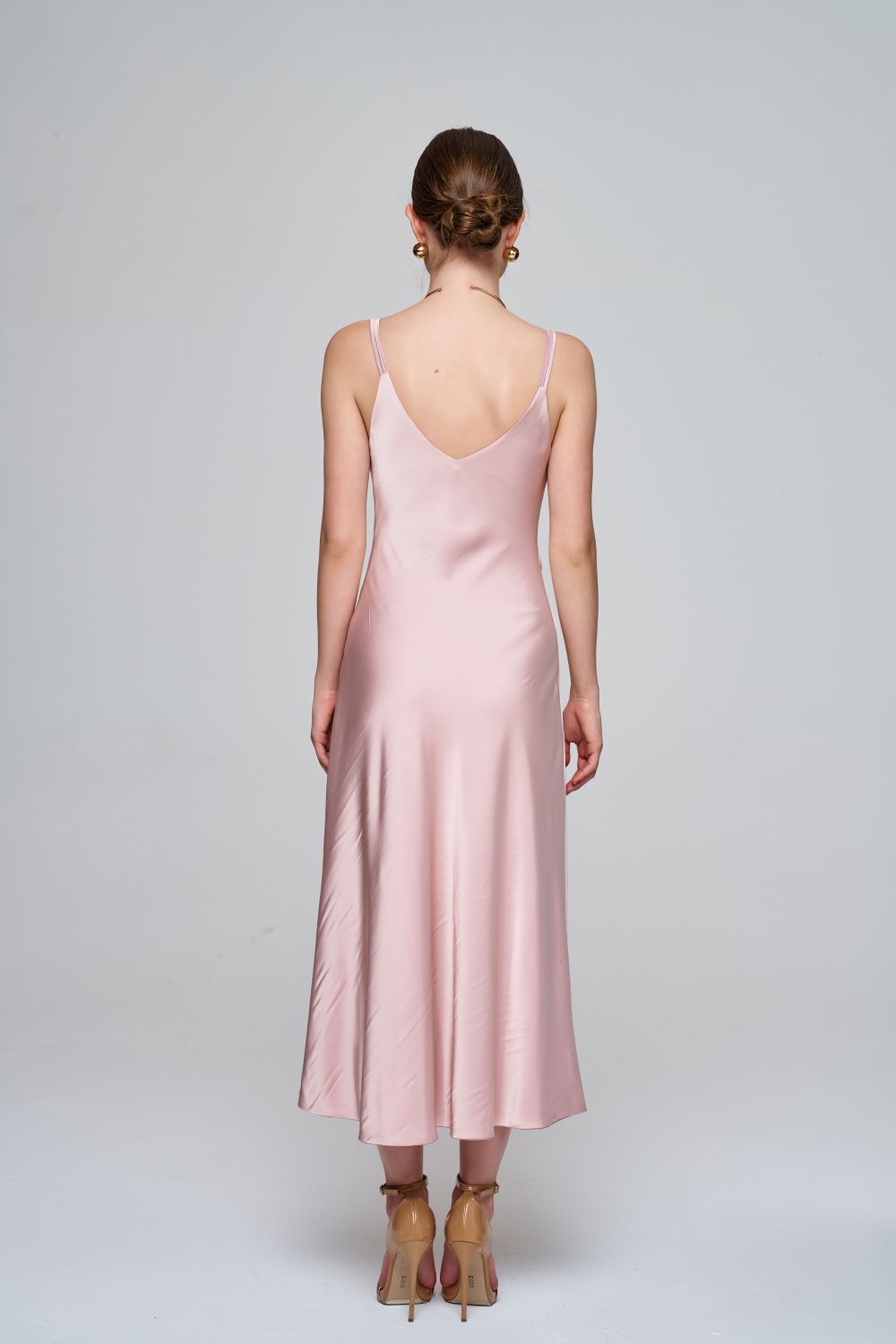 Çift taraflı ipeksi mat saten yumuşak, dökümlü v yaka çift askılı saten elbise.
