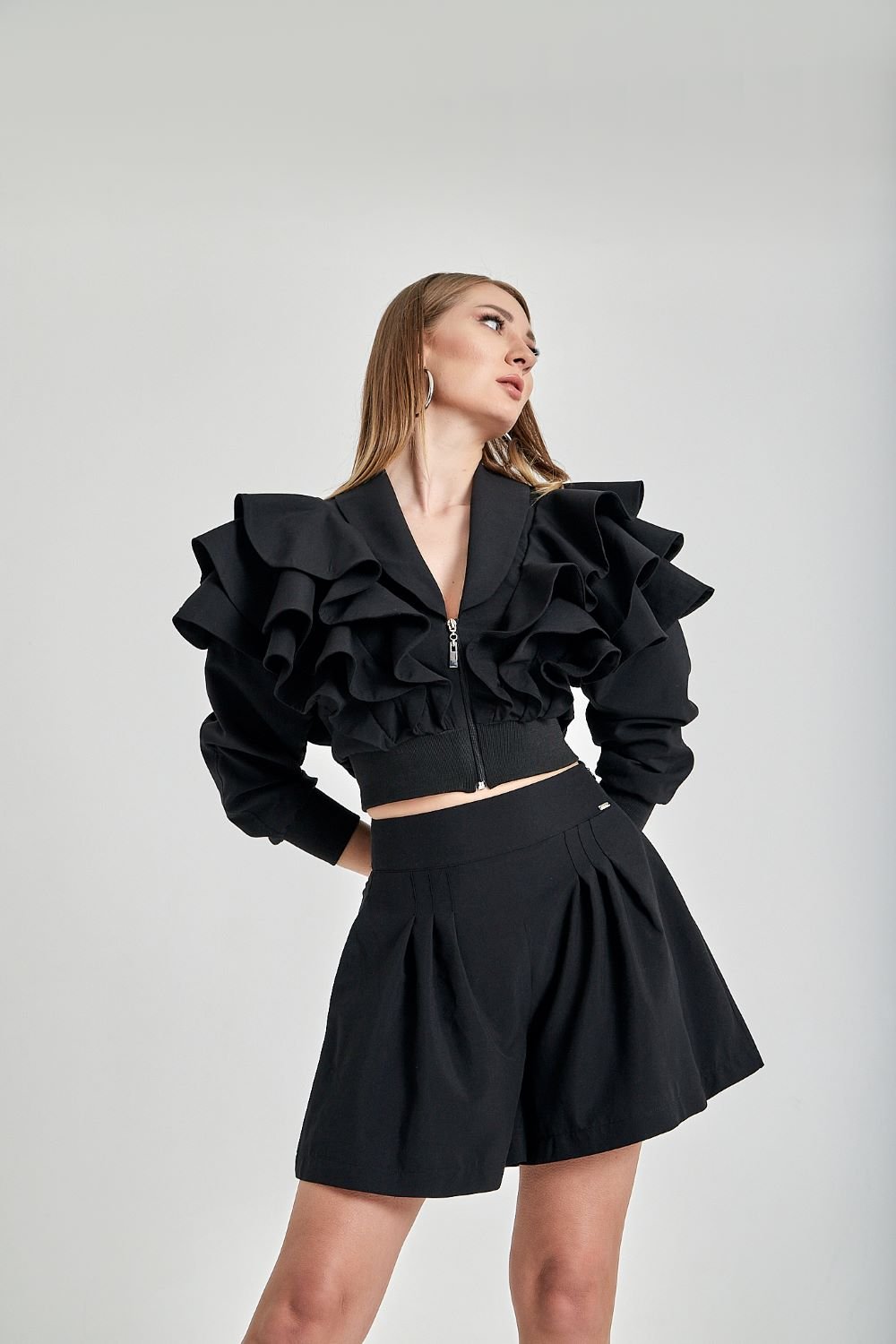 Yandan fermuar kapamalı kısa geniş paçalı şort. Manken 36 bedendir. Göğüs ölçüsü 84 cm, bel 66 cm, basen 100 cm dir. Boy uzunluğu 178 cm’dir. Kol boyu 61 cm, belden bacak boyu 110 cm’dir.