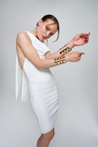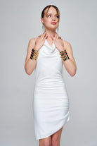 Asimetrik etek ucu ile arkadan bağlama detaylı degaje yaka krep mini elbise.
