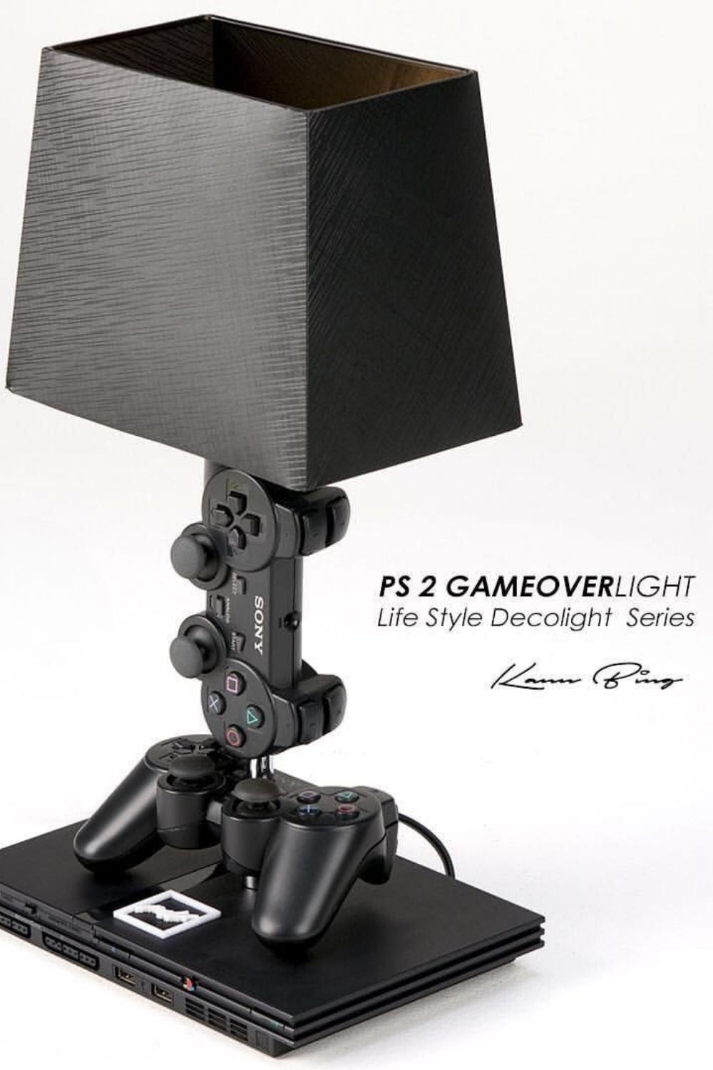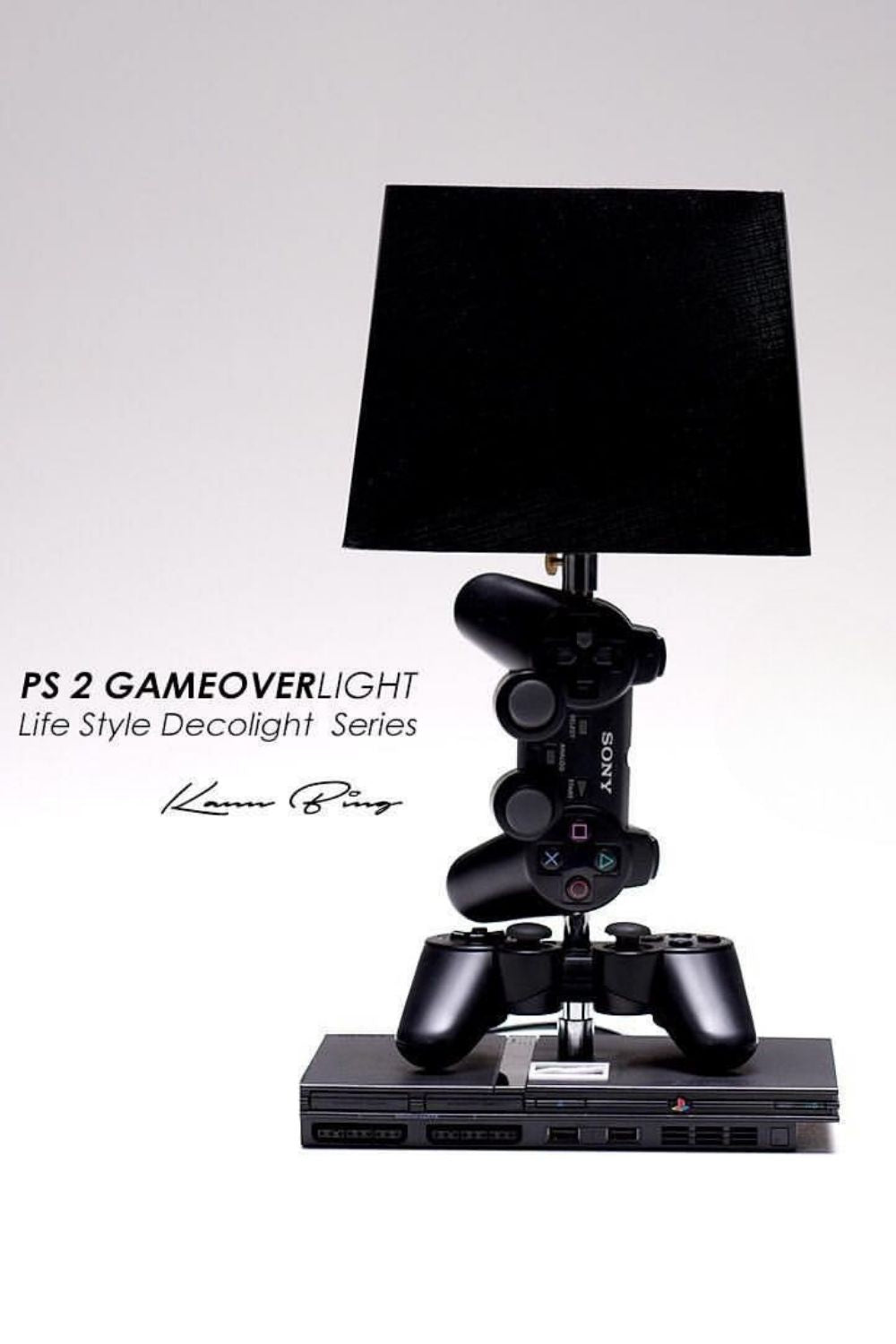 PS2 Game Over Light, ikonik PlayStation 2 konsolu ve orijinal DualShock kollar kullanılarak tasarlanmış sıra dışı bir masa lambasıdır.Kumandalar üst üste dizilerek lambanın gövdesini oluştururken, mat siyah abajur bu dijital heykeli tamamlar.Hem retro oyun tutkunları hem de yaratıcı dekorasyon sevenler için ideal bir koleksiyon objesi.Oyun kültürünü yaşayan ve yaşatanlar için özel olarak tasarlandı.