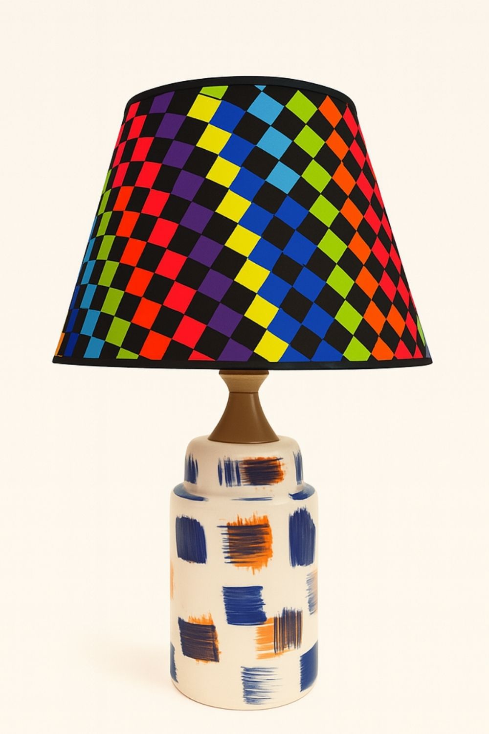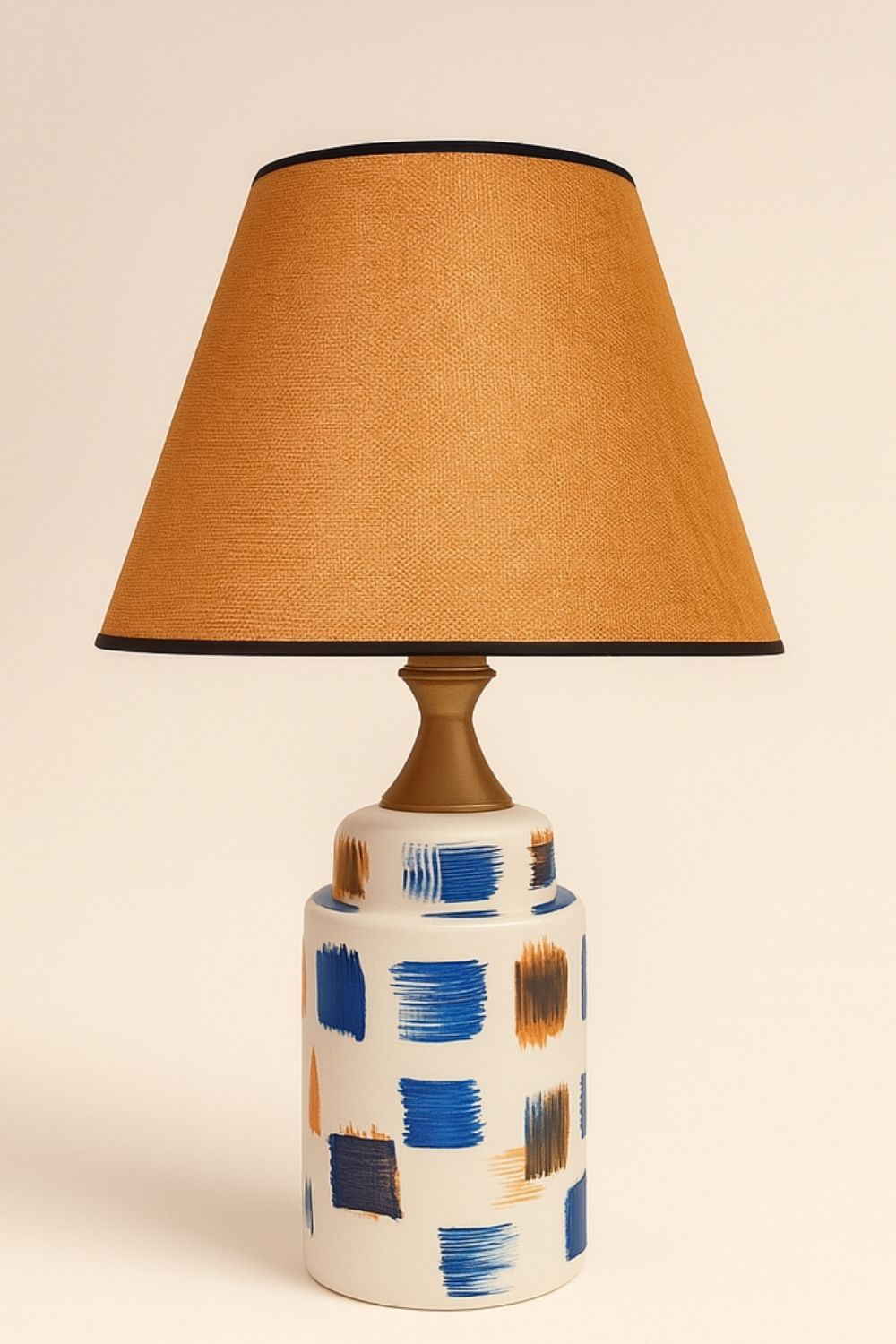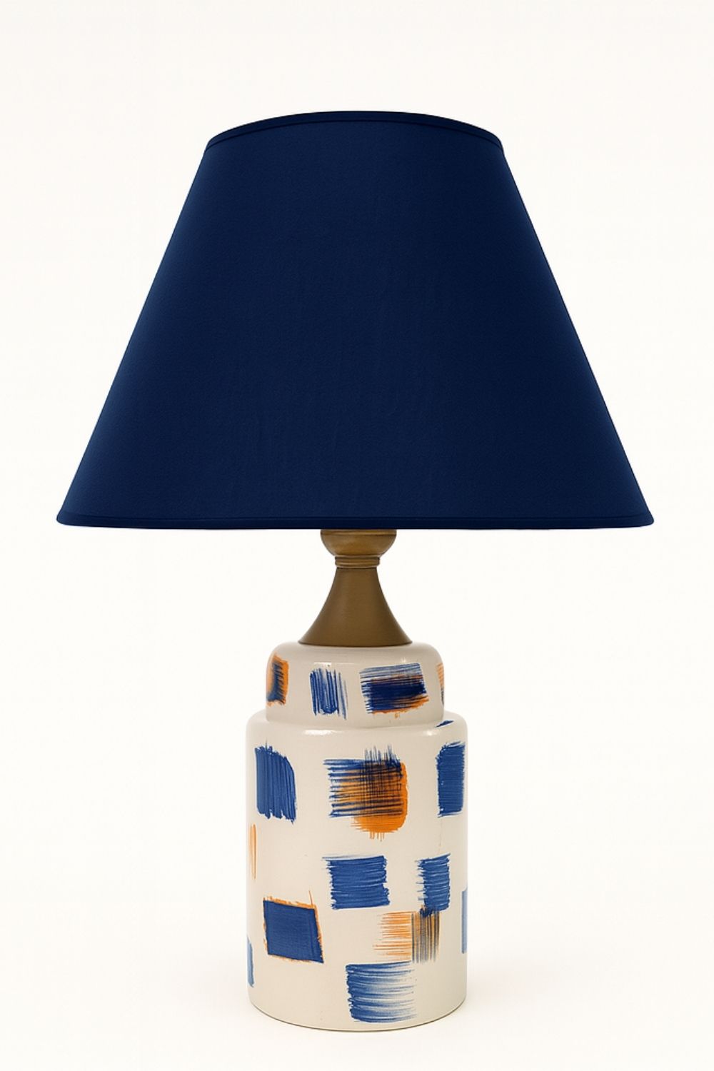 Punto Abajur, seramik yüzeyine serbest fırça darbeleriyle uygulanmış mavi, turuncu ve lacivert tonlardaki soyut desenleriyle dikkat çeker. Her biri farklı yönlerde yerleştirilmiş renk blokları, ürüne ritmik bir hareket ve özgün bir karakter kazandırır.