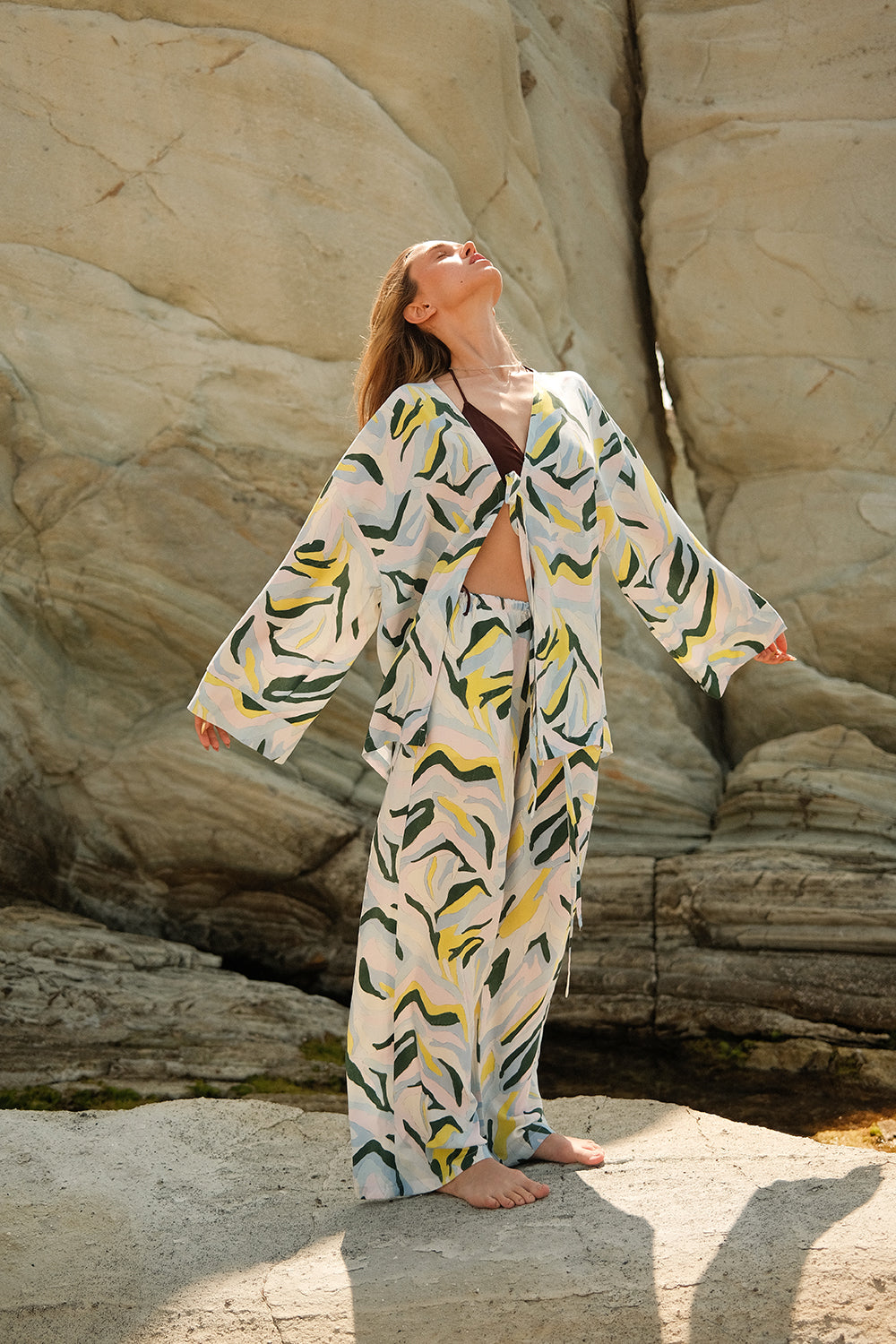 FLOW Kimono, rahat ve şık tasarımıyla gardırobunuzun yeni favorisi olacak. Geniş, ferah kesimi ve önden iki bağlaması sayesinde farklı kullanım stillerine uyum sağlar. Hafif ve nefes alabilen TENCEL™ kumaşıyla yaz boyunca konfor sunar.